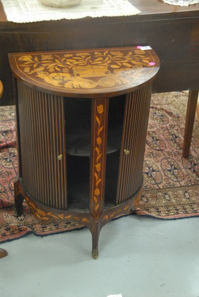 Marquetry inlaid cabinet, half round with tambour doors, ht. 28in. wd. 20in.