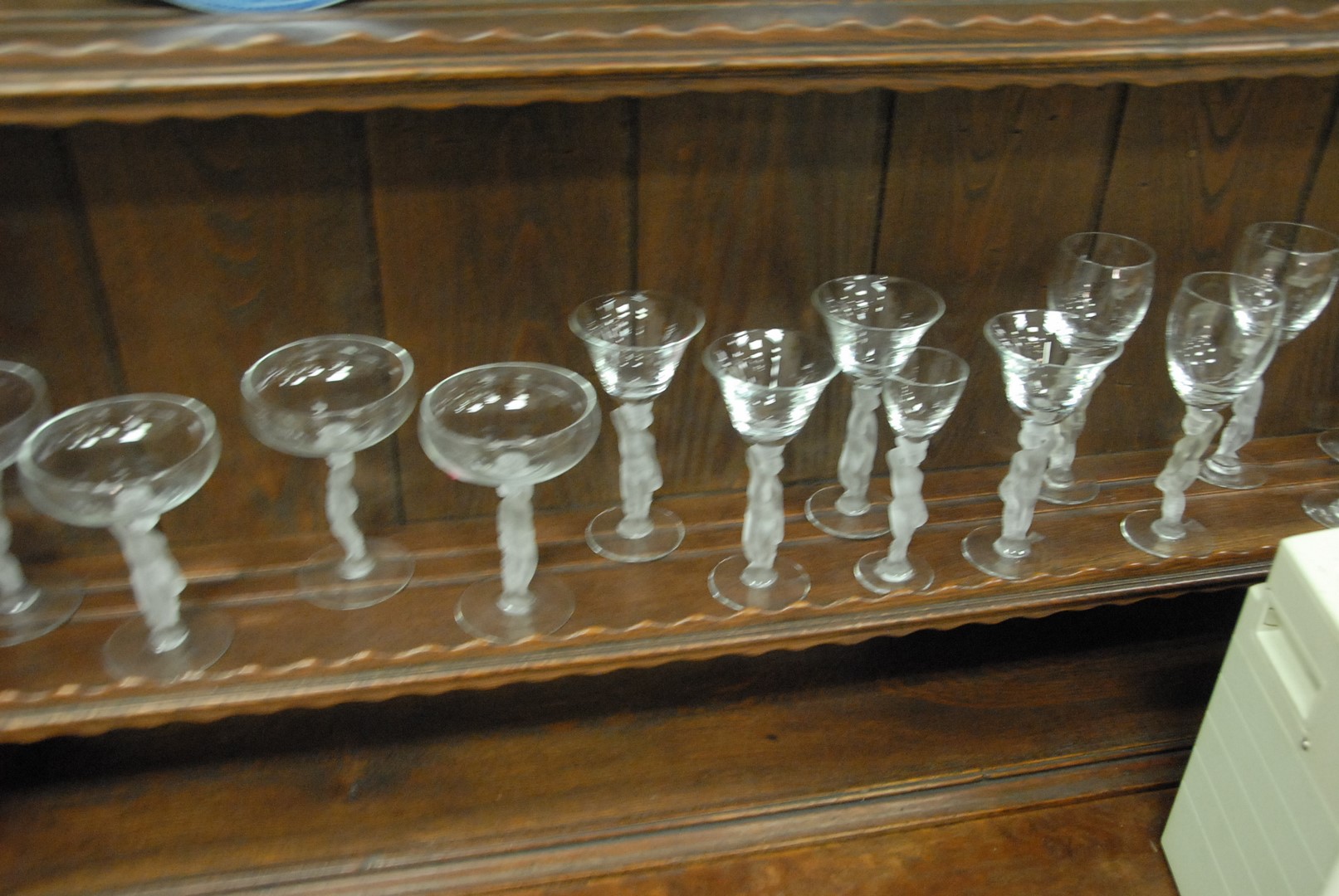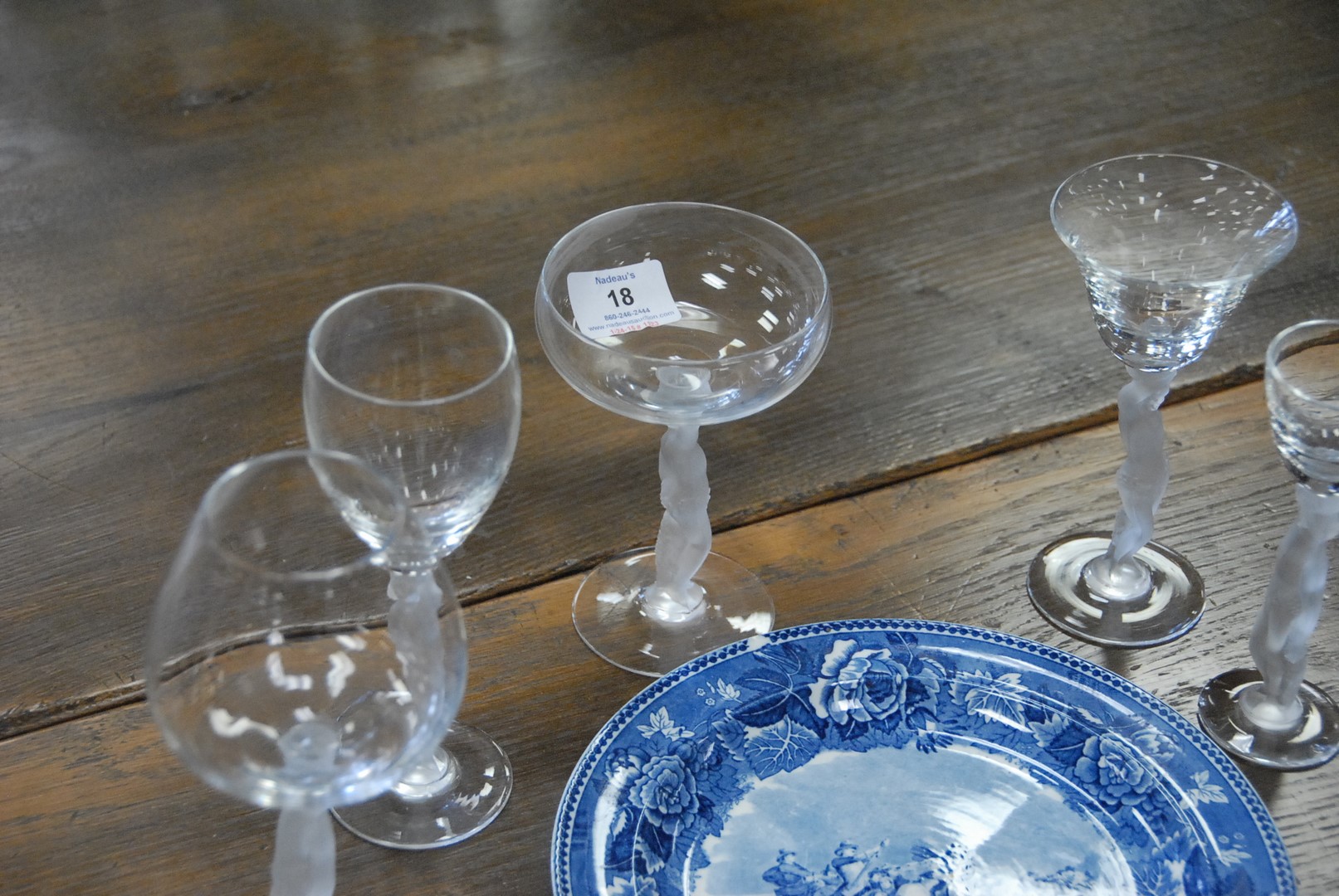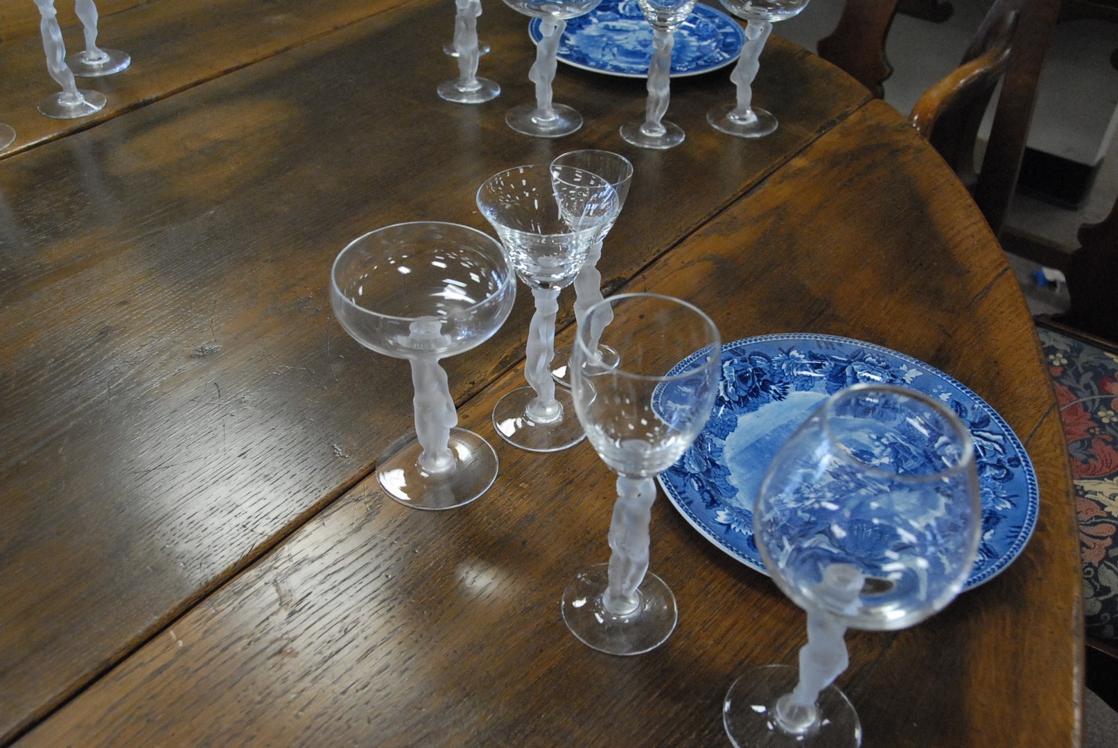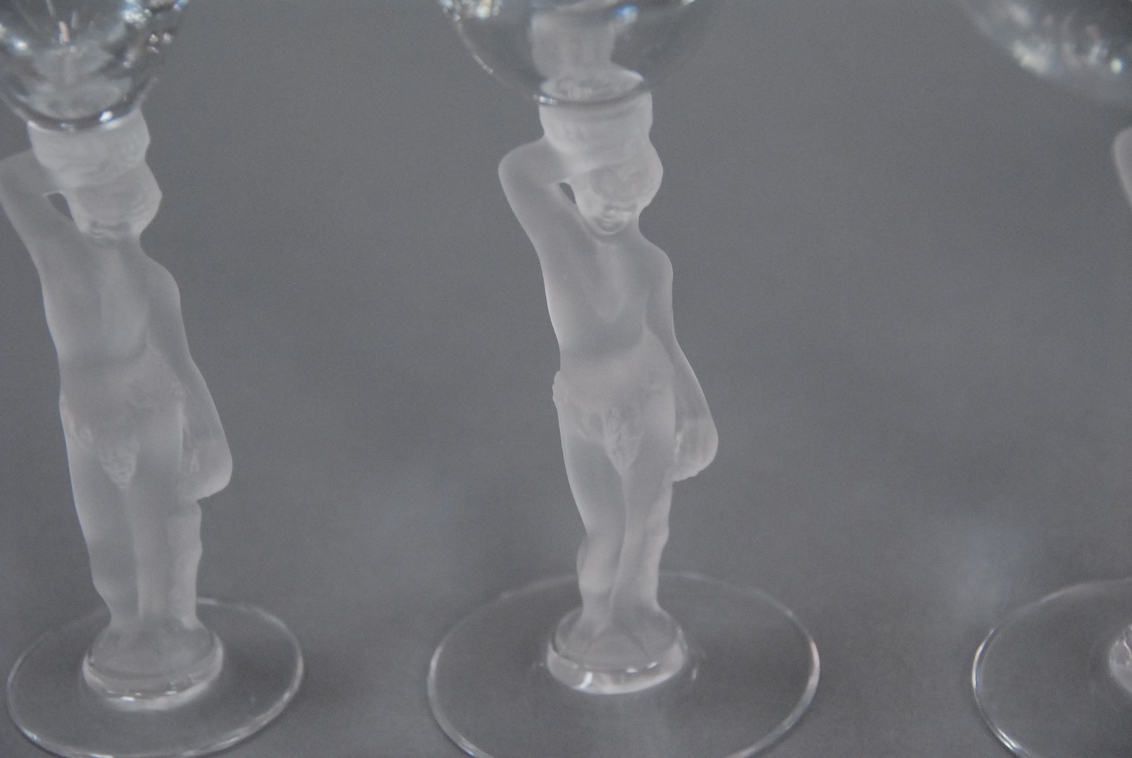 Set of crystal with frosted figural stems, 45 total pieces. hts. 5 3/4 to 7 3/4