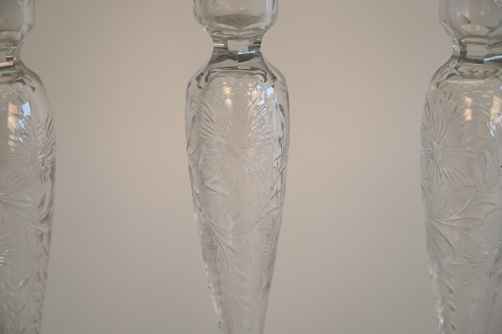 Set of Three Matching Hawkes Cut Glass Candlesticks, height 12 inches.