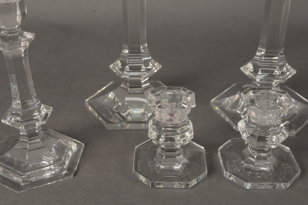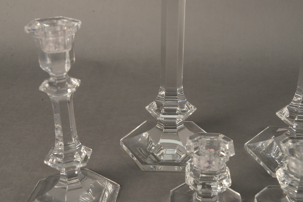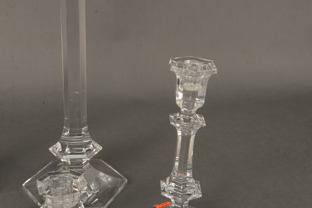 Lot 18: Six Piece Clear Glass Lot, to include a pair of Val St. Lambert candlesticks, along with two pairs of Baccarat candlesticks, tallest…