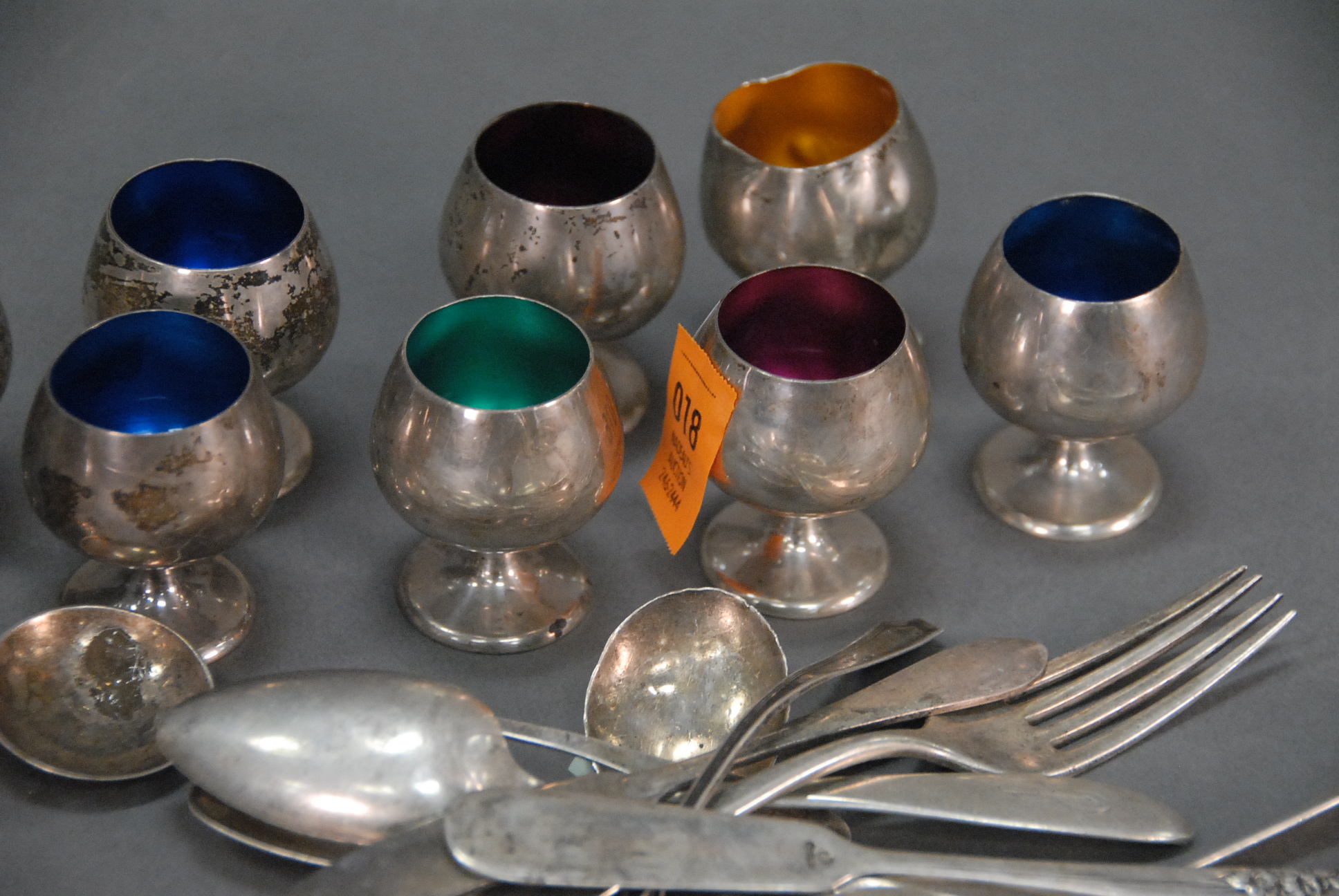 Sterling silver lot of cordials with enameled interior and spoons and forks, 15.9 t oz.
