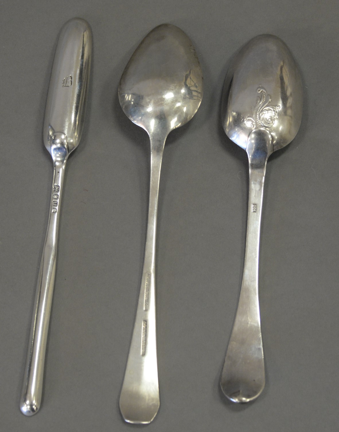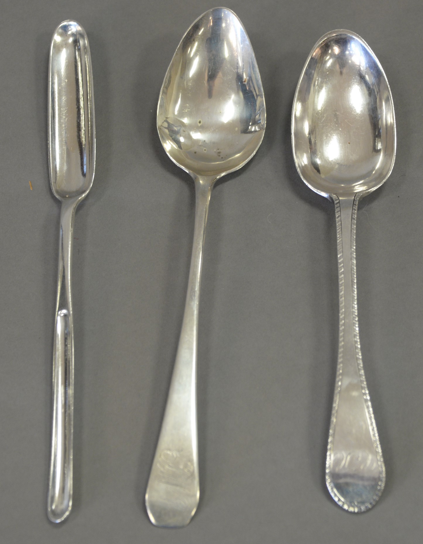 Three piece lot of early silver including American spoon marked DM, an American coffin end spoon marked J. Sargeant Hartford, and an English marrow spoon.