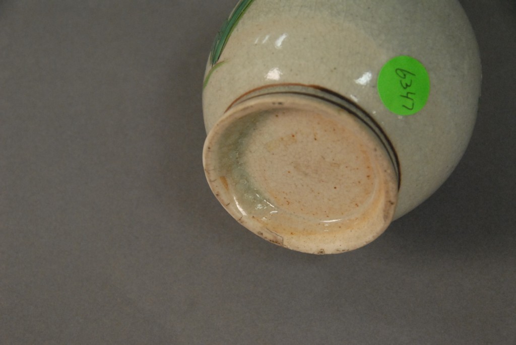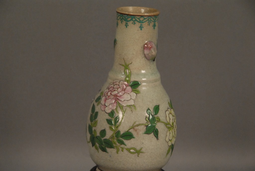 Three piece lot Satsuma crackle glazed deep circular dish with painted men in the center, ht. 3, dia. 14 and a pair of crackle glazed peach vases having painted wild flowers and raised peach handles on wood bases, ht. with bases 10.