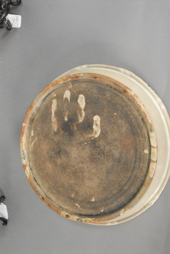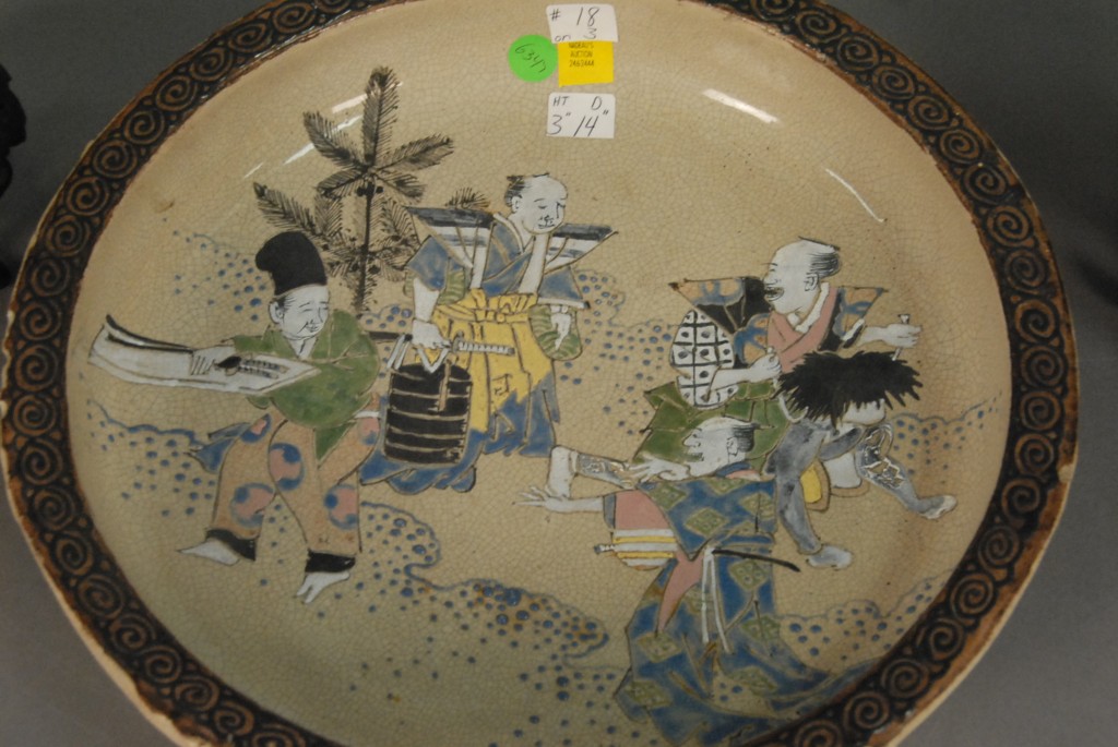 Lot 18: Three piece lot Satsuma crackle glazed deep circular dish with painted men in the center, ht. 3, dia. 14 and a pair of crackle gl…