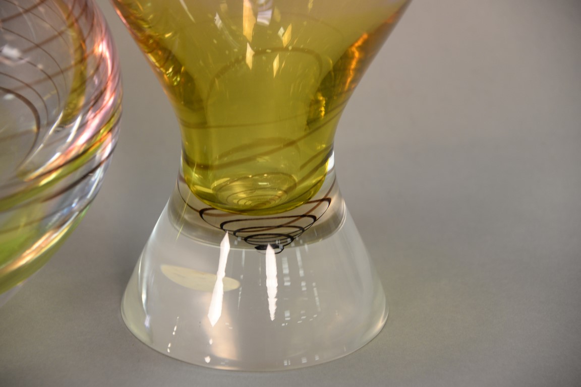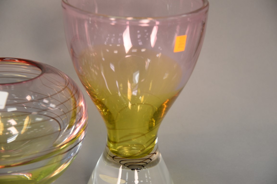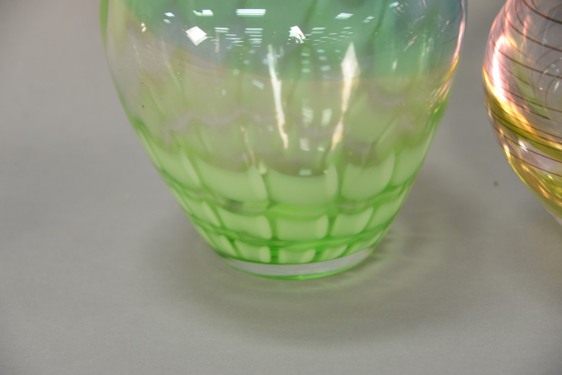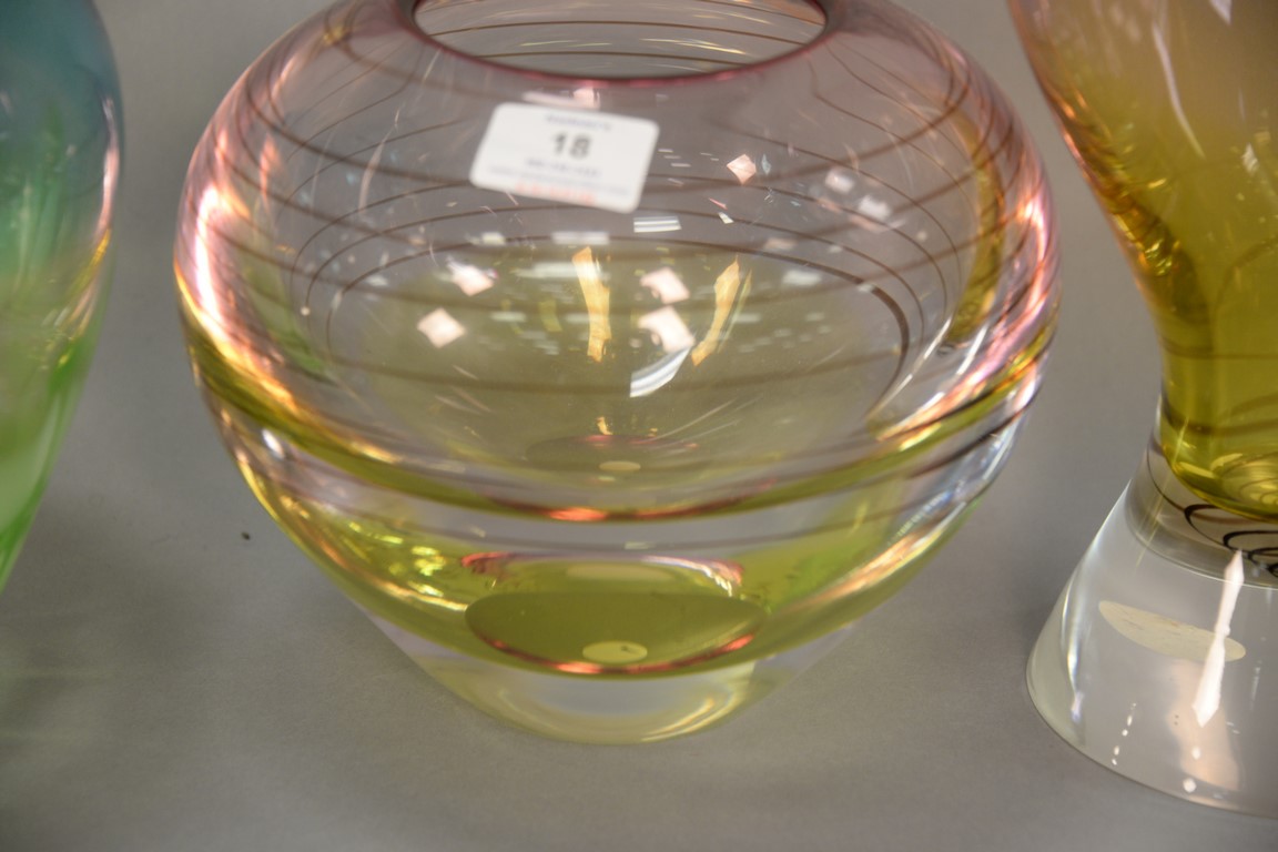 Lot 18: Three piece lot to include two Waterford Evolution crystal vases, both heavy glass swirl design and a blue to green tall vase. ht. 8…