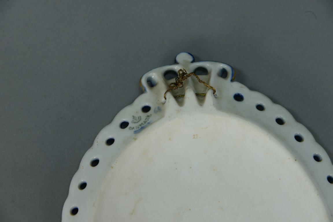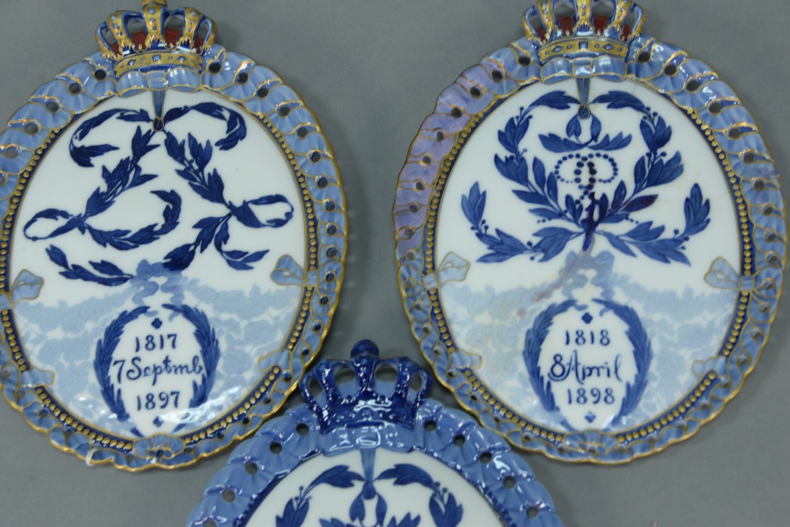 Three Royal Copenhagen porcelain oval plaques, one commemorating the 80th Birthday of Queen Louise 1817-1897 and the other two commemorating the 80th Birthday of King Christian, all three plaques with openwork border and crown tops.