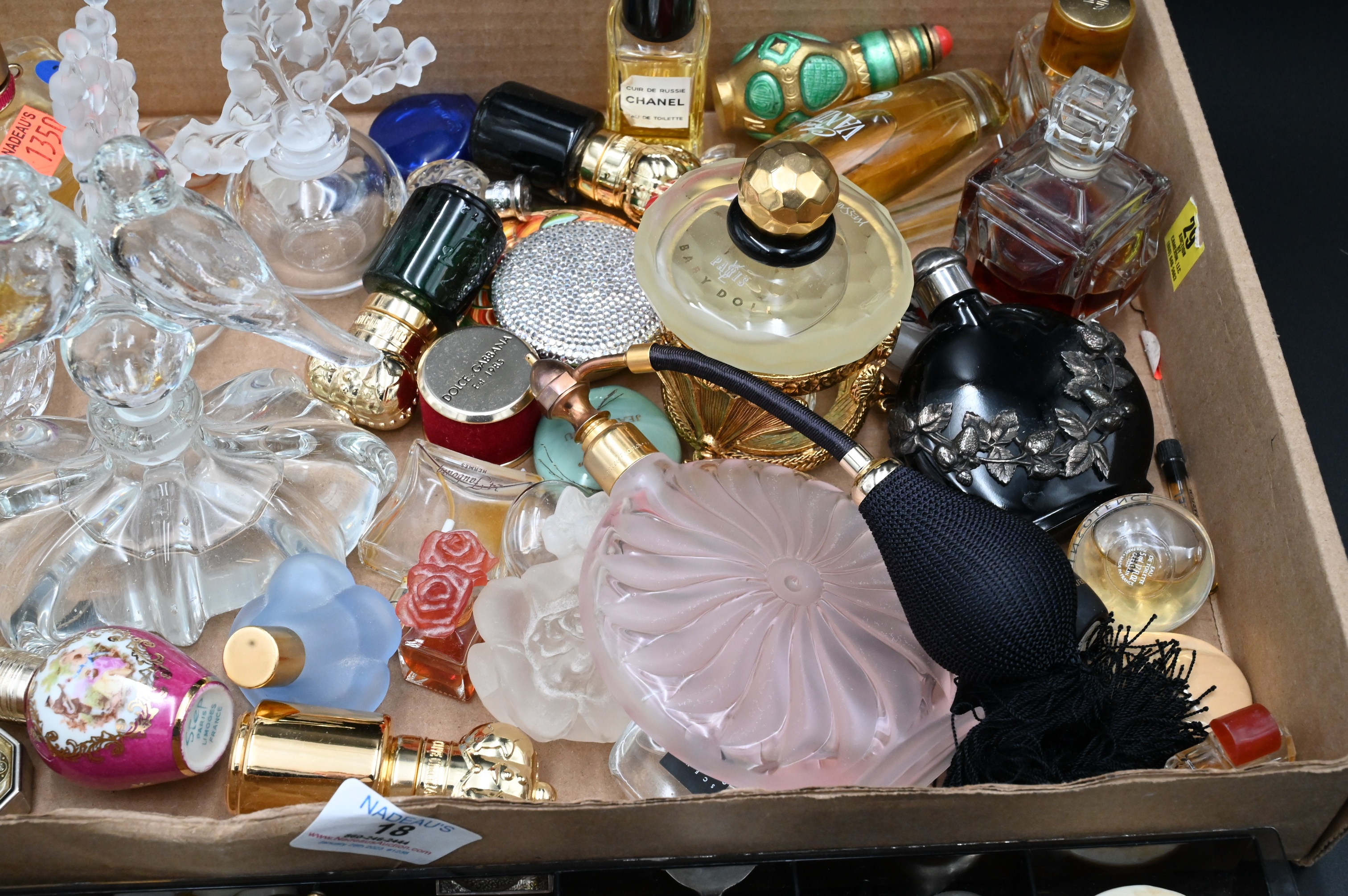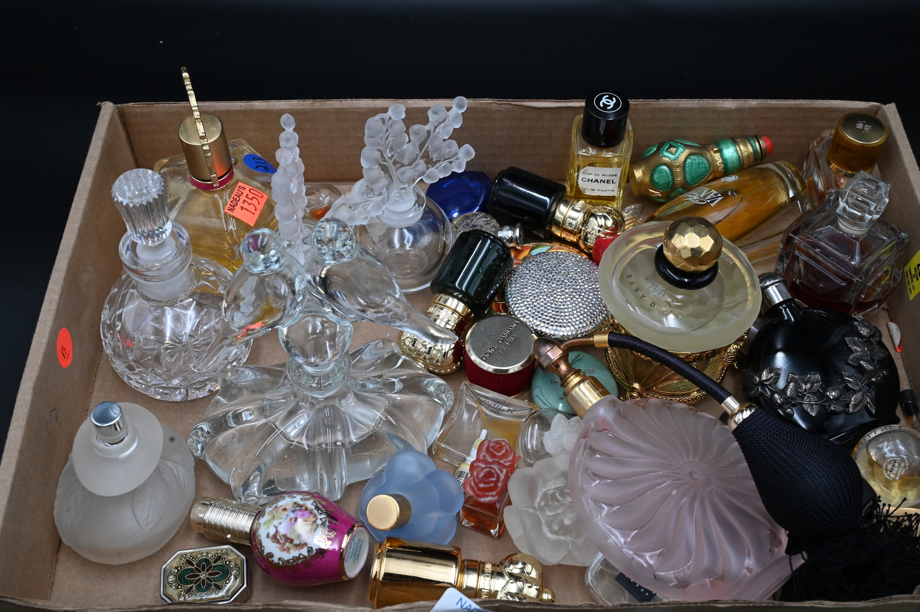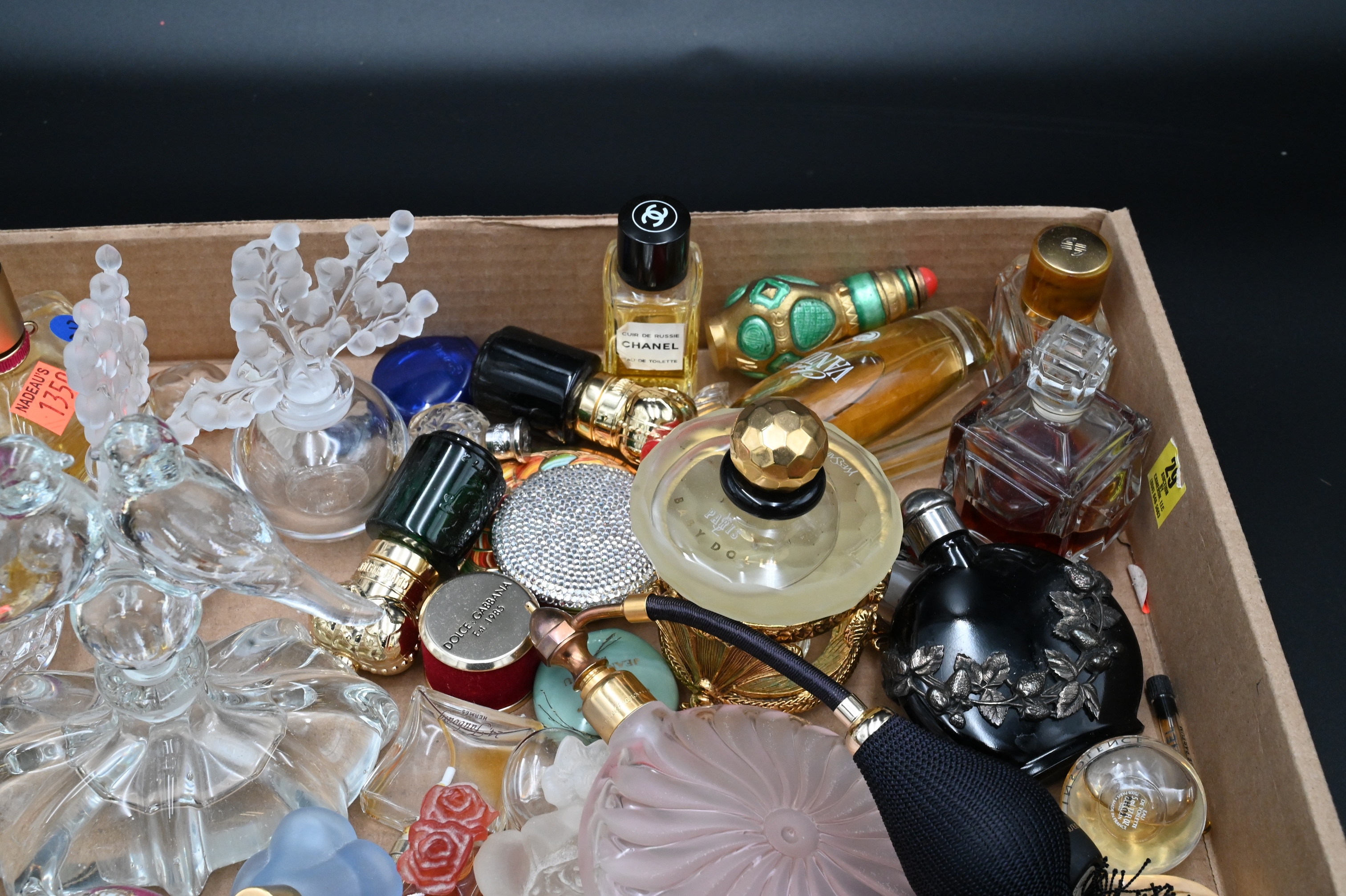 Tray Lot of Perfume Bottles and Perfume, to include one atomizer, two Lalique bottles, along with costume jewelry. Provenance: Property from a private New York collection sold to benefit charitable foundations.