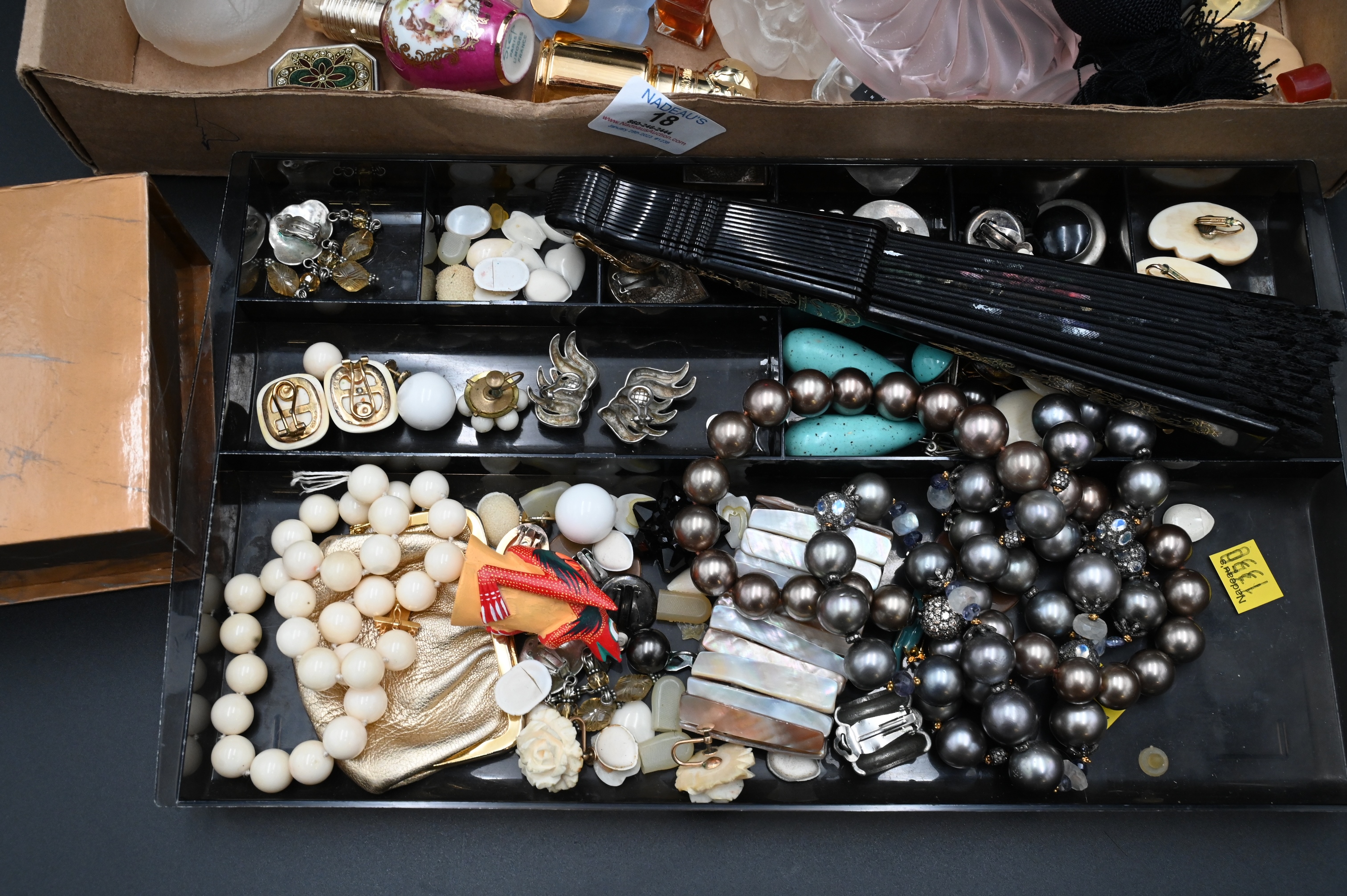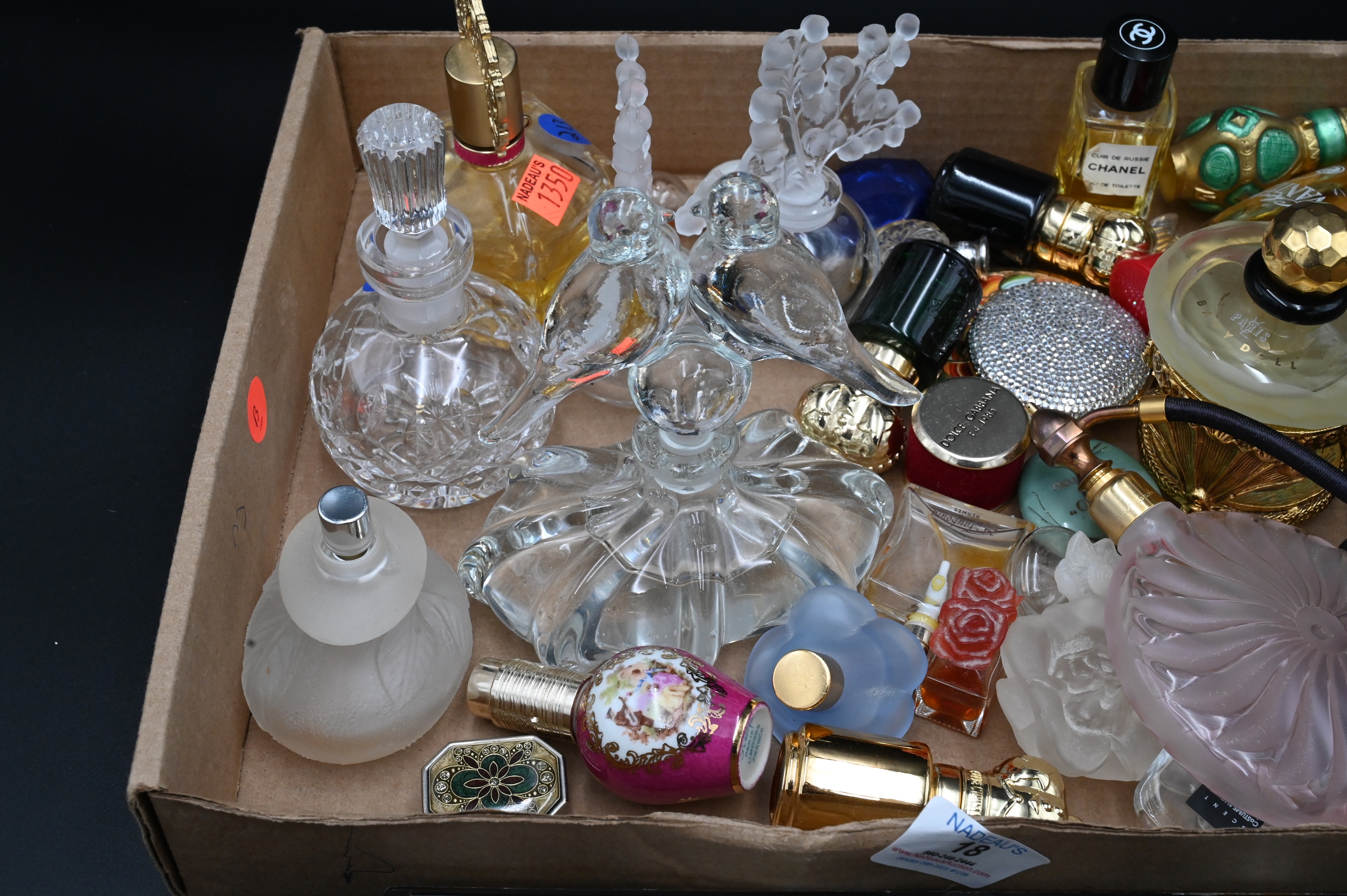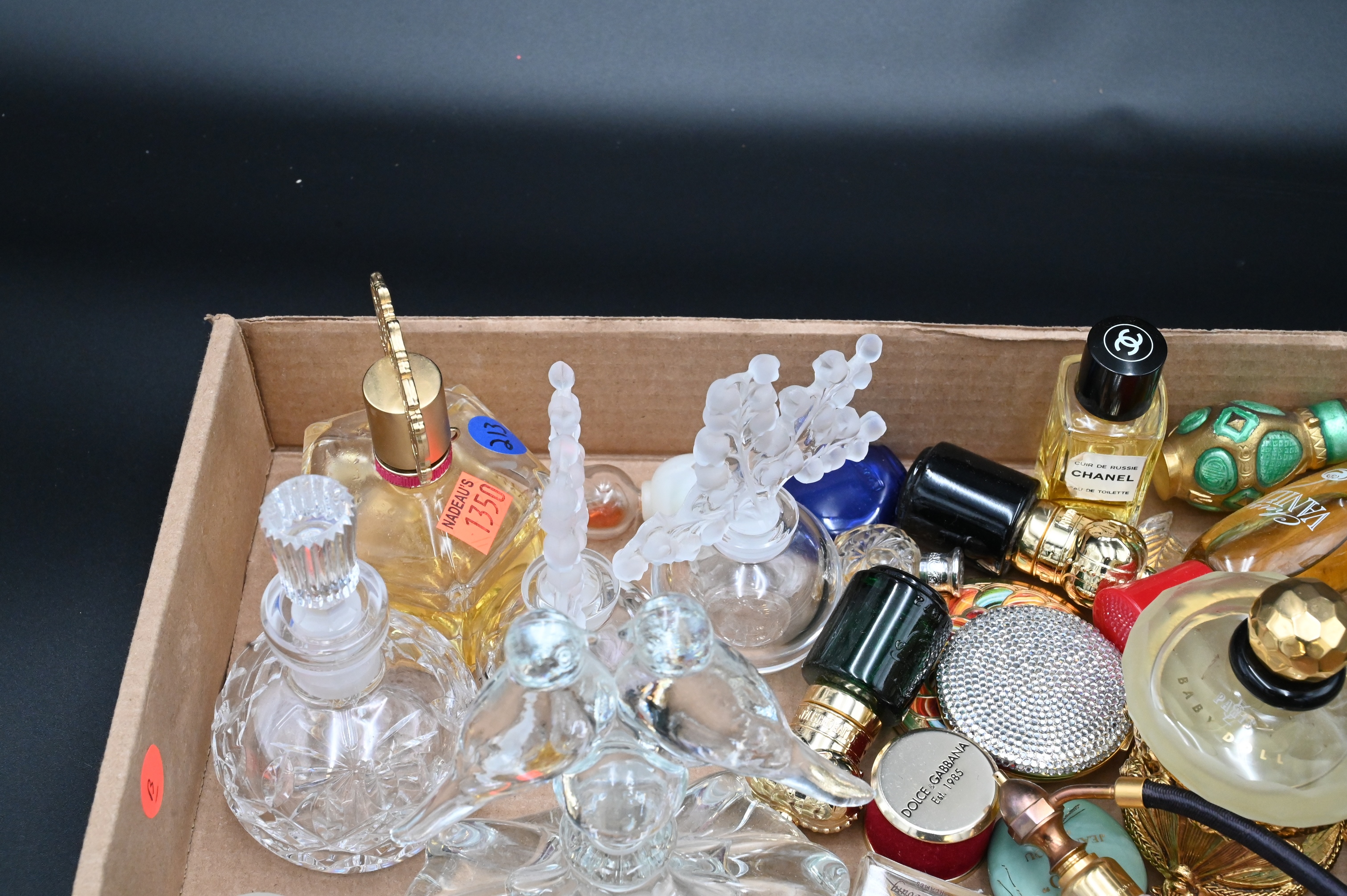 Tray Lot of Perfume Bottles and Perfume, to include one atomizer, two Lalique bottles, along with costume jewelry. Provenance: Property from a private New York collection sold to benefit charitable foundations.