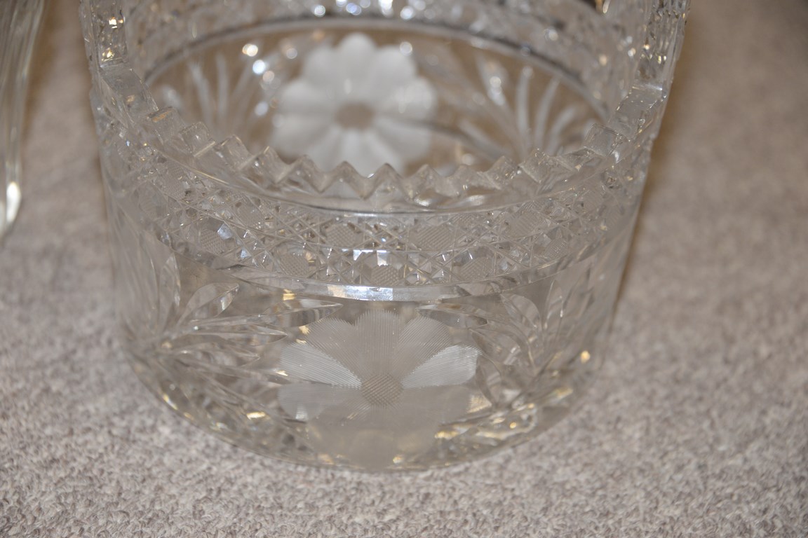 Two cut glass pieces including a pitcher with silver top and an ice bucket. pitcher ht. 9 in.