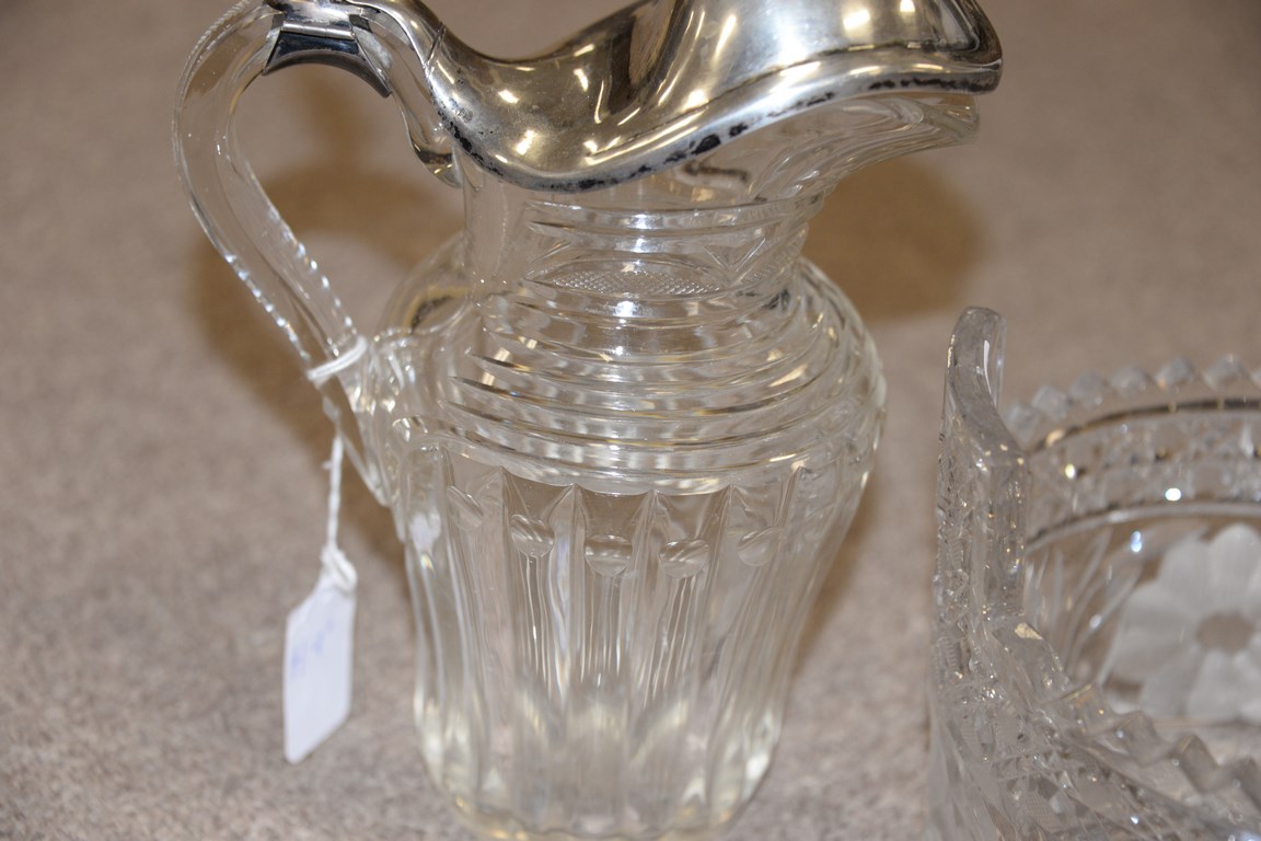 Lot 18: Two cut glass pieces including a pitcher with silver top and an ice bucket. pitcher ht. 9 in.