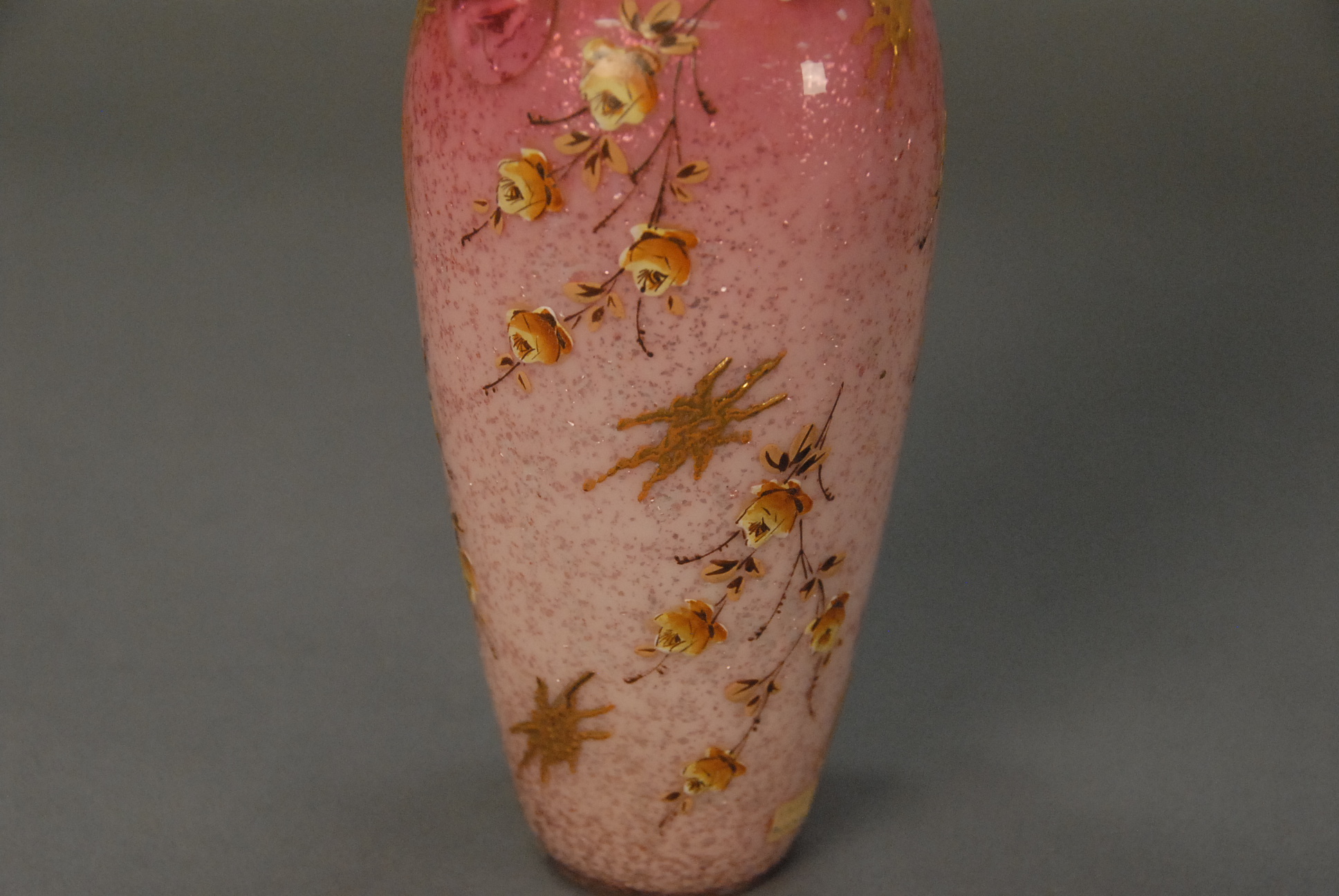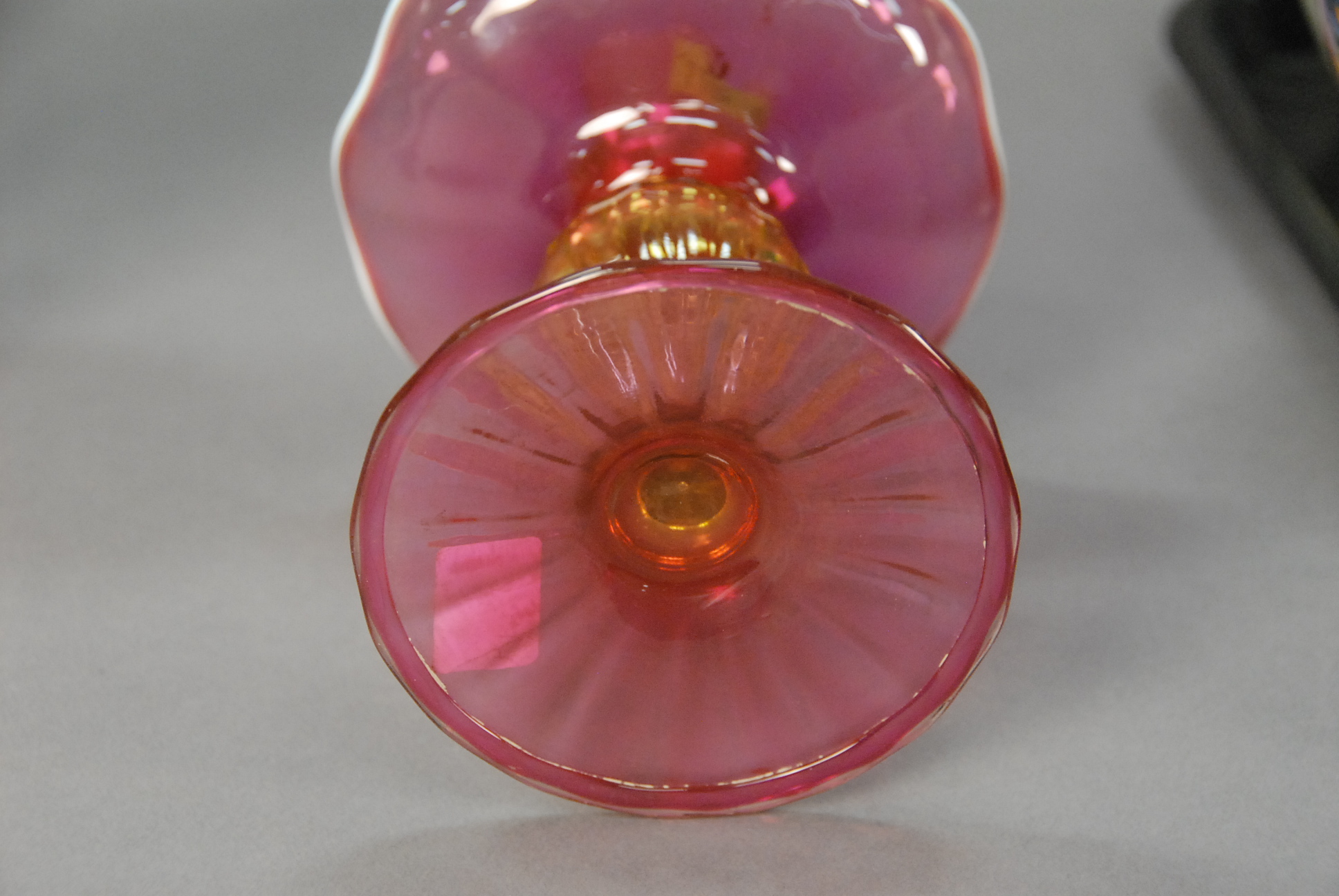 Lot 18: Two piece lot to include amberina art glass candlestick ht. 6in. and cased glass vase with enameling ht. 8in.