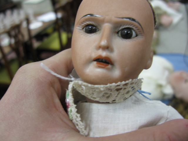 11 Bisque head, made in Germany, open mouth, set eyes, on BJCB missing lower legs, scruffs to face, looks like an American Indian face.