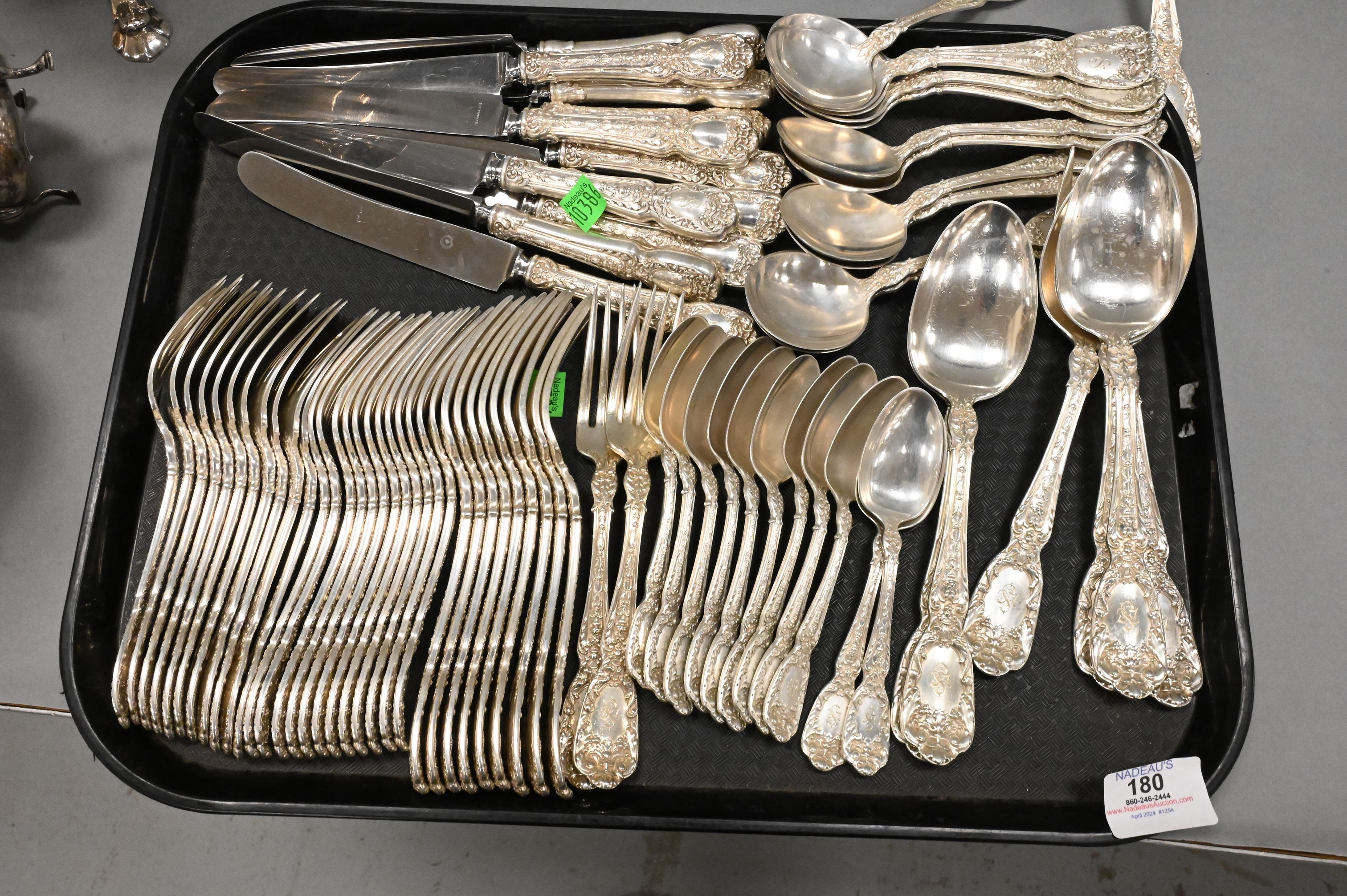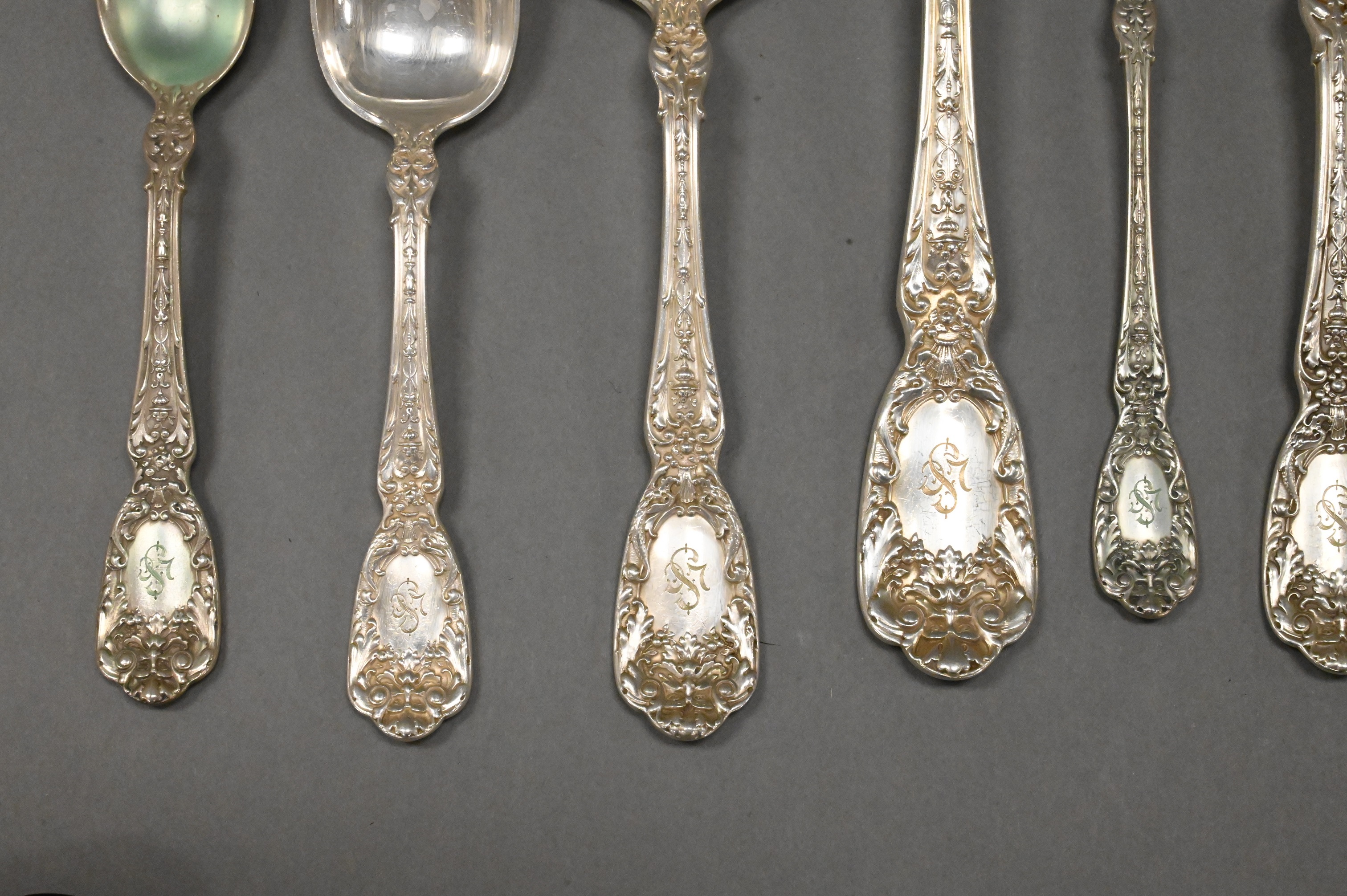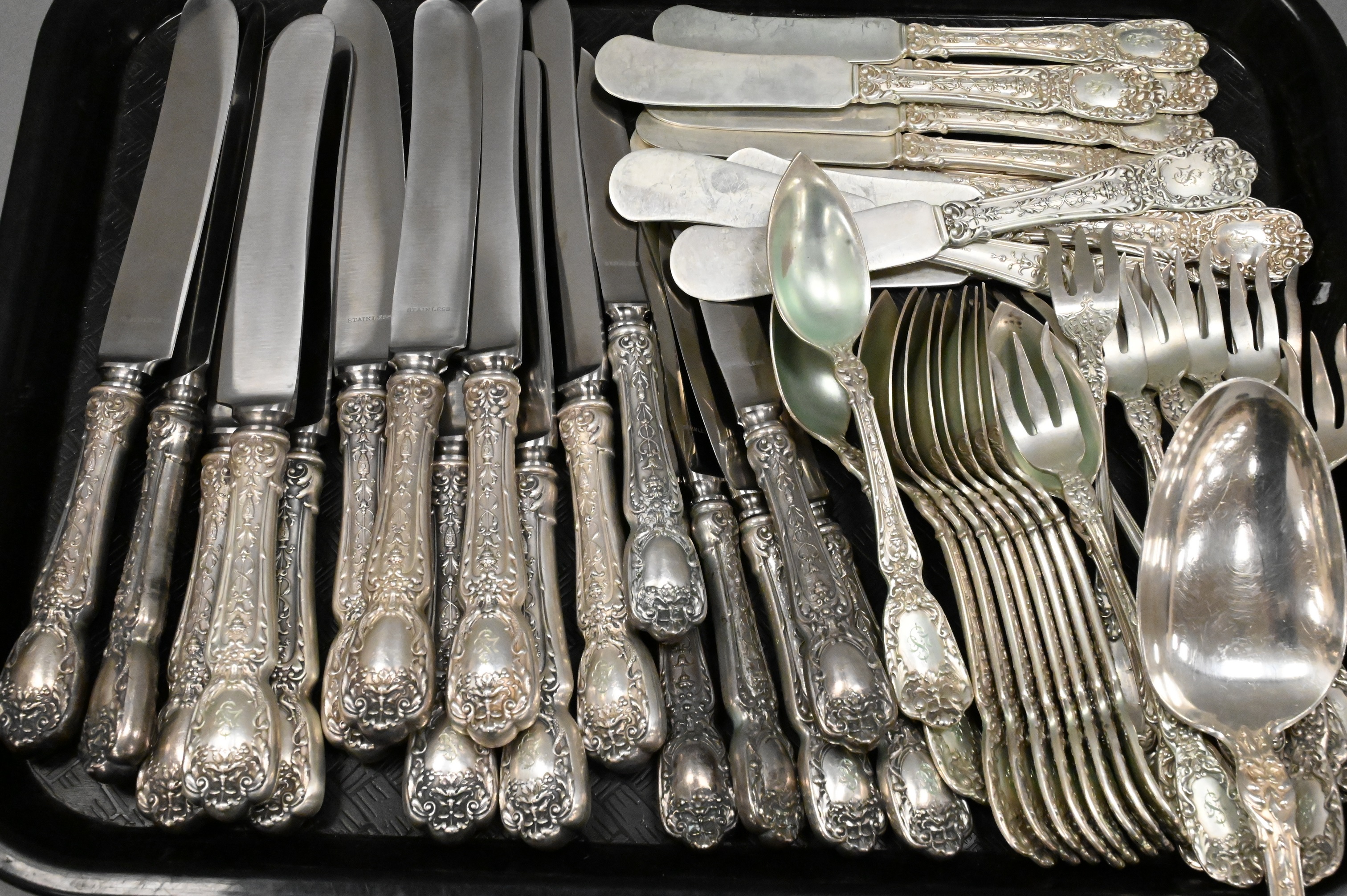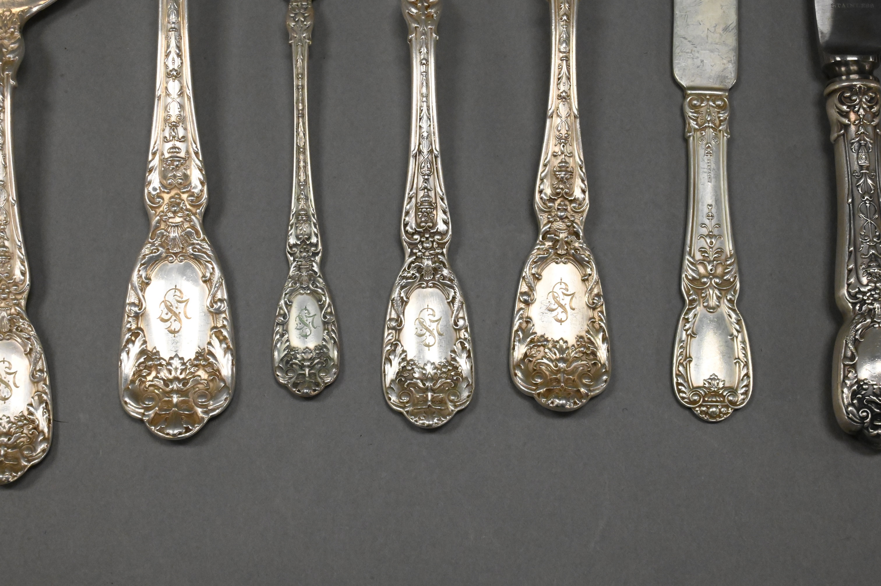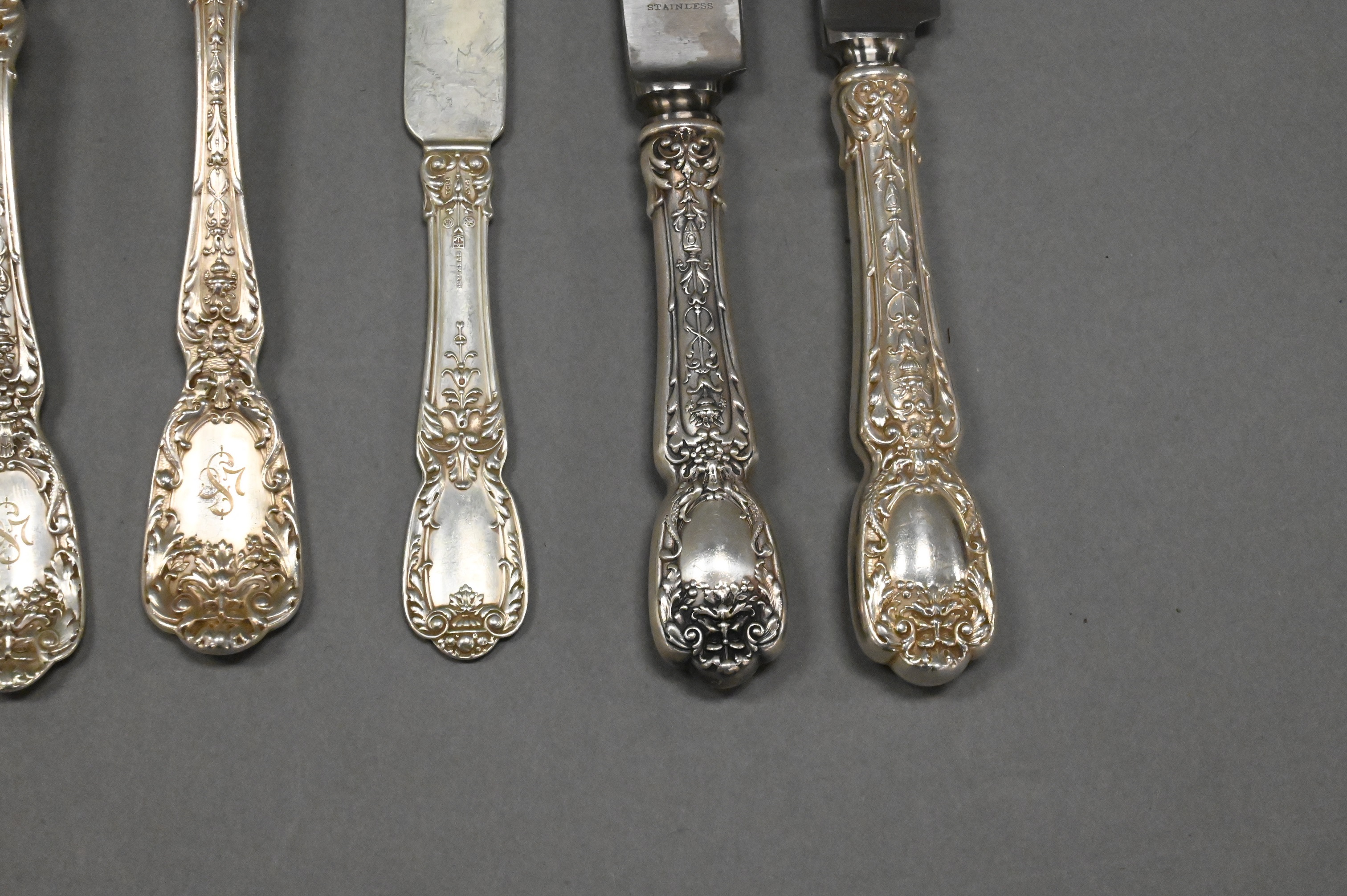 to include 12 dinner forks, 12 luncheon forks, 12 fish forks, 12 cocktail forks, one serving fork, seven place spoons, 12 soup spoons, 12 teaspoons, 12 sherbert spoons, 12 dinner knives, 12 luncheon knives, 6 fish knives, 12 butter knives