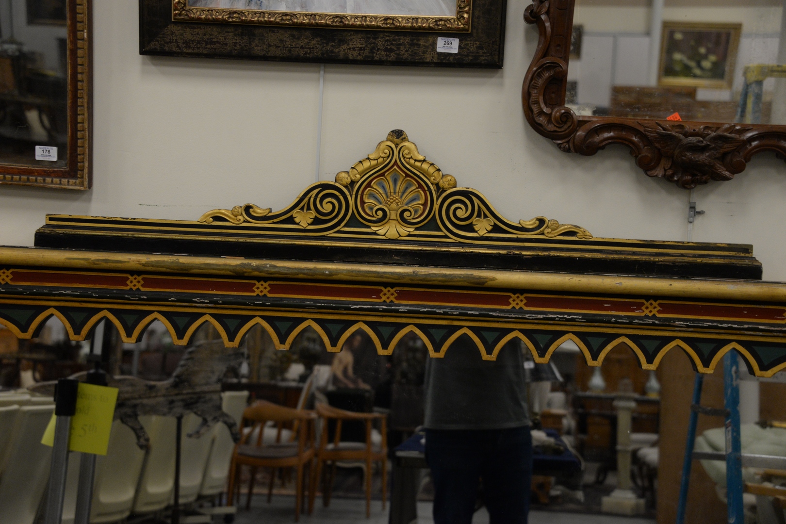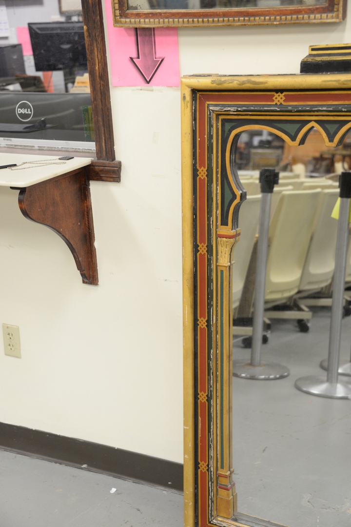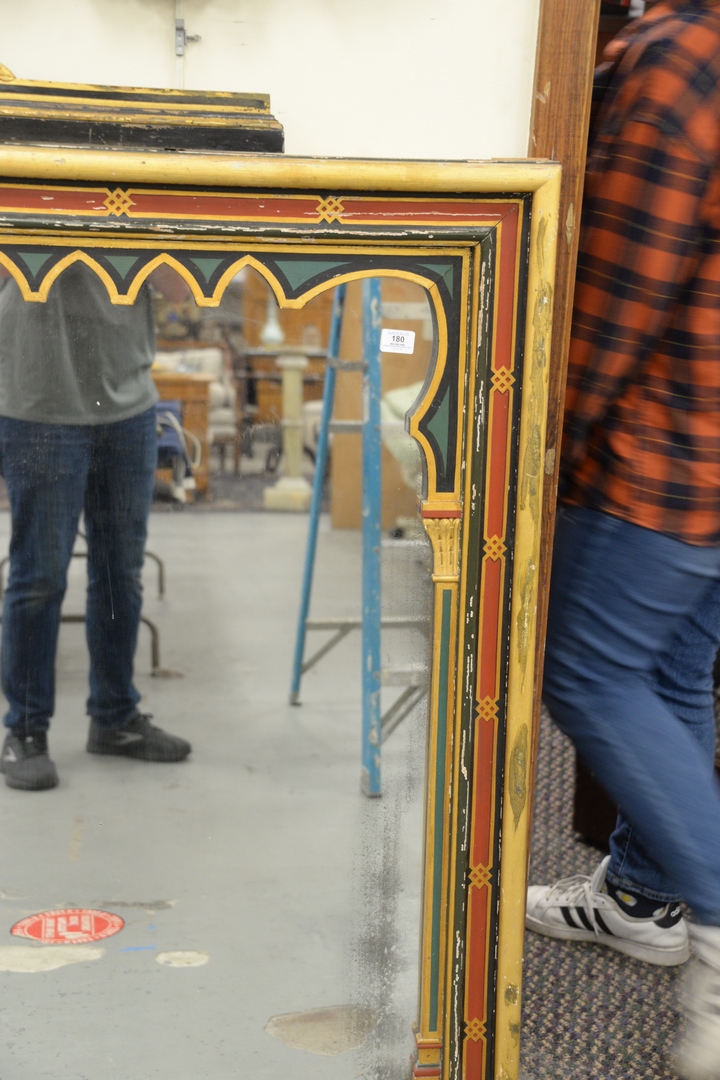 Lot 180: Aesthetic Mirror, having red, black, and gold paint decoration, height 61 inches, width 76 inches.