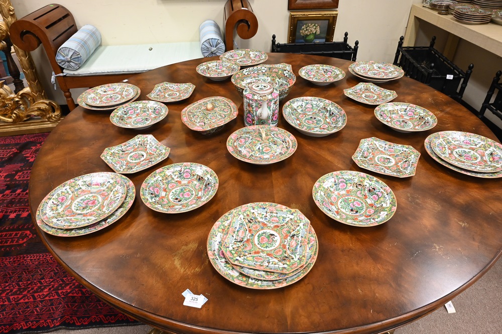 Approximately 64 Piece Rose Medallion Porcelain Set, to include dinner plates, luncheon plates, bowls, square plates, teapot, covered tureens, serving platter, etc.