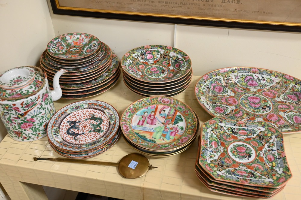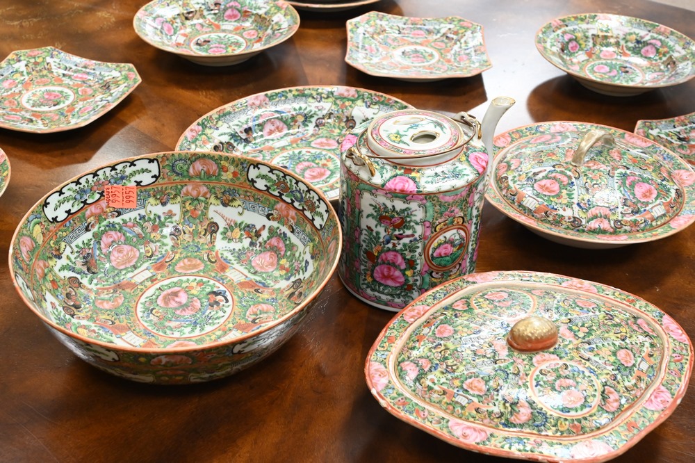 Lot 180: Approximately 64 Piece Rose Medallion Porcelain Set, to include dinner plates, luncheon plates, bowls, square plates, teapot, covered tureens, serving platter, etc.