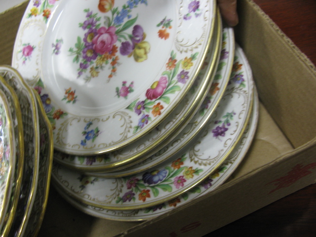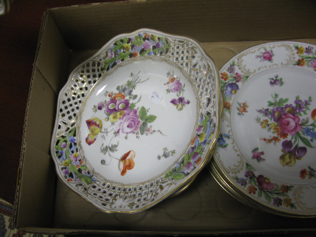 Box lot with four Dresden reticulated plates along with German porcelain Dresden style plates.