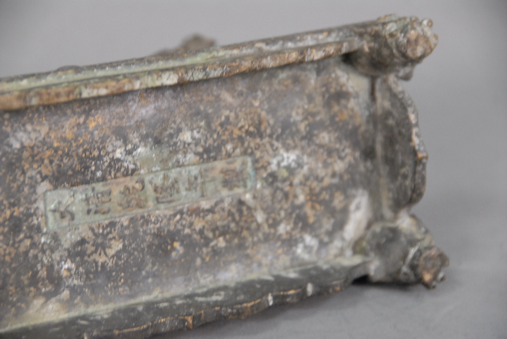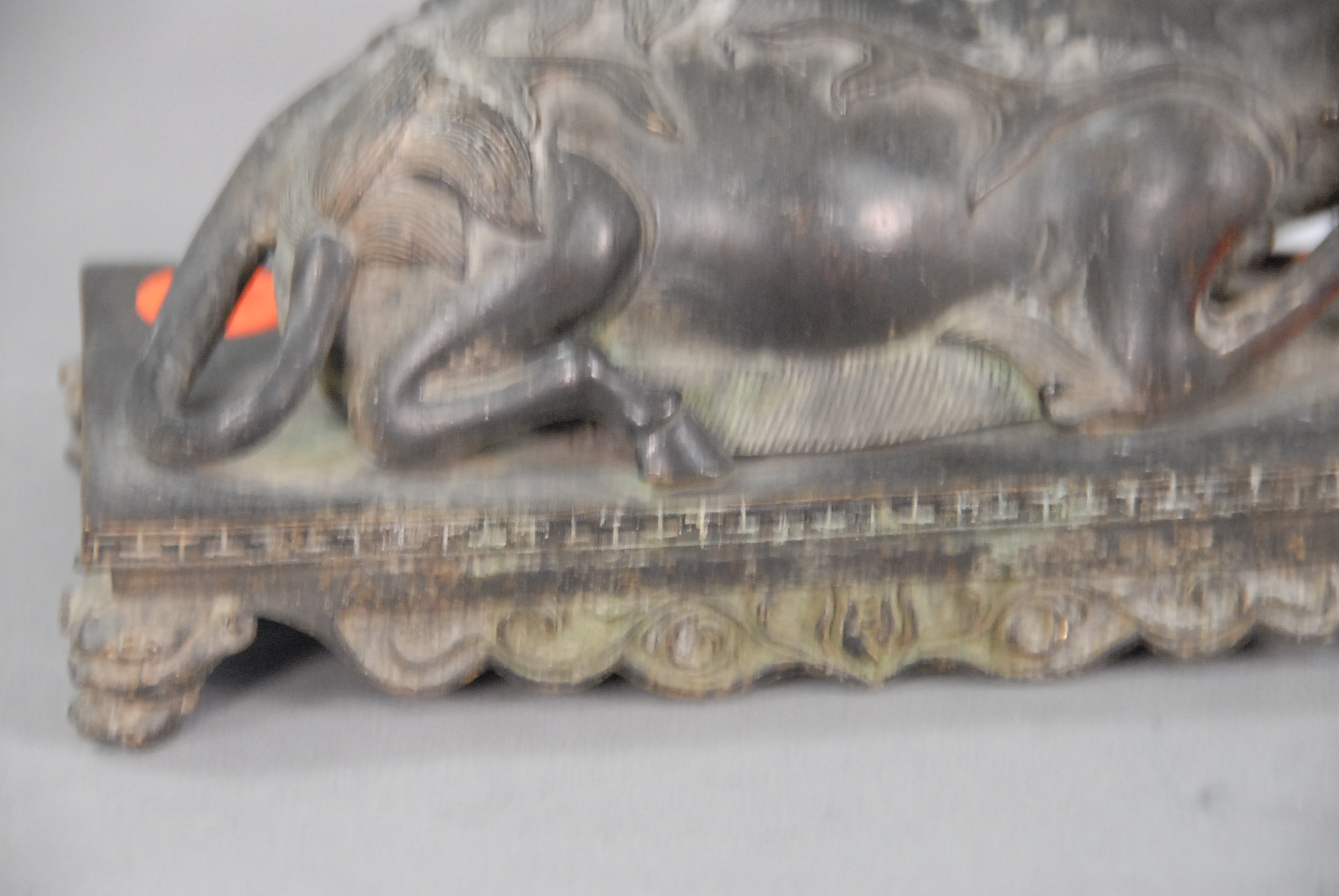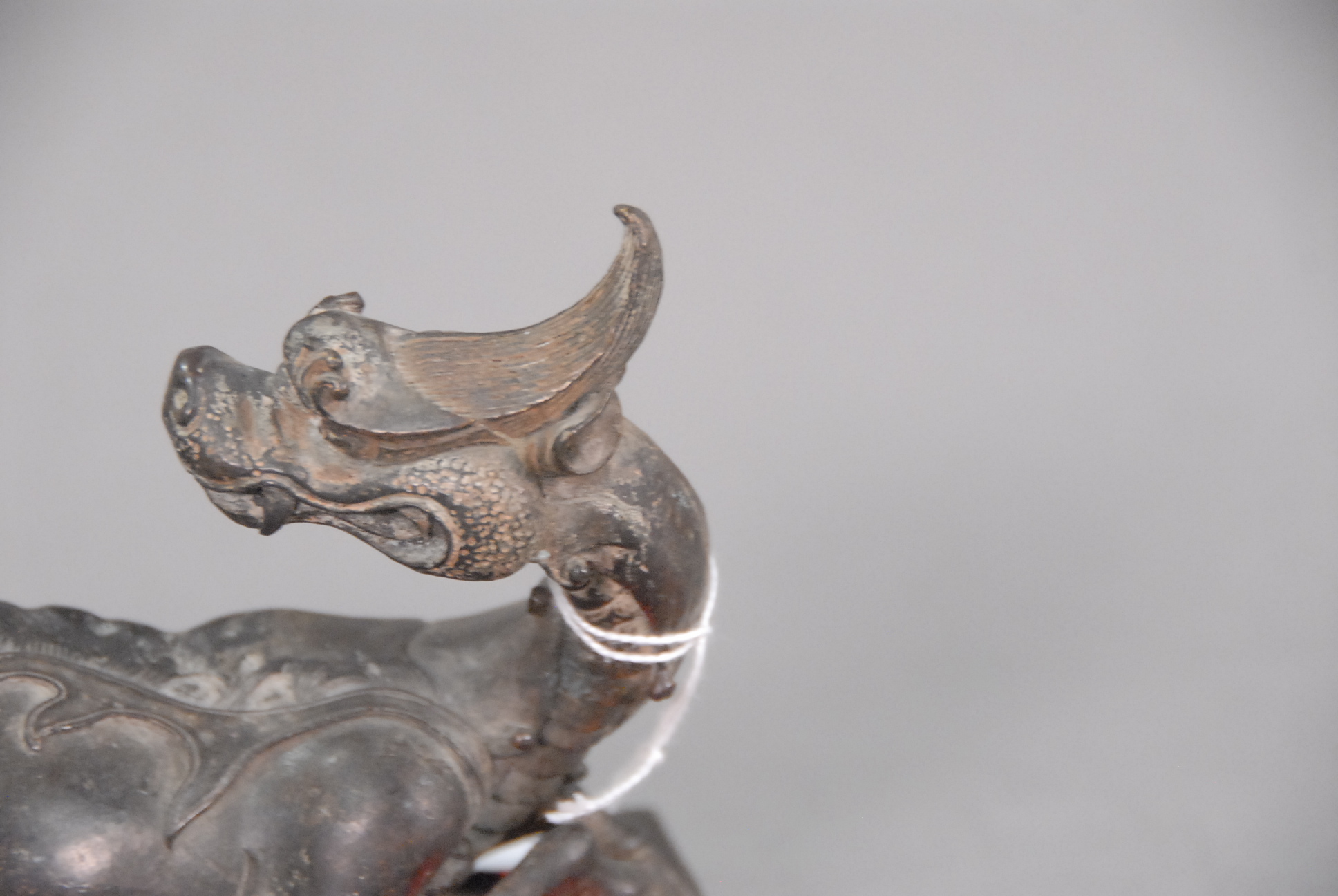 Bronze dragon sitting on platform with feet in the form of foo dog heads.