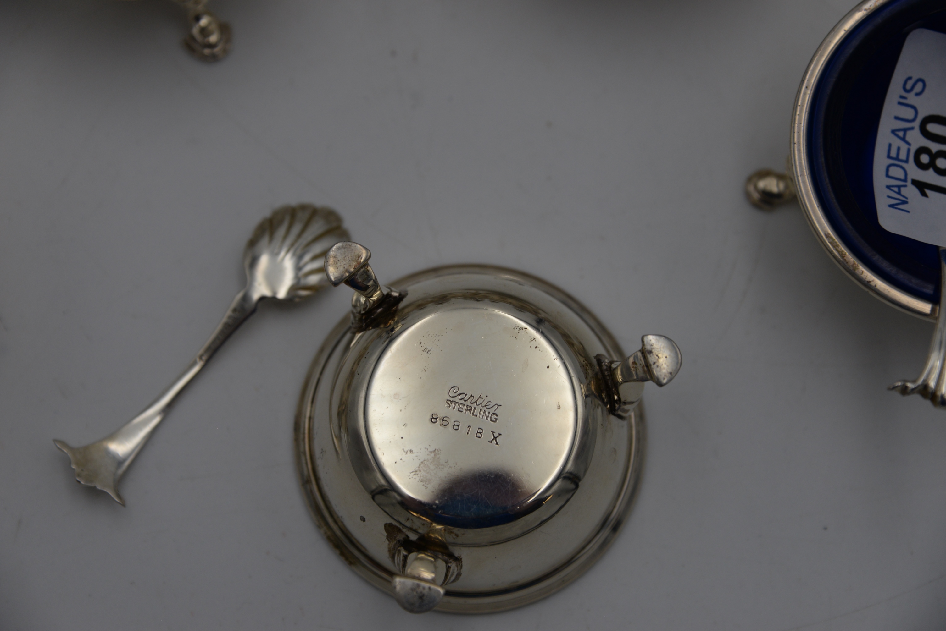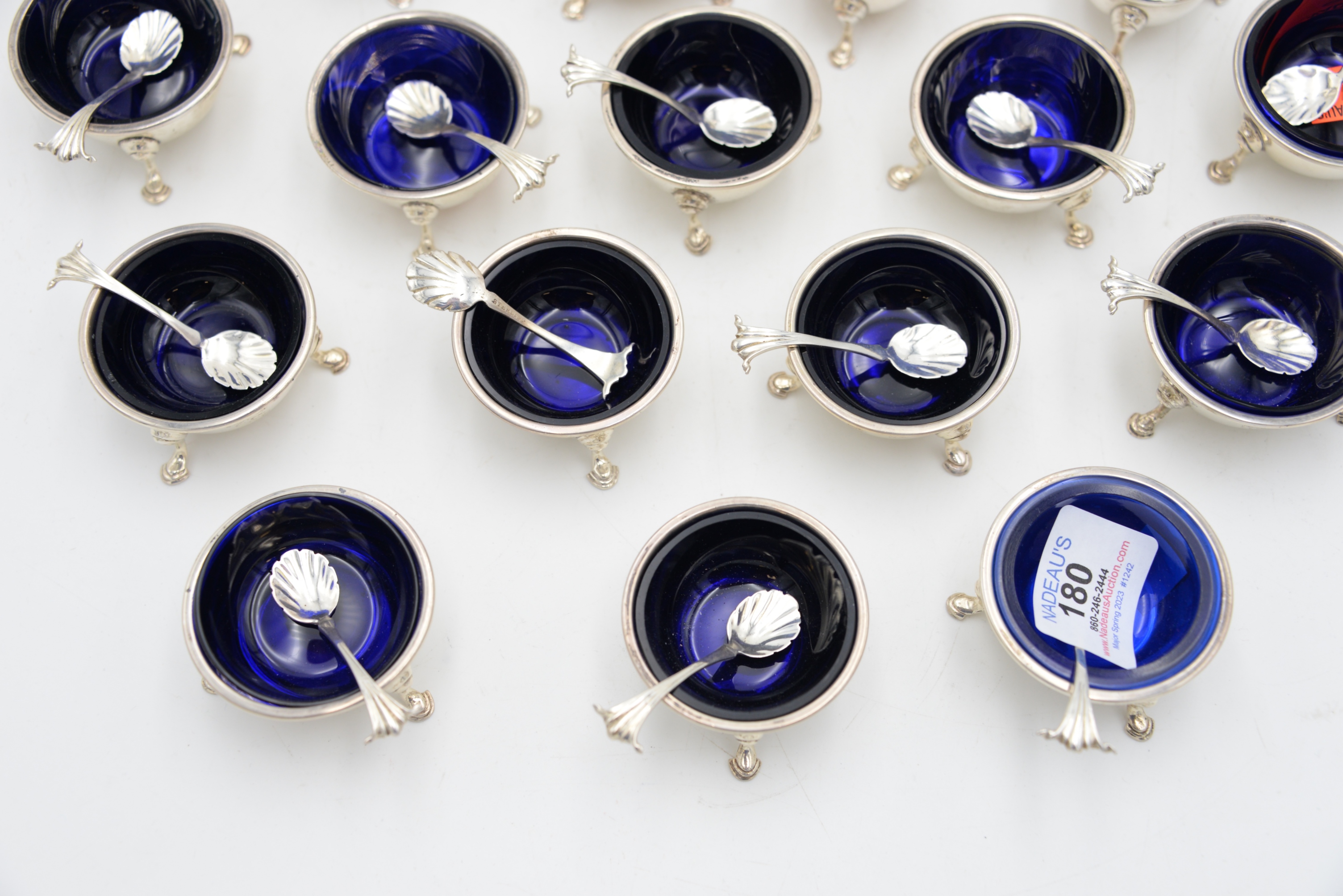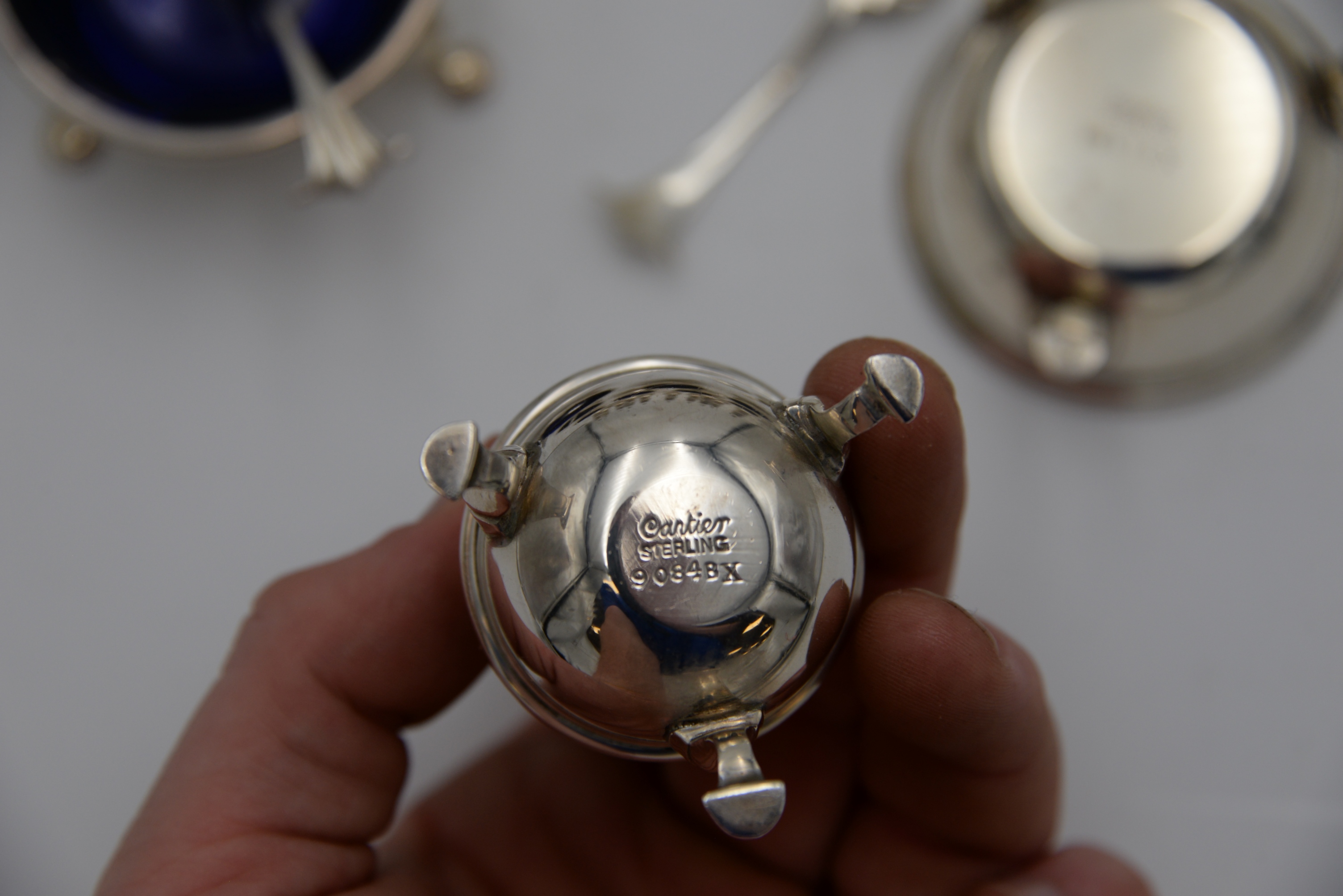 Cartier 36 Piece Lot of Sterling Silver, to include 12 pepper shakers, height 4 1/4 inches; 12 open salts with cobalt liners, diameter 2 1/4 inches; along with 12 salt spoons, length 2 1/4 inches, (spoons not marked Cartier), 50 t.oz.