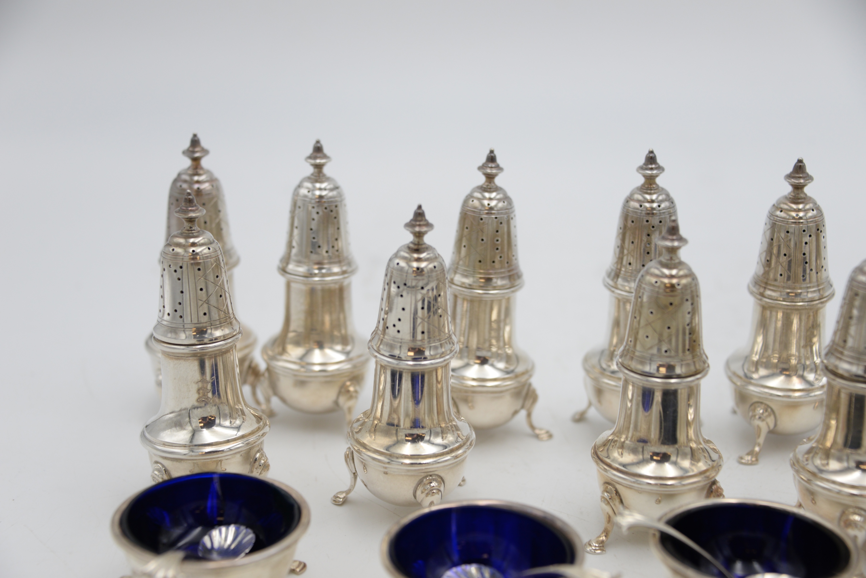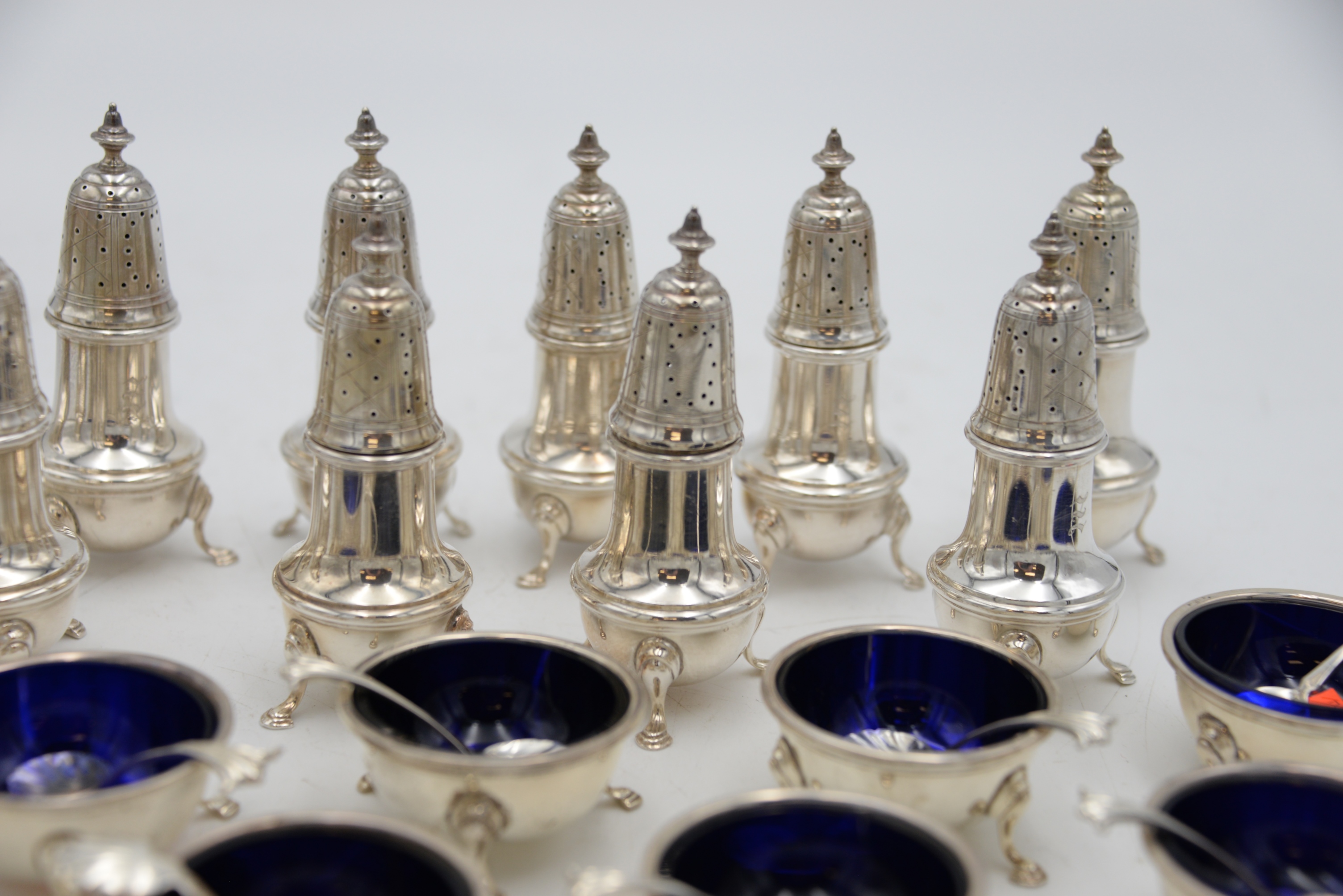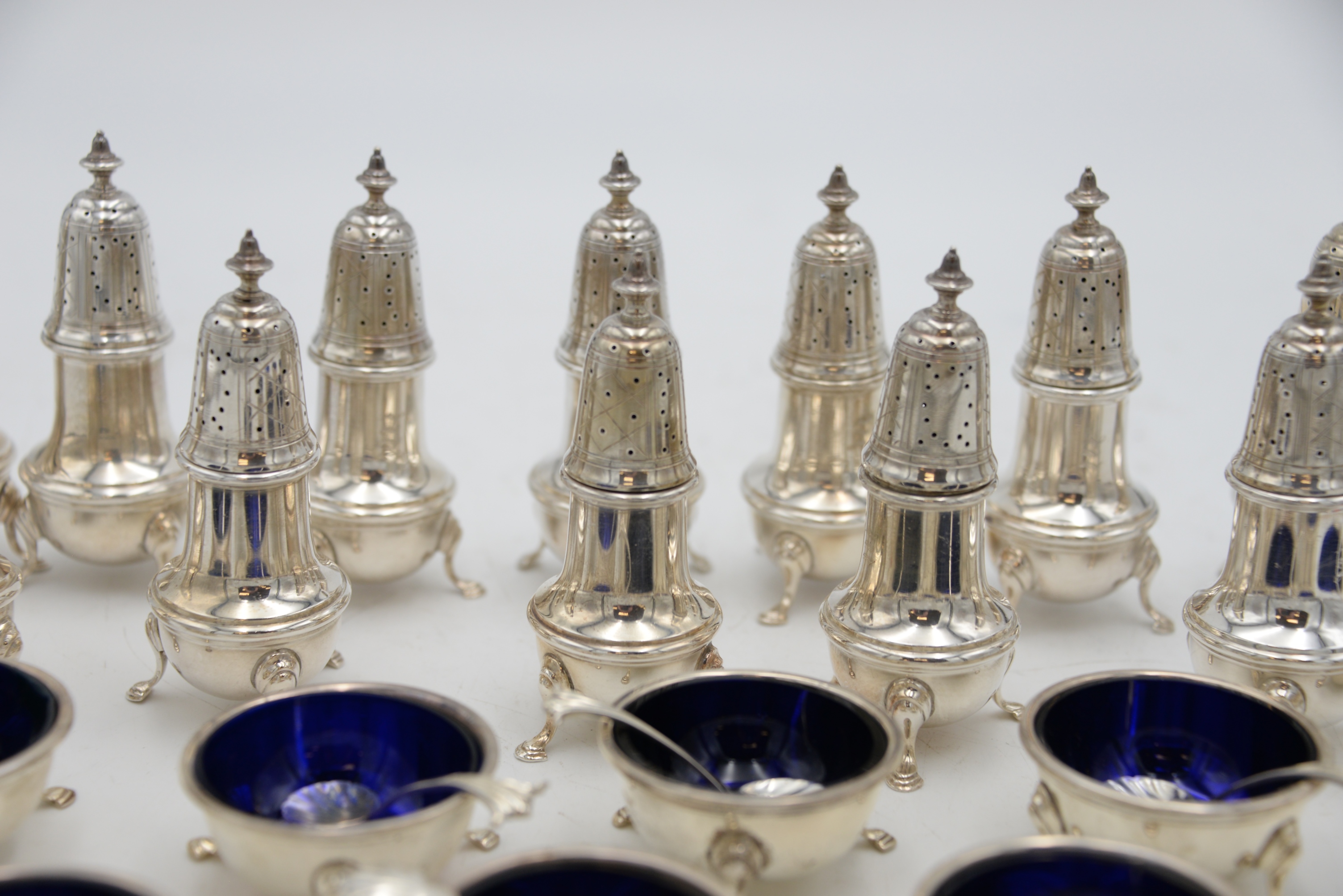 Cartier 36 Piece Lot of Sterling Silver, to include 12 pepper shakers, height 4 1/4 inches; 12 open salts with cobalt liners, diameter 2 1/4 inches; along with 12 salt spoons, length 2 1/4 inches, (spoons not marked Cartier), 50 t.oz.