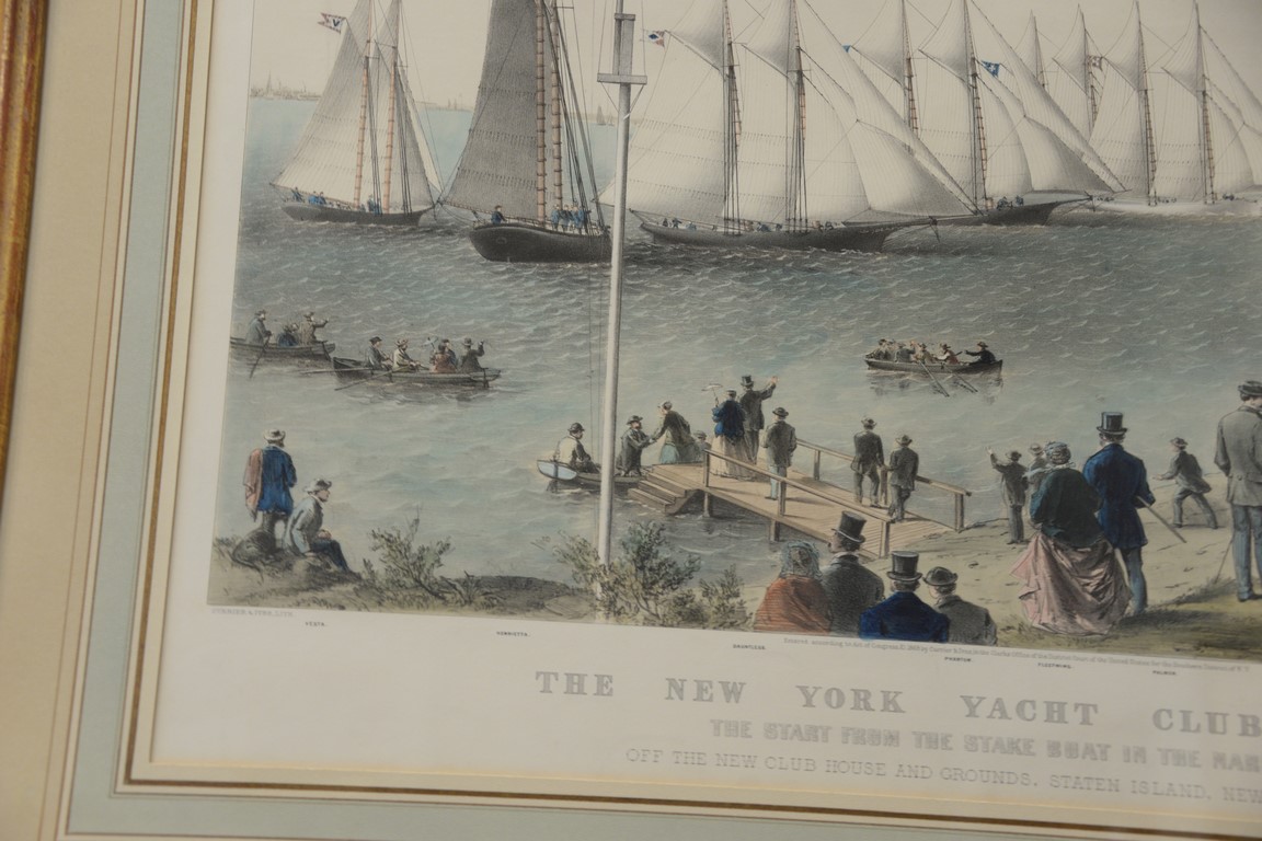 Currier & Ives large folio hand colored lithograph The New York Yacht Club Regatta The Start from the Stake Boat in the Narrows, off the new clubhouse and grounds, Staten Island, New York Harbor marked lower right: Parsons & Atwater, Del N.Y. marked lower left: Currier & Ives Lith sight size 20 1/2 x 29 Provenance: Property from Credit Suisse’s Americana Collection