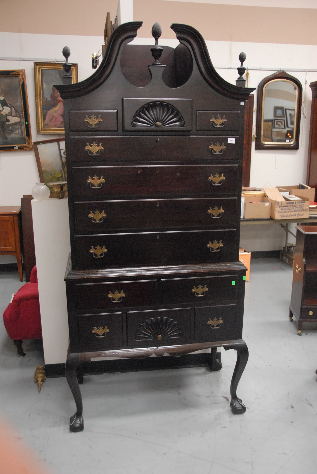 Custom mahogany Chippendale style highboy with full bonnet top in two parts.