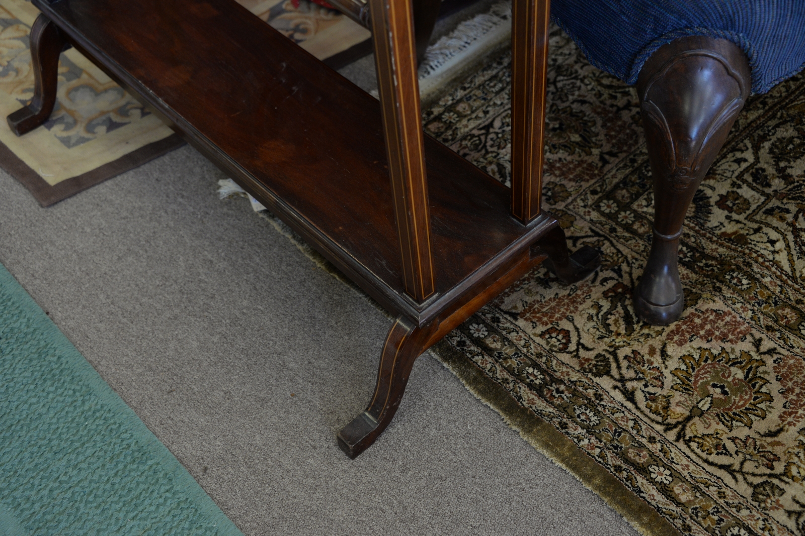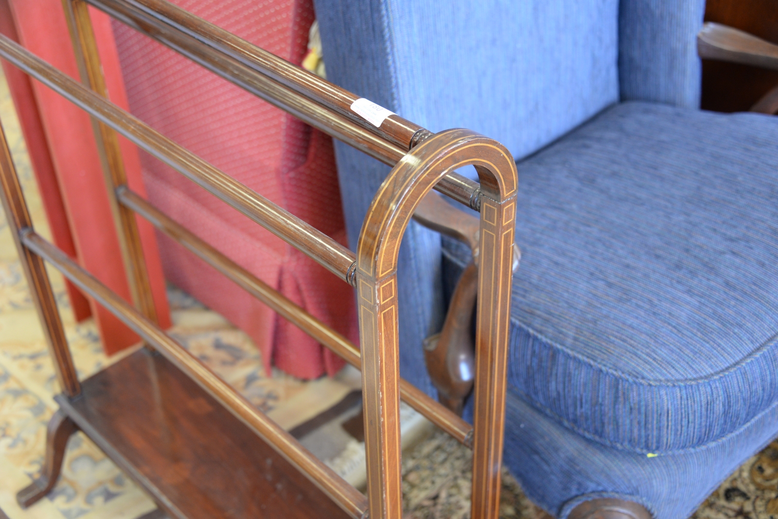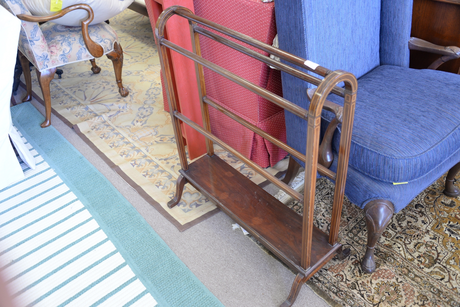 Edwardian style inlaid mahogany towel rack. ht. 36in., wd. 30in.