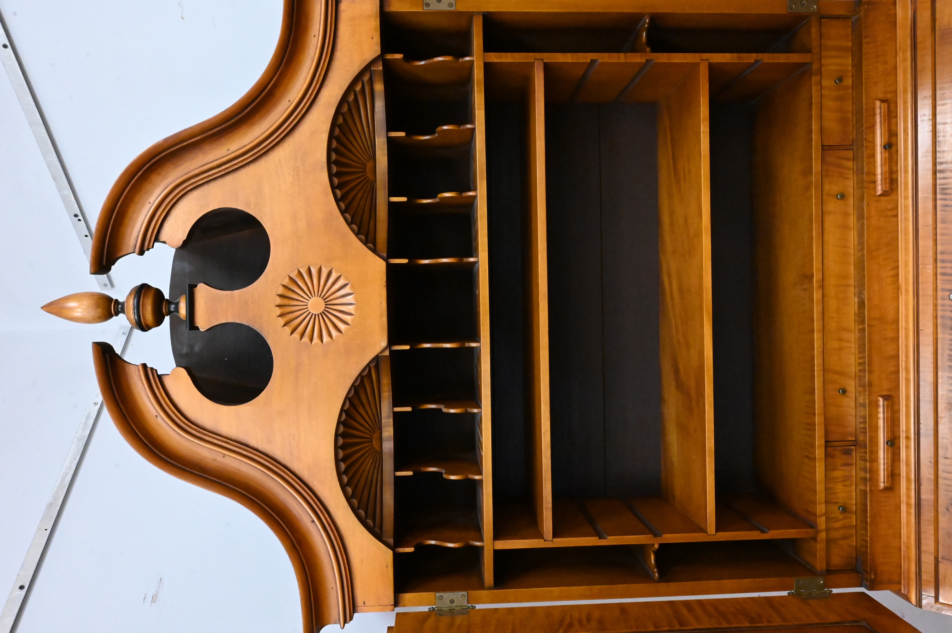 The arched bonnet top with central turned finial above two paneled doors opening to fitted shelves; over a slant-front writing surface that opens to an interior of valanced pigeonholes, document drawers, blocked concave drawers, and a central prospect door with carved sunburst. The lower case fitted with three long graduated drawers raised on ogee bracket feet, late 20th century