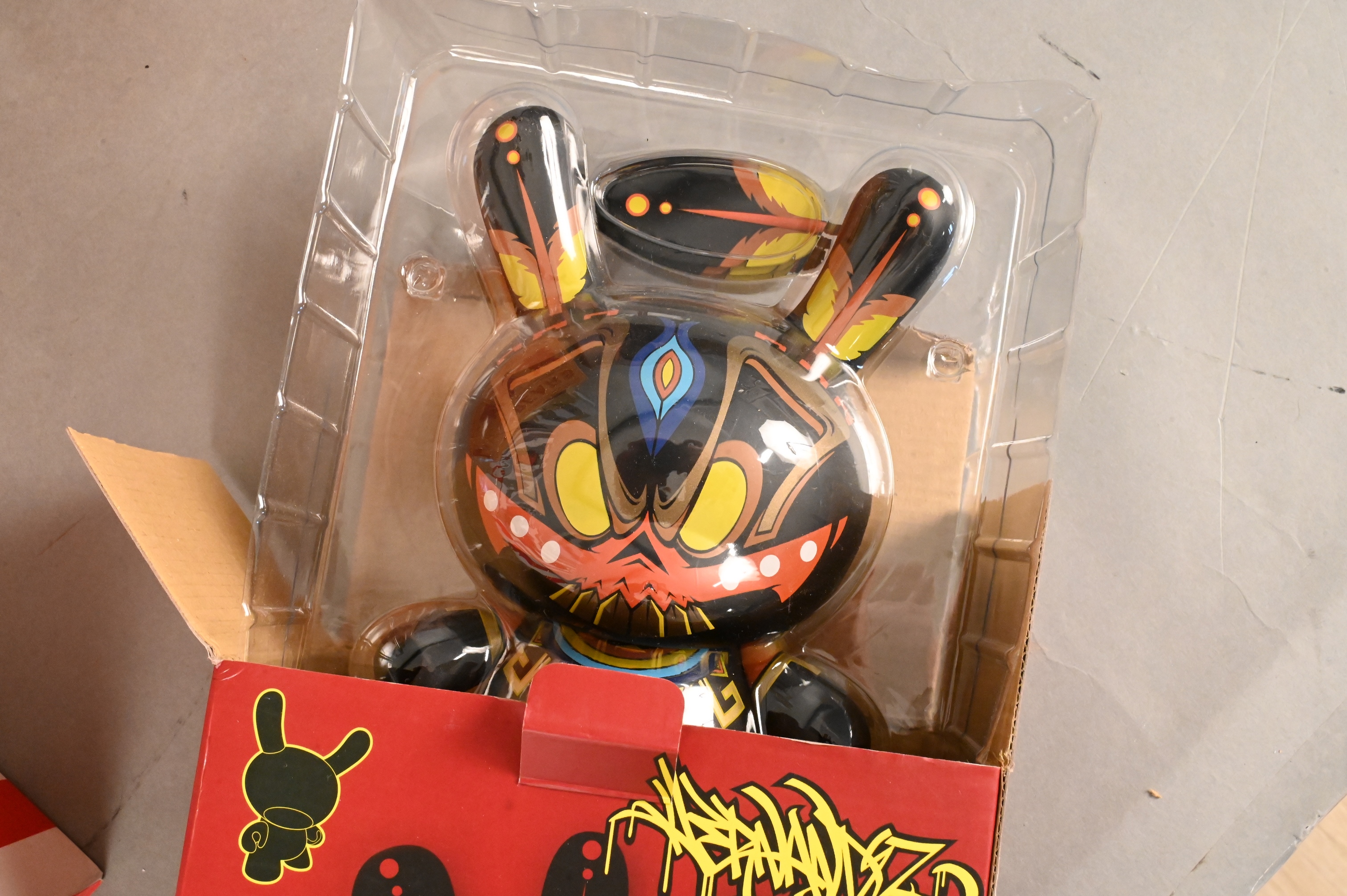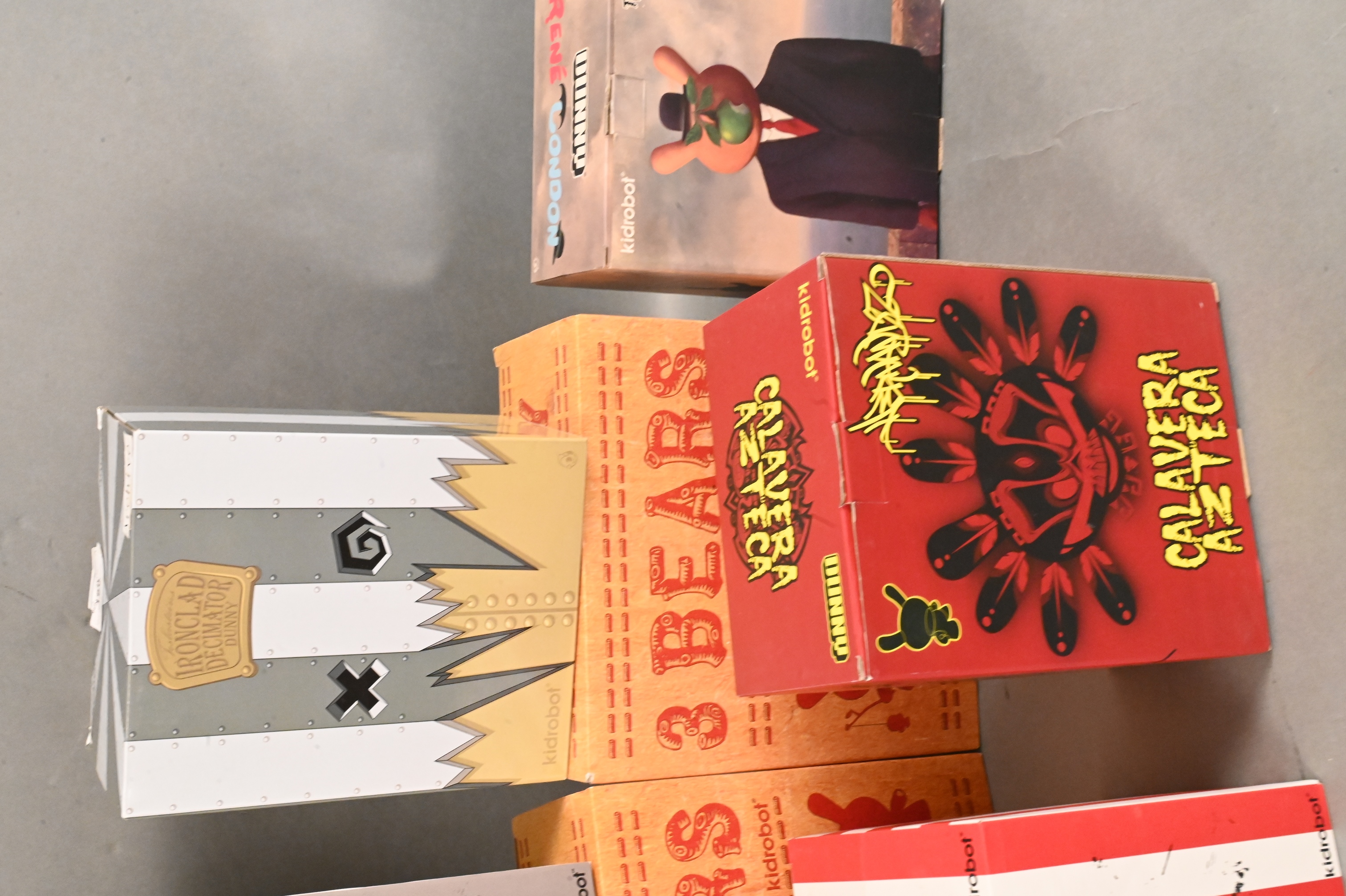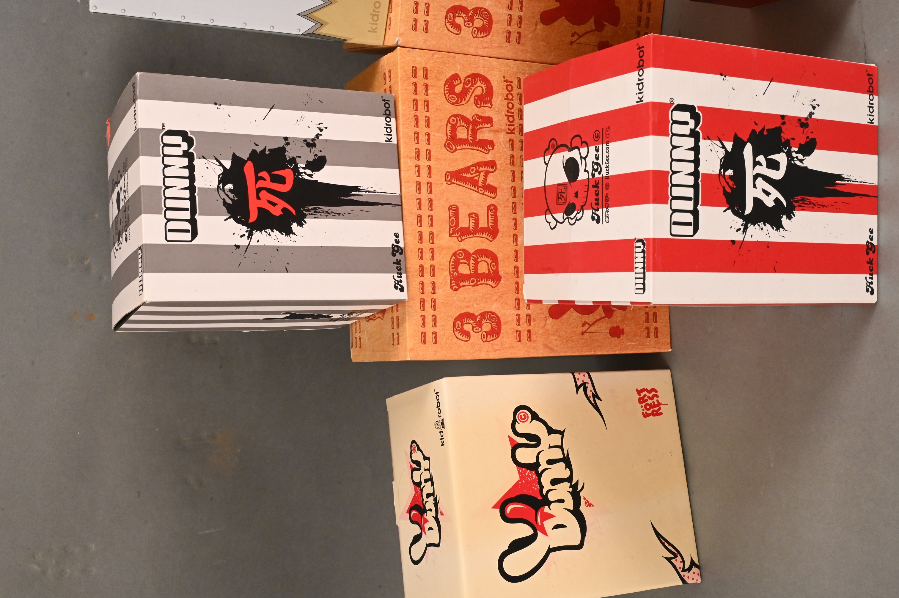 to include two ‘Huck Gee ‘(one red box, one black box), ‘Calavera Azteca’, ‘Fortress’, ‘Rene London’, ‘Ironclad Decimator Dunny’, two ‘3 Bears, Tado- I Love Dust John Burgerman’, all signed on the bottom