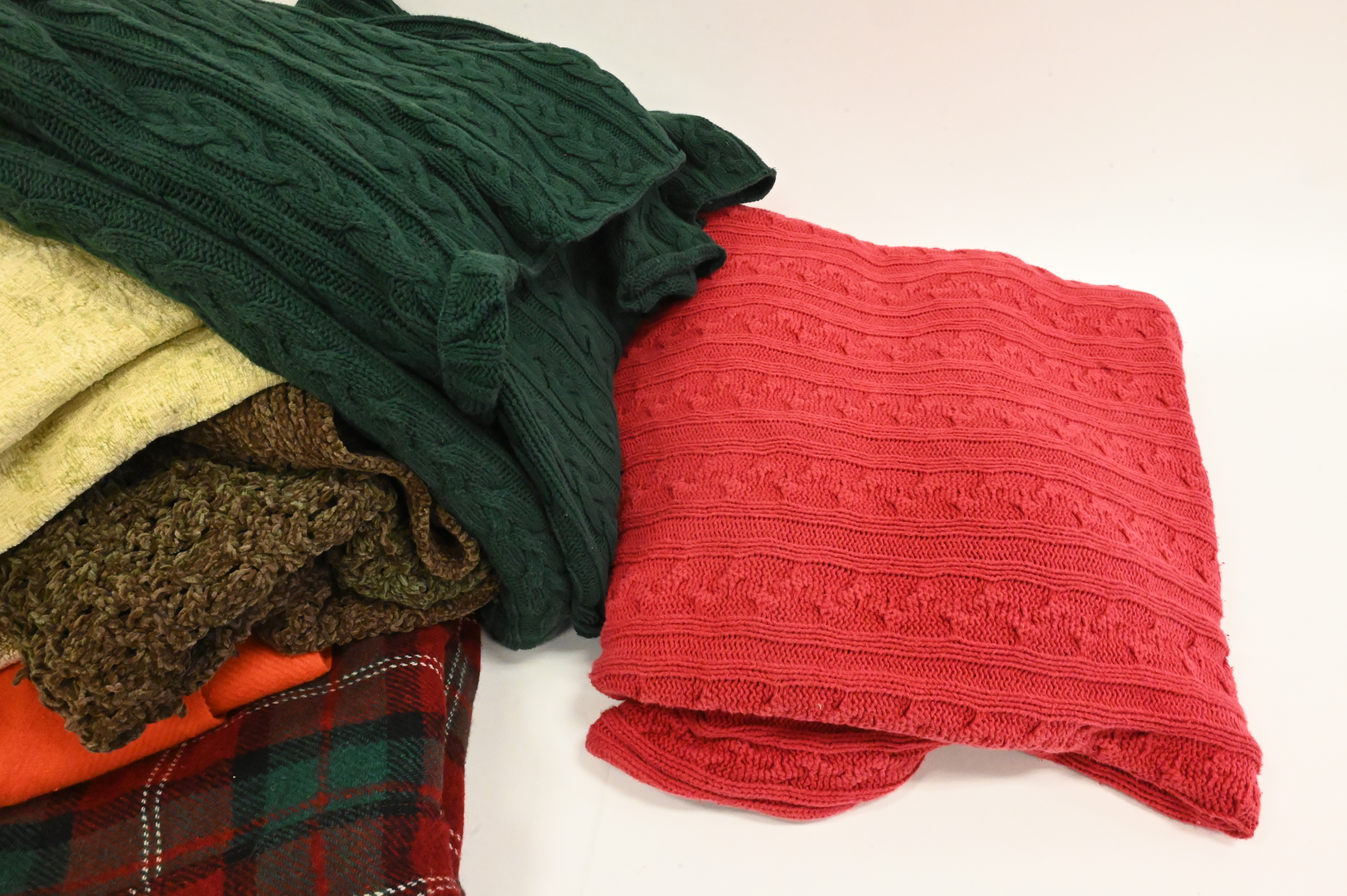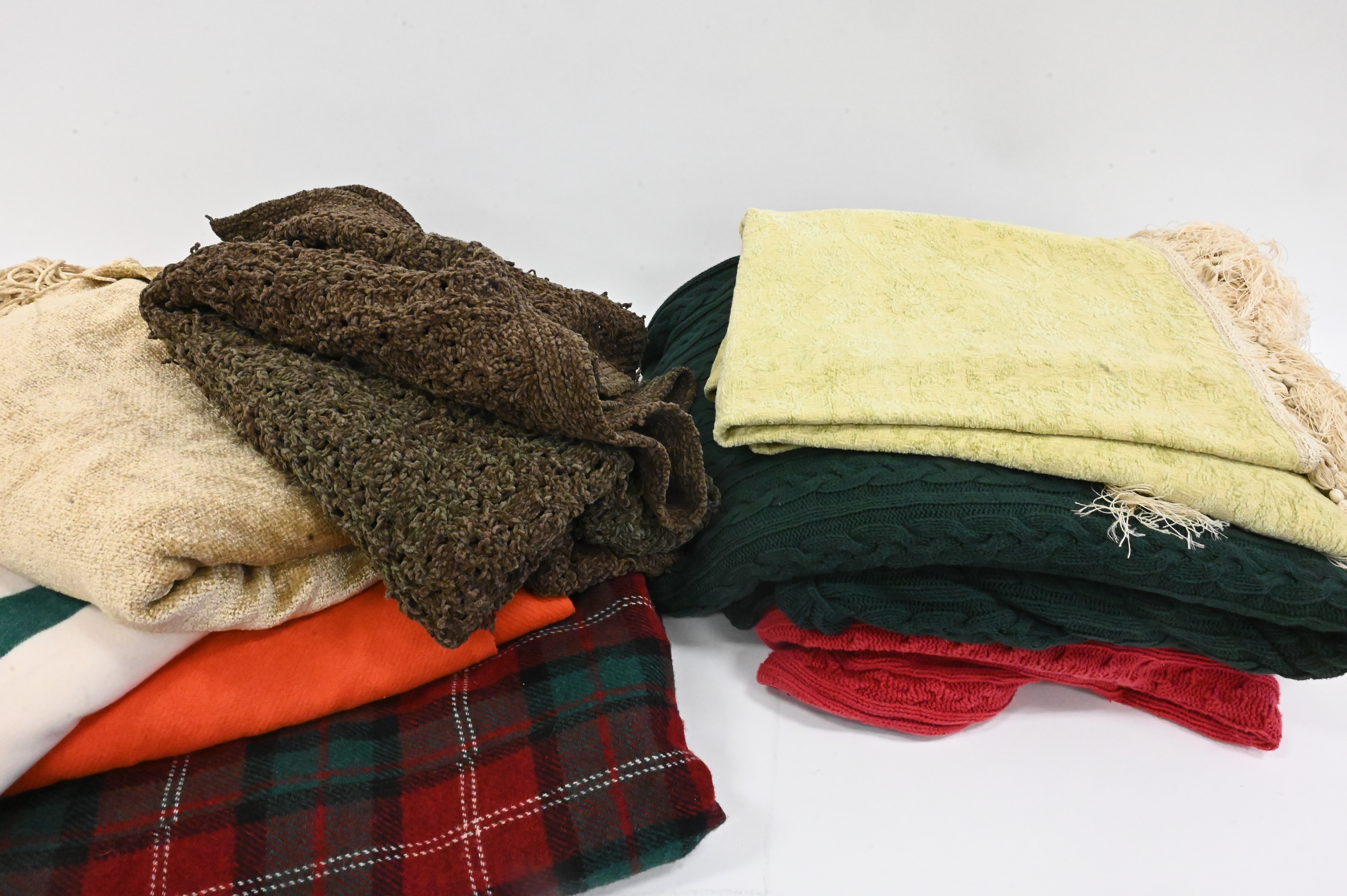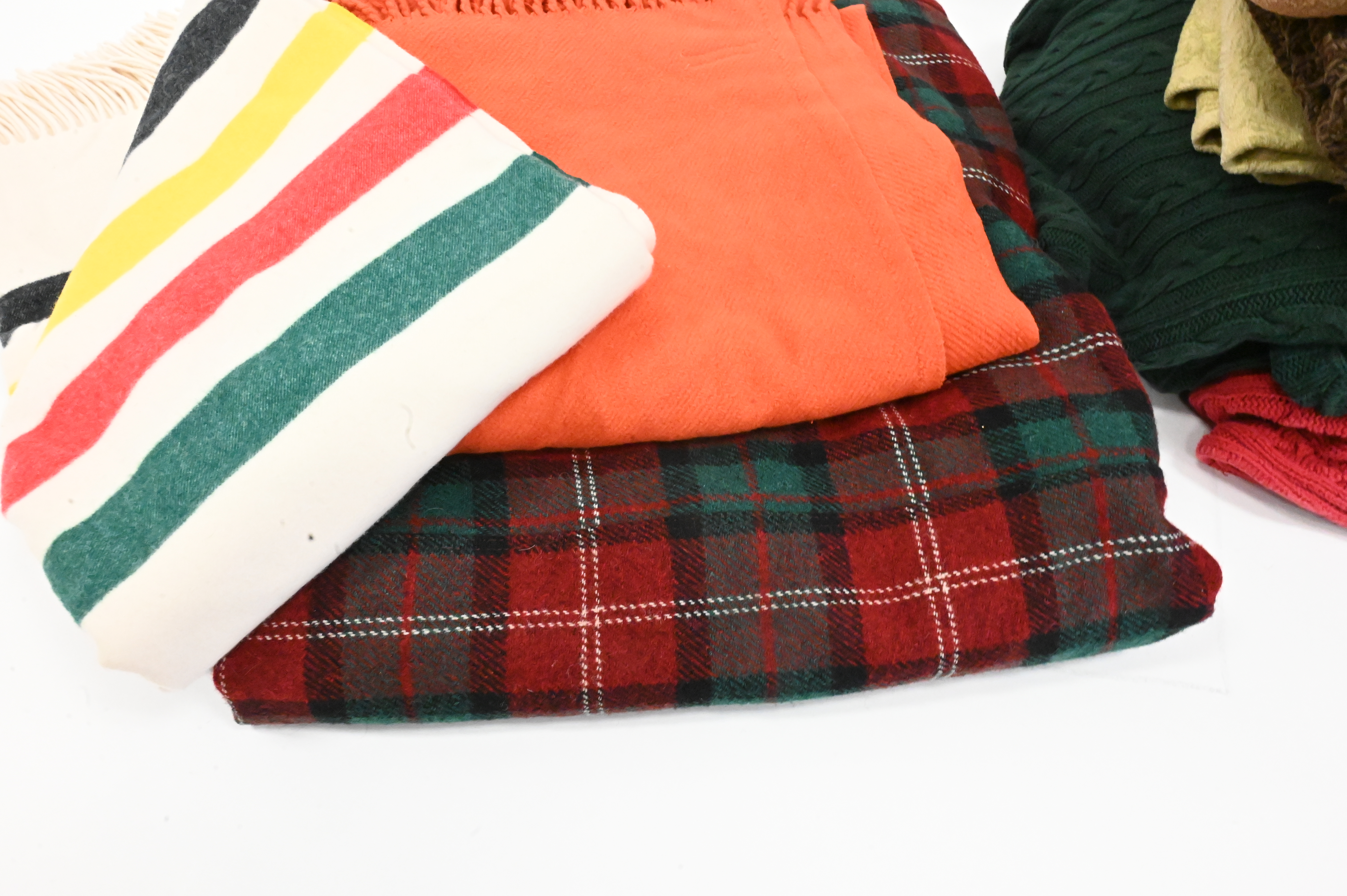 Group of Blankets, to include Harris Tweed blanket by Lexington Company having plaid pattern; Pendleton wool blanket; two Knitspiration, a Soft Idea throw blanket; ABC carpet; Maximilian fur and cashmere blanket; along with a red plaid duvet cover, twin size.