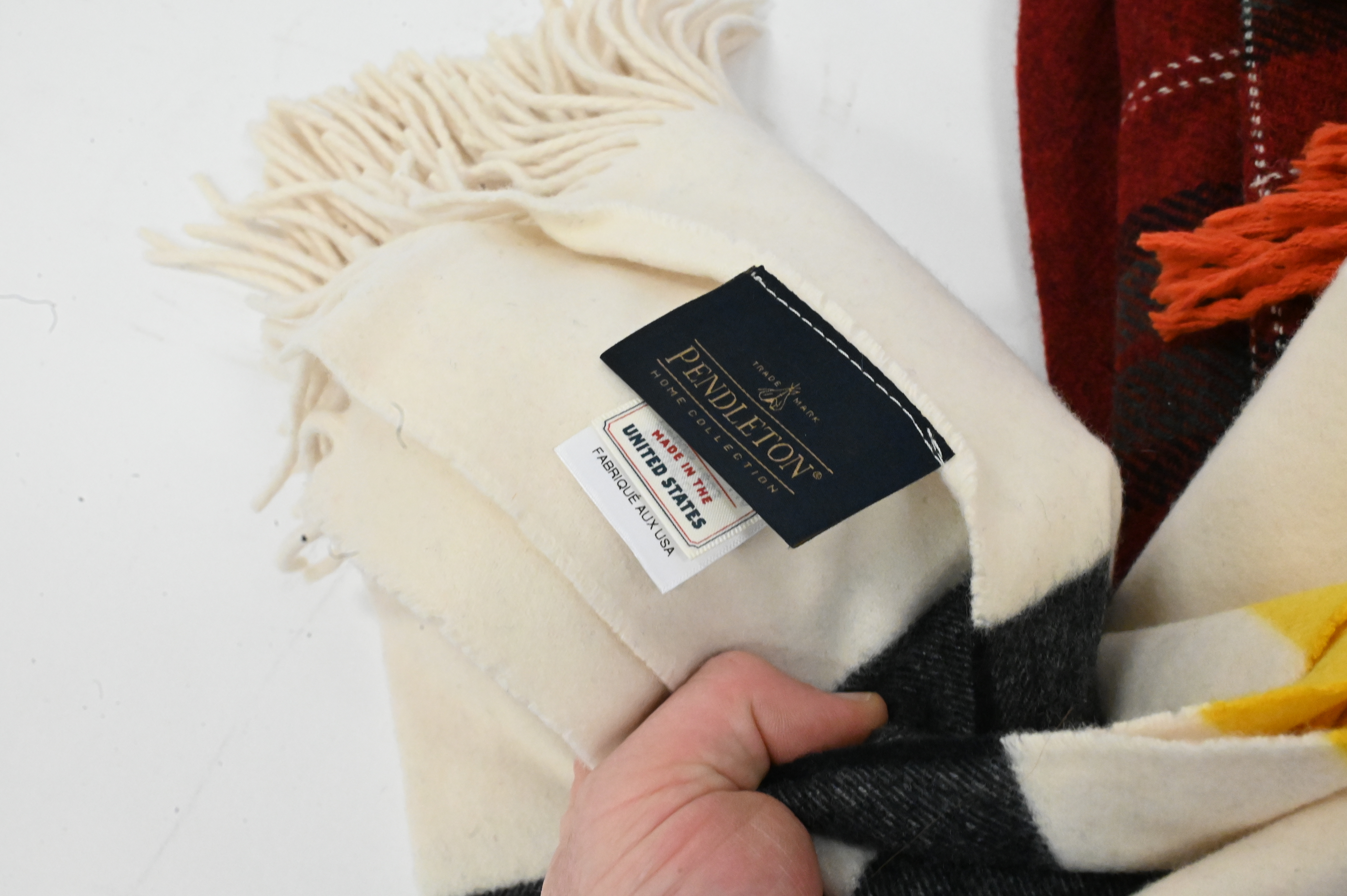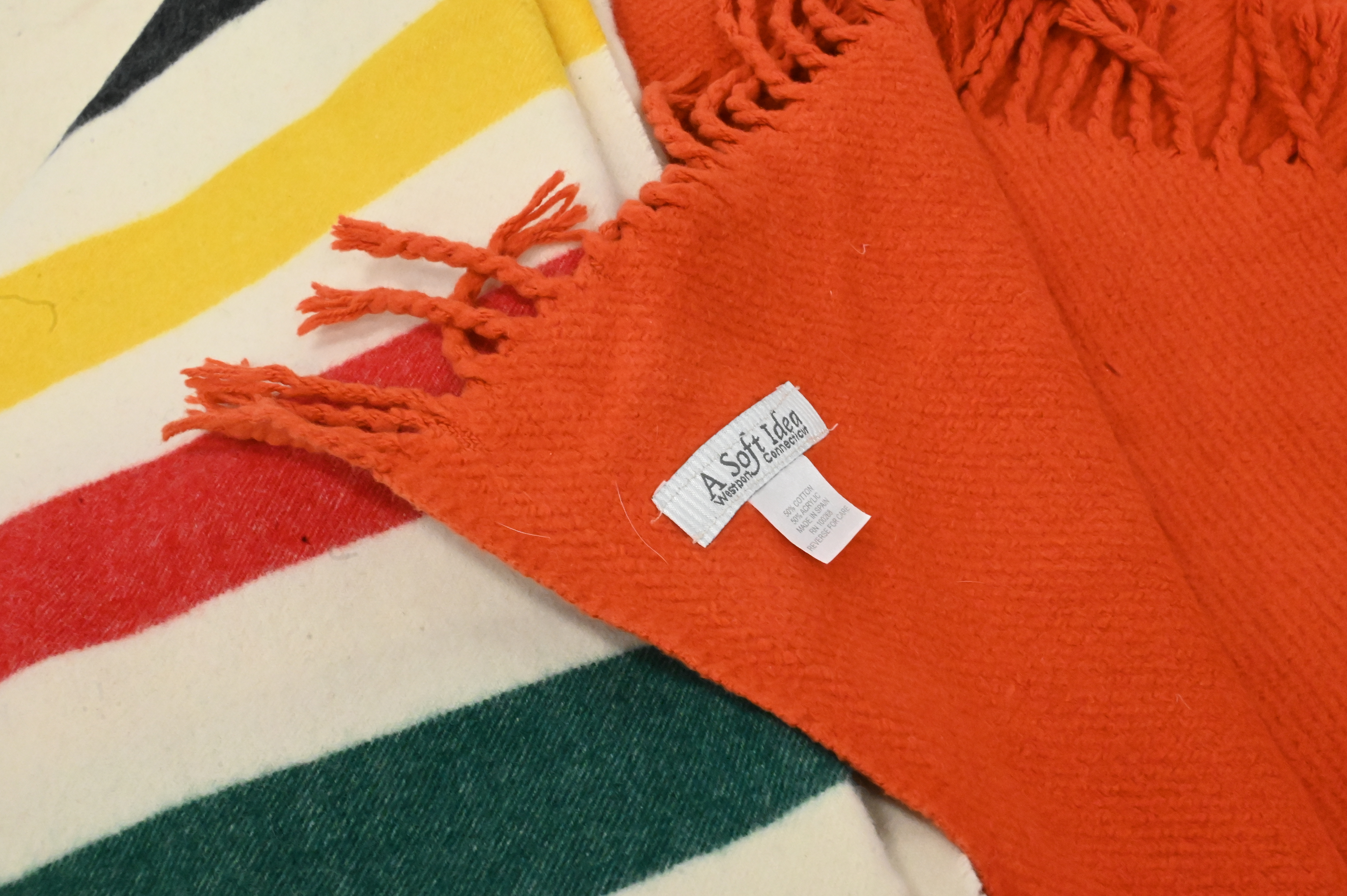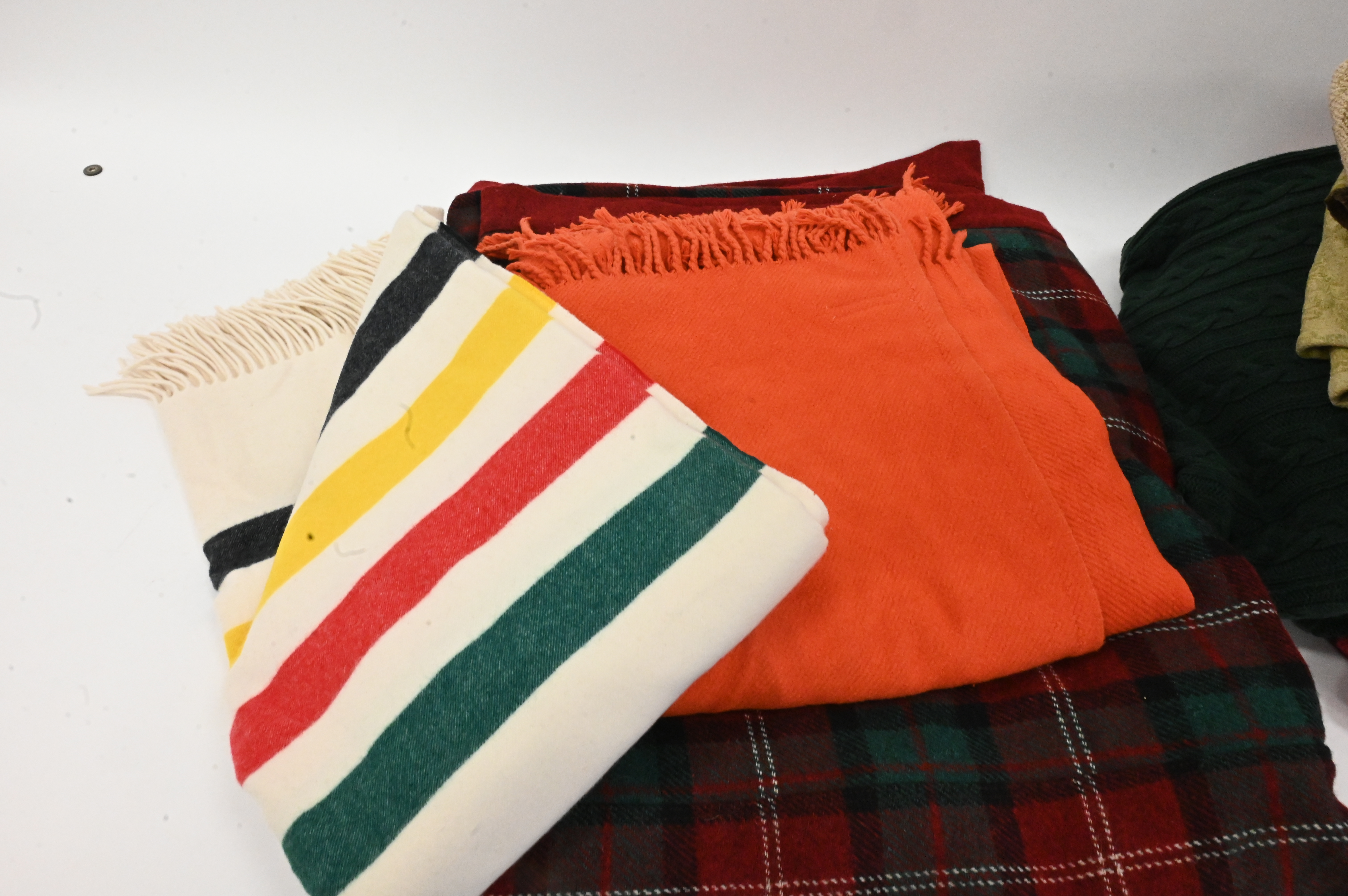 Group of Blankets, to include Harris Tweed blanket by Lexington Company having plaid pattern; Pendleton wool blanket; two Knitspiration, a Soft Idea throw blanket; ABC carpet; Maximilian fur and cashmere blanket; along with a red plaid duvet cover, twin size.