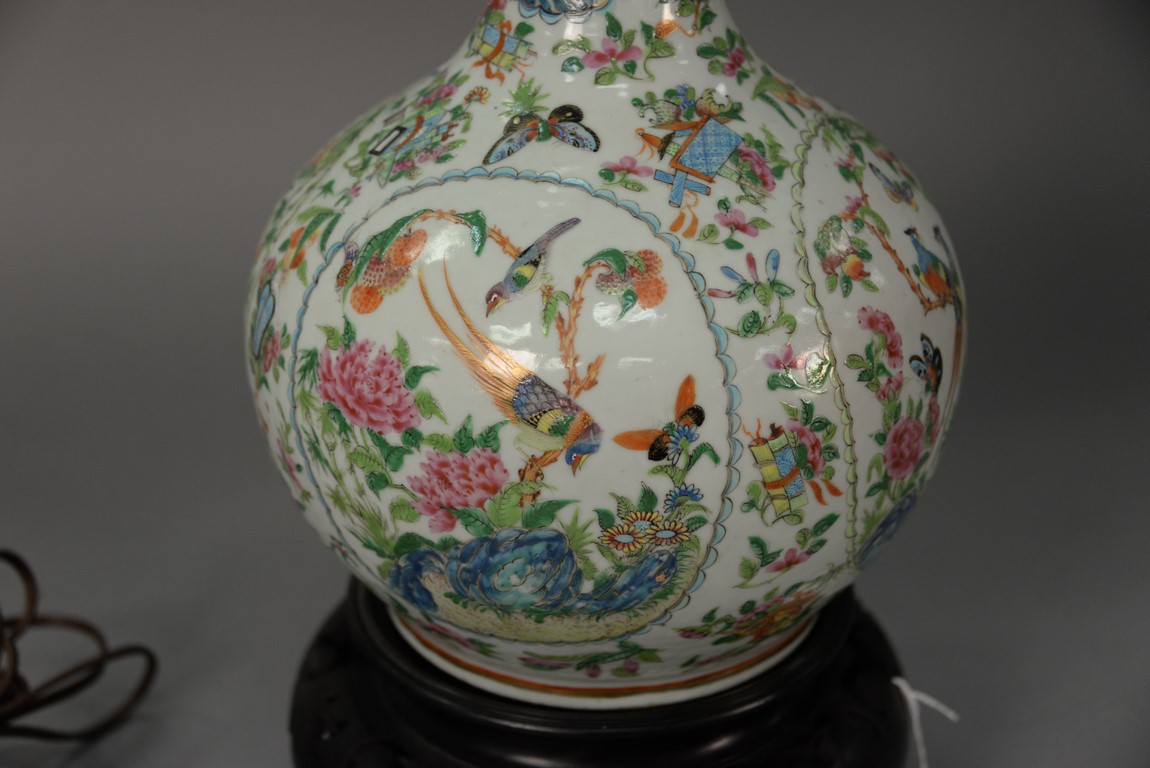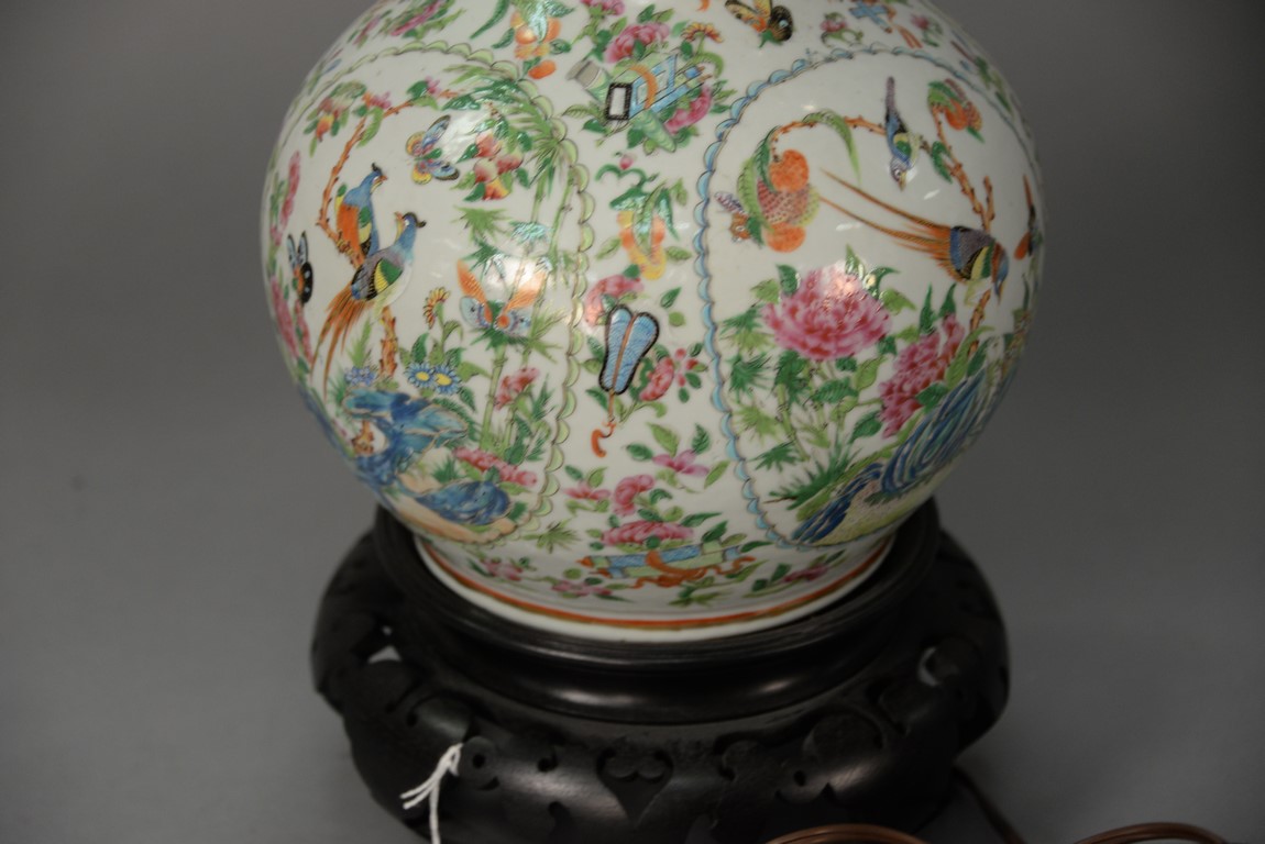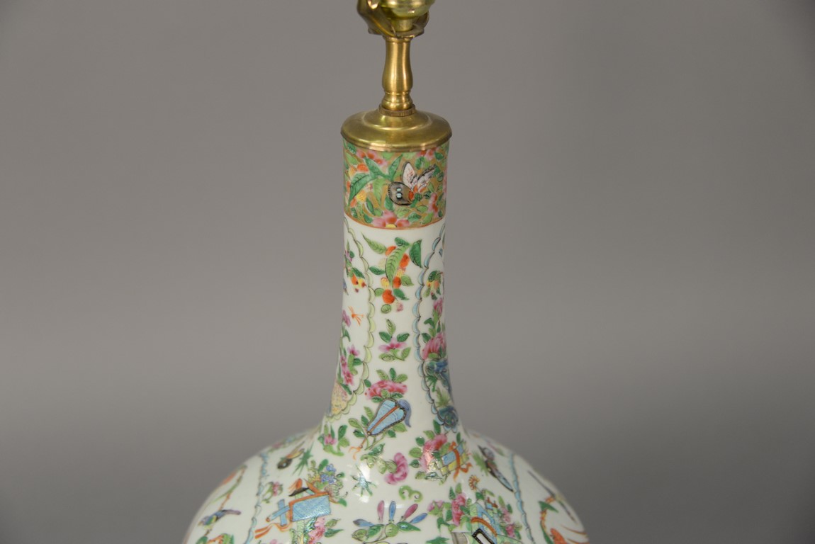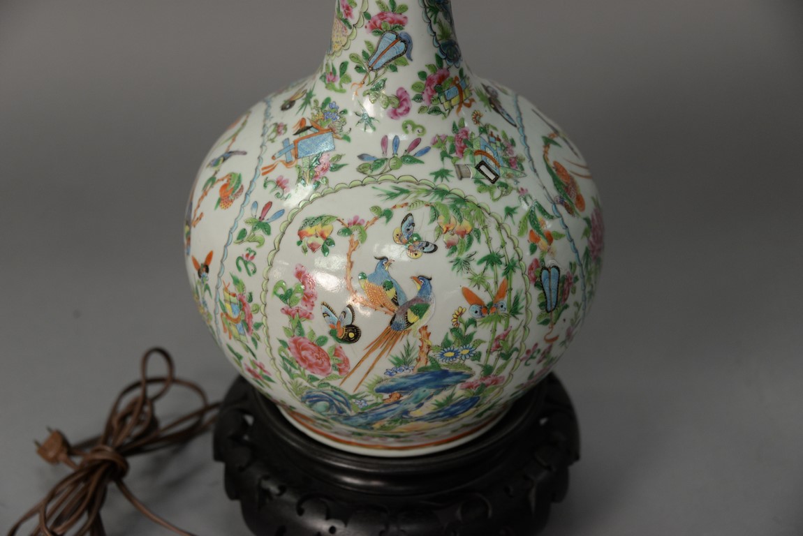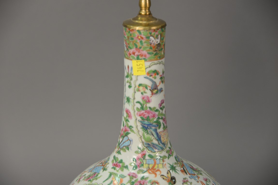 Lot 180: Large Famille Rose porcelain globular vase with long sleeve form neck and round painted panels on each side. vase ht. 15 1/2 in. total ht. 37 1/2 in.