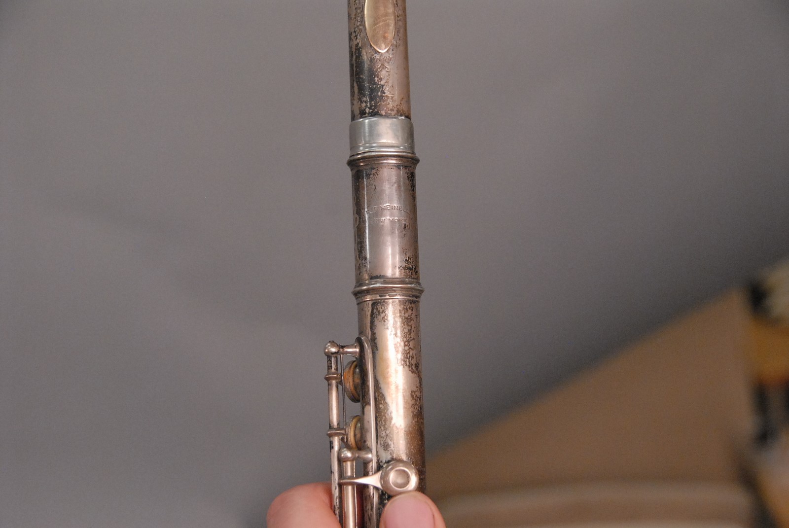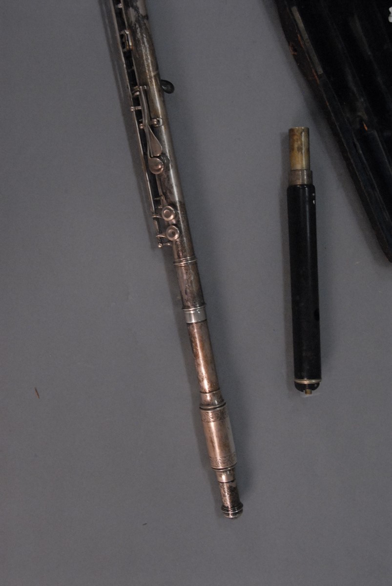 Lot 180: Meinell flute, silver and ebony with unmarked gold plaque marked W. R. Meinell New York, in original leather felt lined carrying case, near match to flute made for and used by Blind Tom, African American Musical Prodigy one small piece of ebony miss