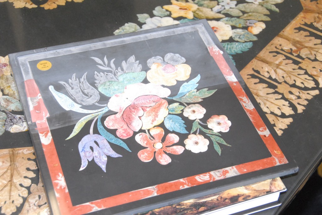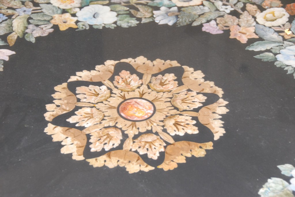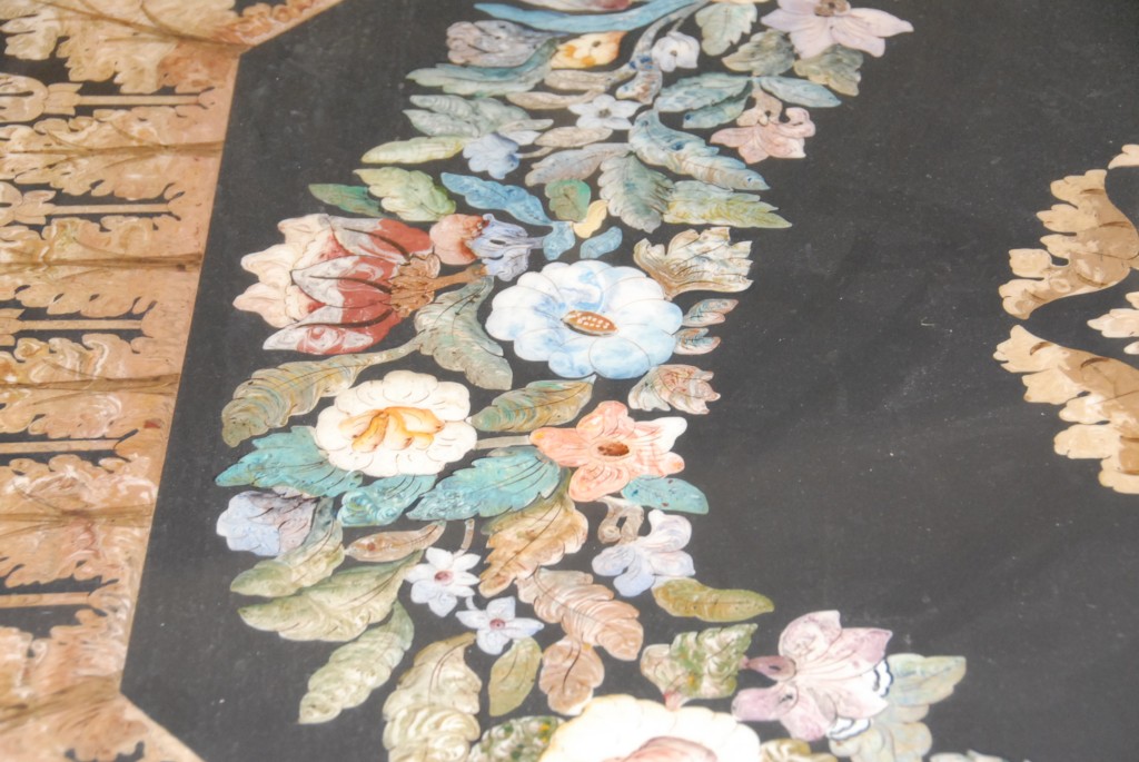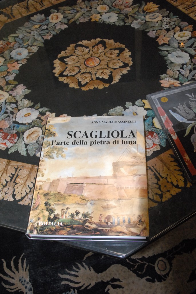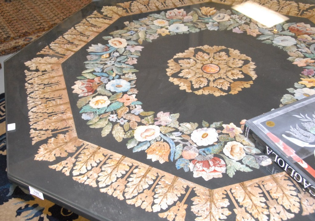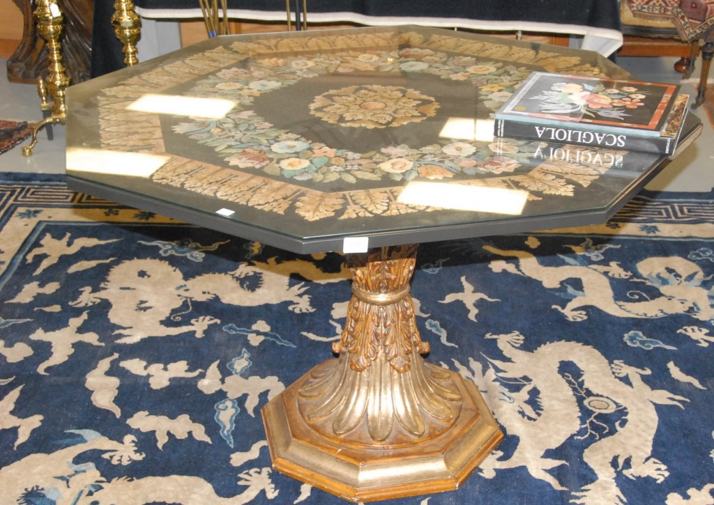 Scagliola octagon top table with custom glass top on carved pedestal base. height 31in. width 47in.