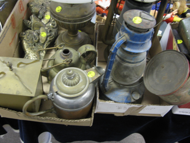 Three box lots of Primitive items including two iron soldier door stops, sad irons, planters, oil lamp, brass fish wall plaque and miscellaneous.