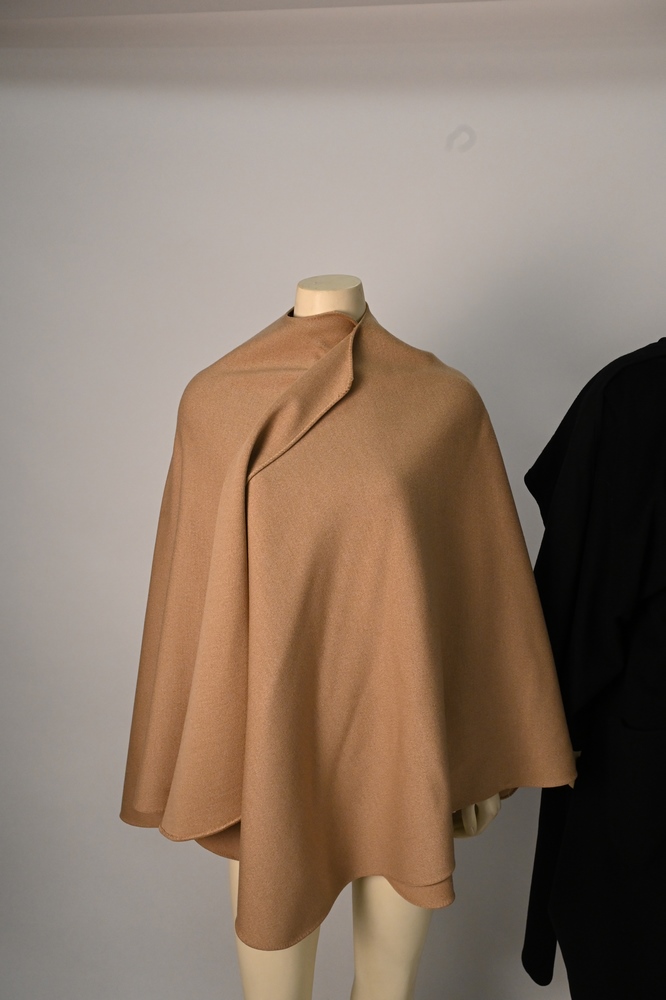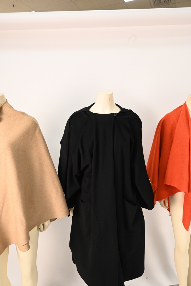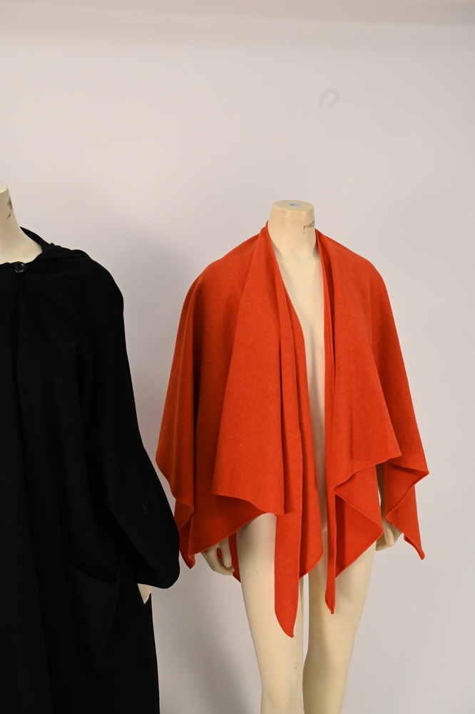 Lot 180: Three Wool Wraps, to include a black wool/cashmere blend cape by Hourihan; orange wool wrap; along with a tan wool wrap; one size, g…