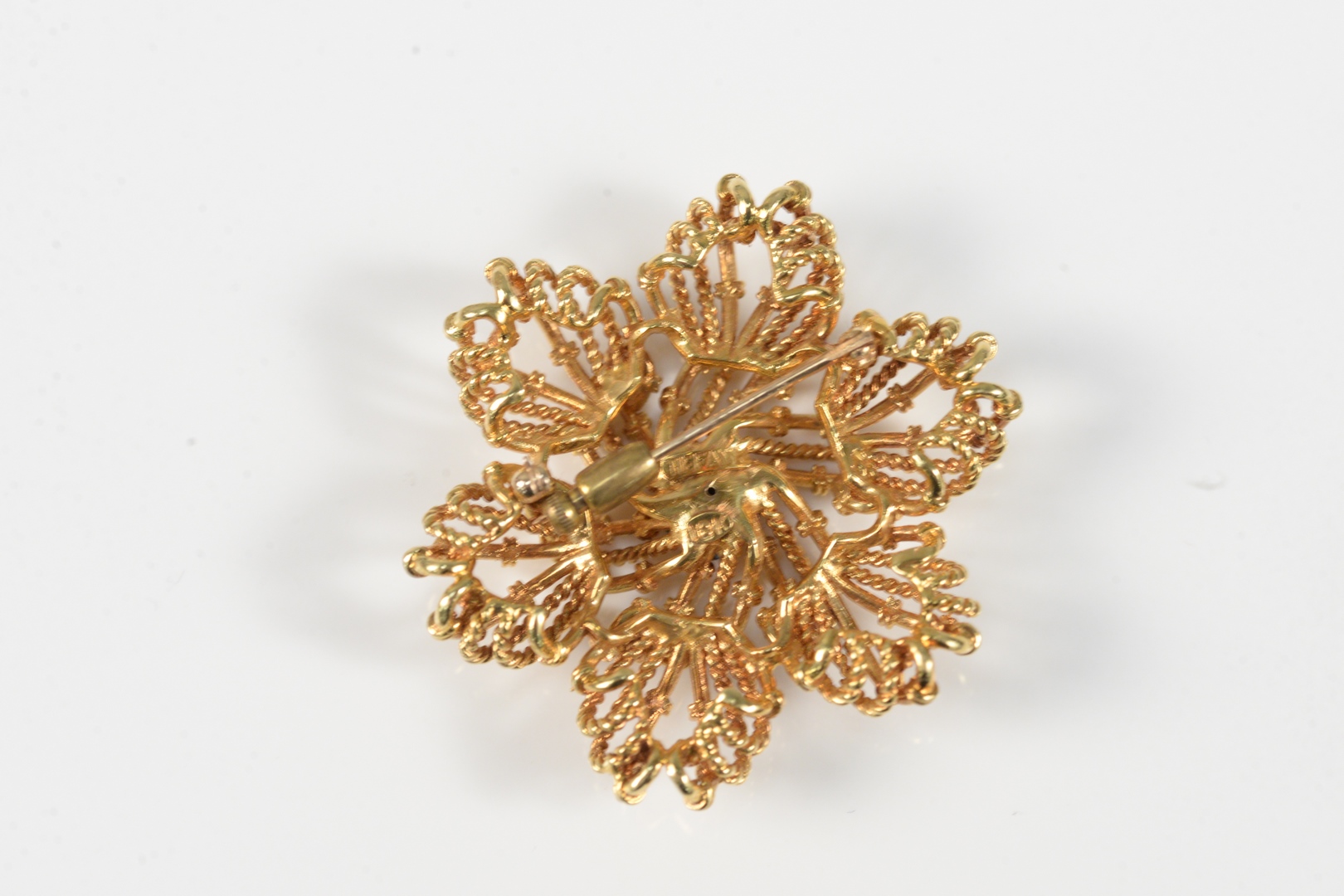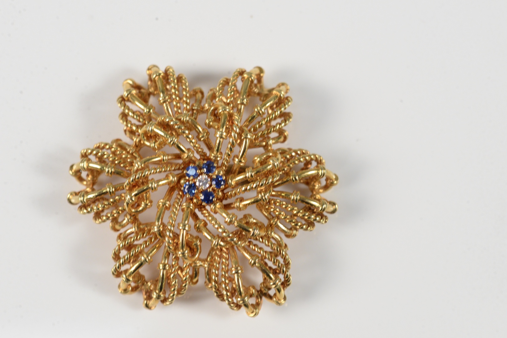 Lot 180: Tiffany & Company 18 Karat Gold Brooch set with five blue sapphires, and one diamond diameter 2 inches 35 grams
