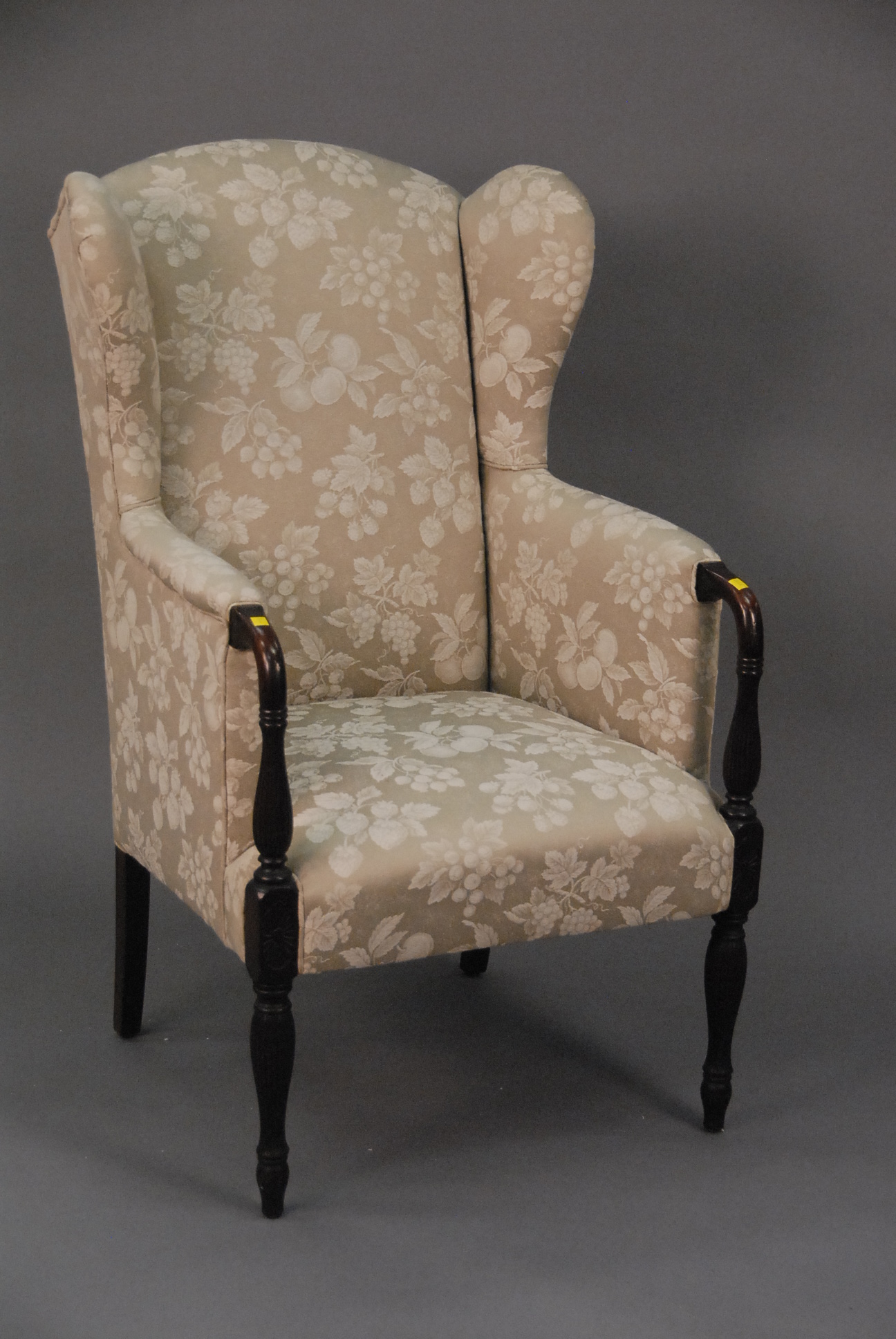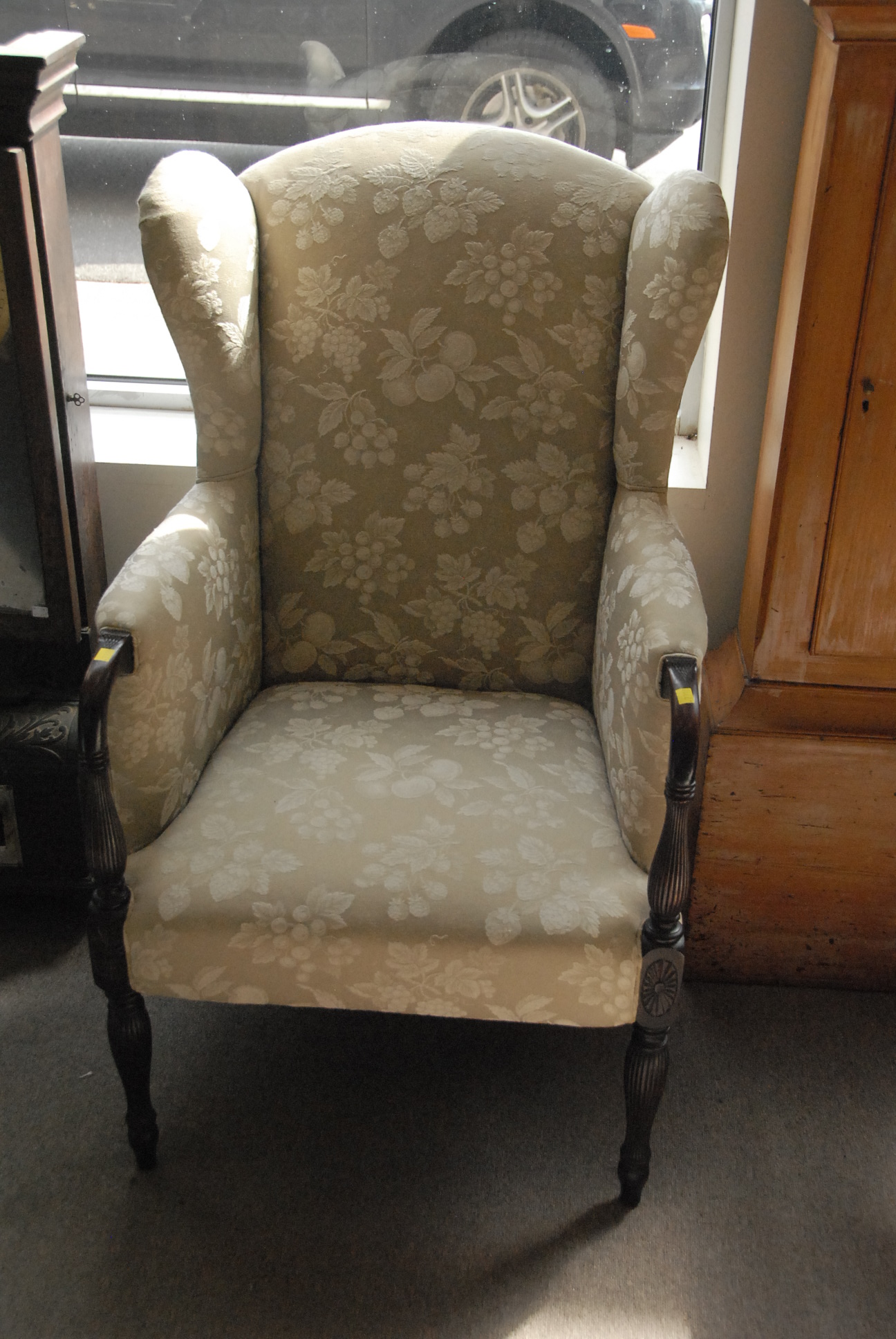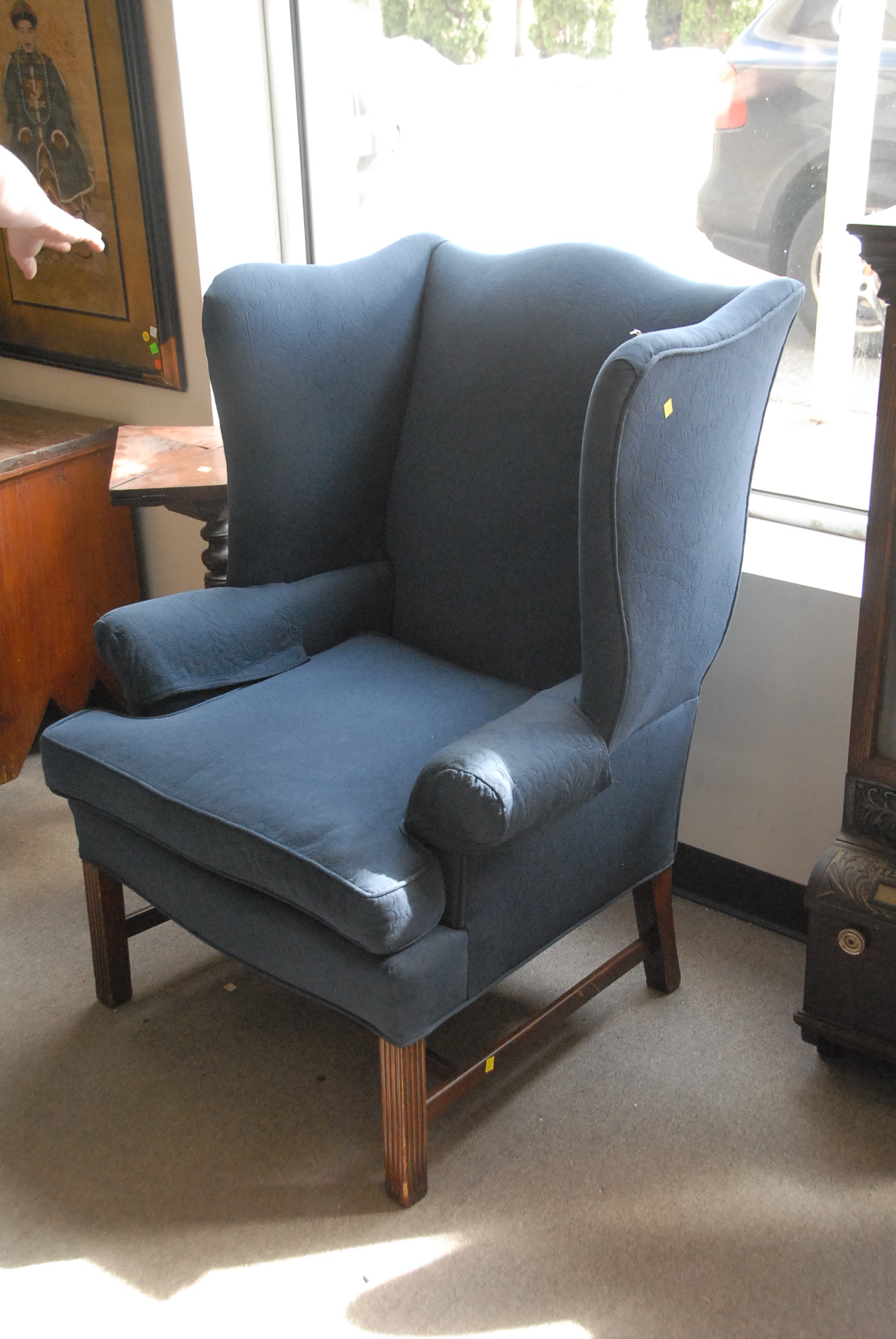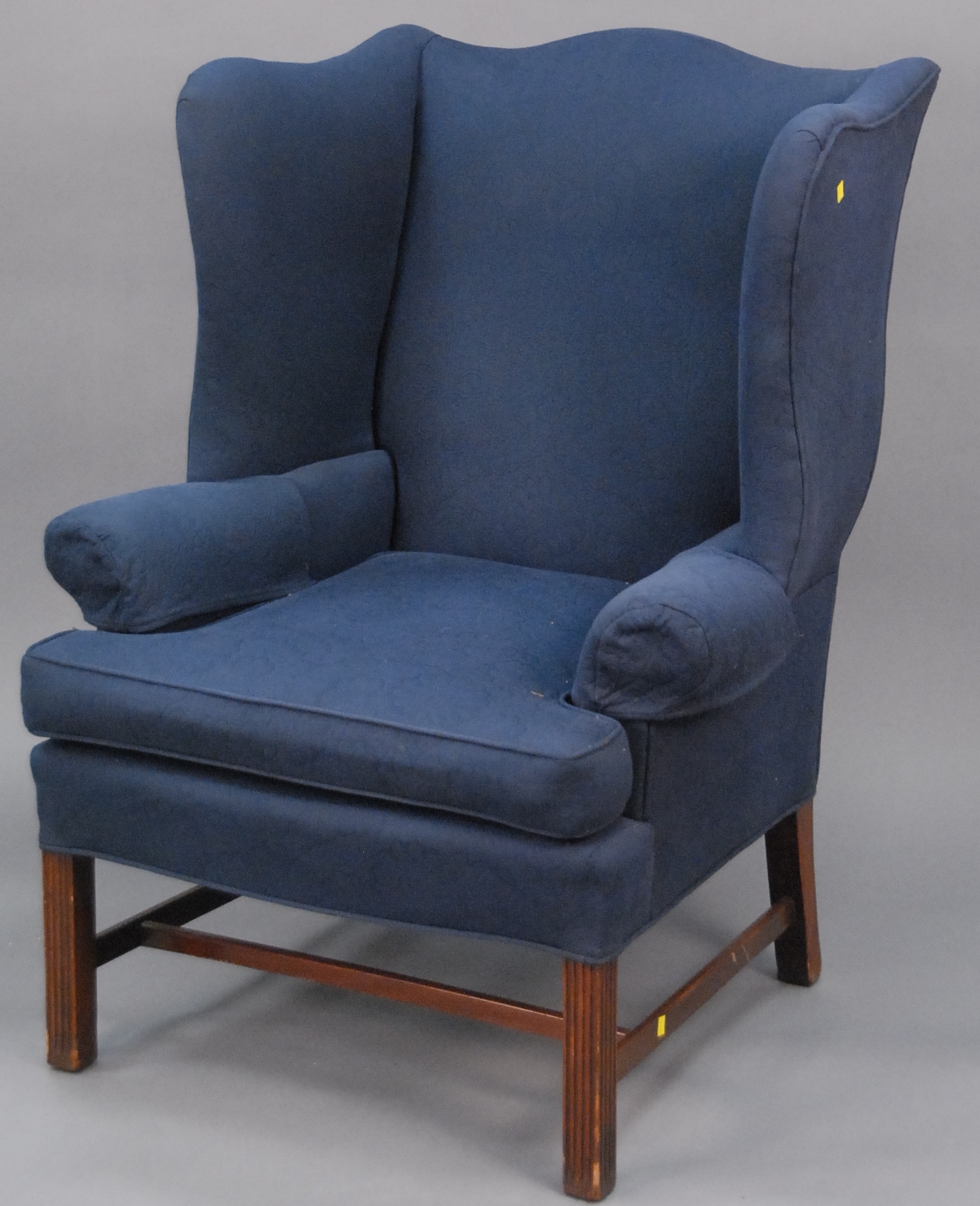 Two chairs including a Chippendale style upholstered wing chair and Sheraton style upholstered wing chair.