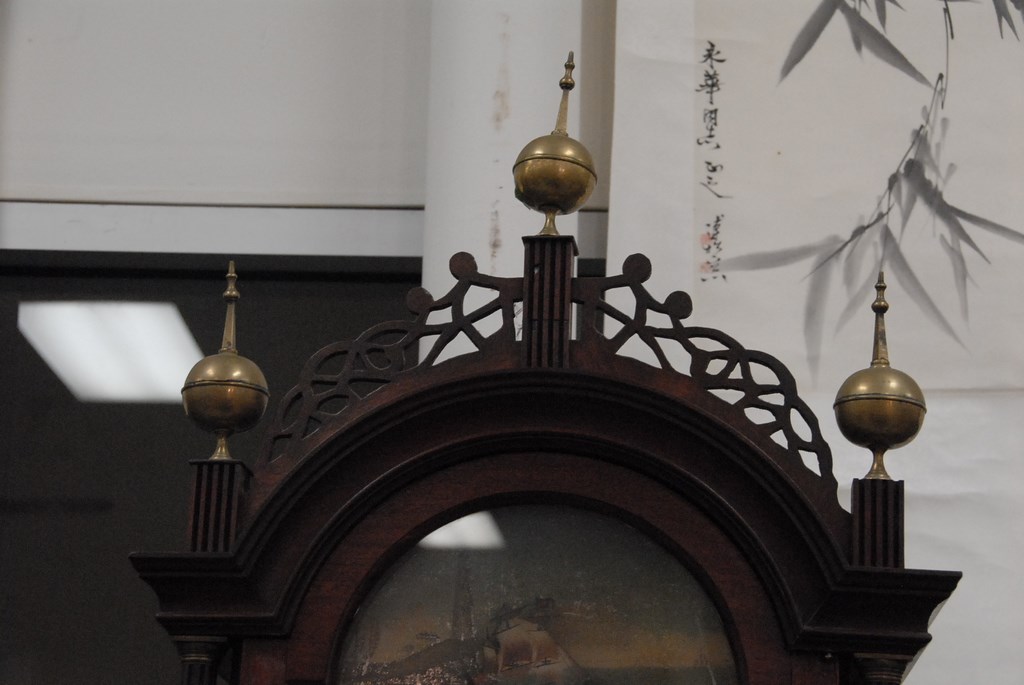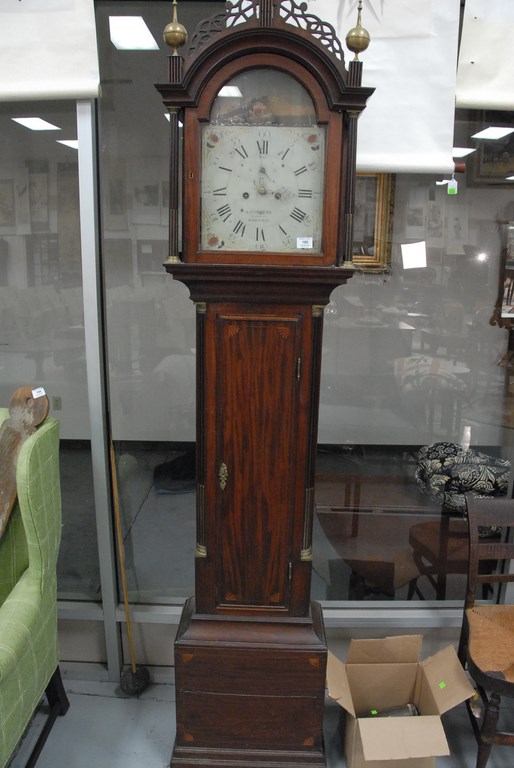 Lot 180: W. Cummens mahogany tall case clock, case with fret work top and three brass finials over tombstone glass, flanked by brass stop fl…