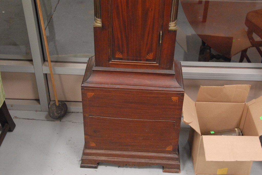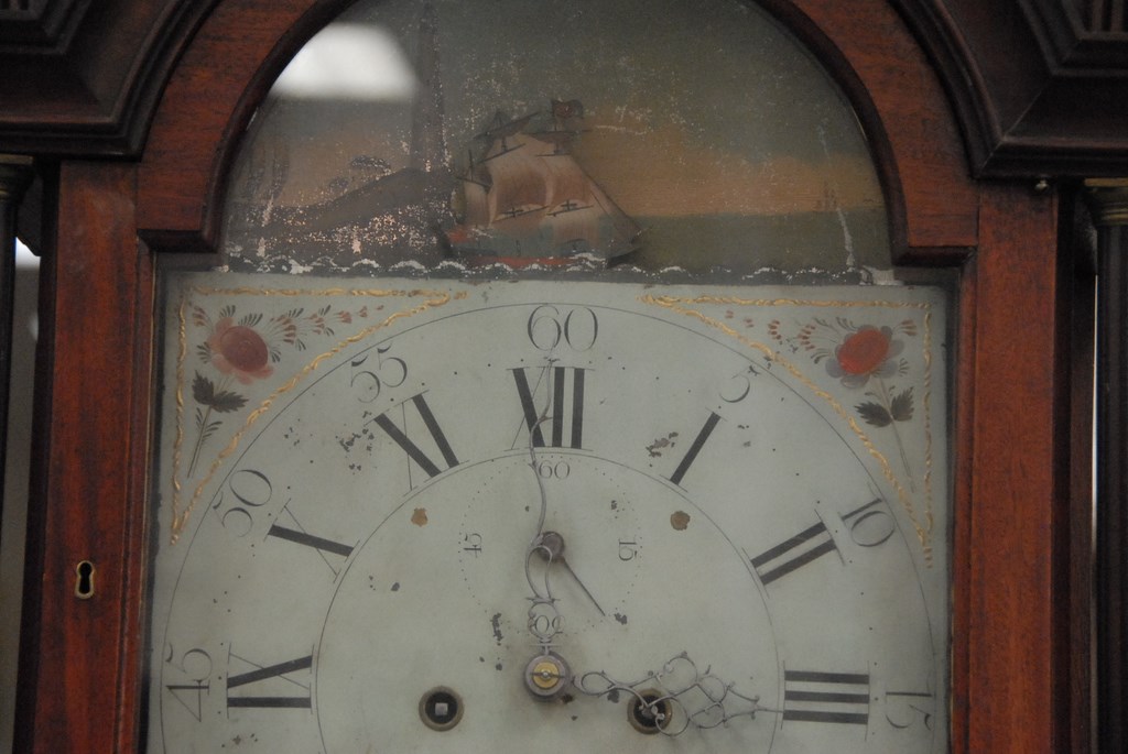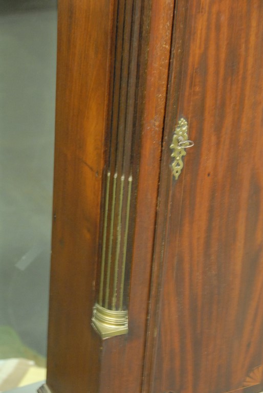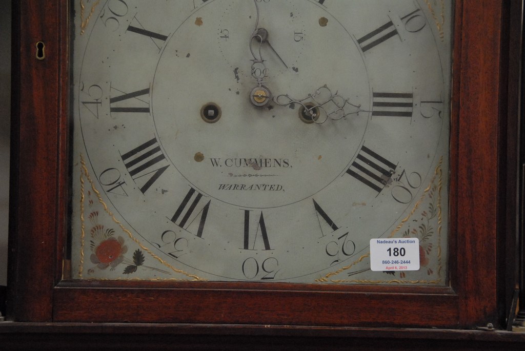W. Cummens mahogany tall case clock, case with fret work top and three brass finials over tombstone glass, flanked by brass stop fluted quarter columns on case with long molded door with fan inlays flanked by brass stop fluted quarter columns all set on base with fan inlays on bracket feet, dial with rocking ship brass works, dial signed W. Cummens warranted. ht. 93in. wd. 18in. dp. 9in.