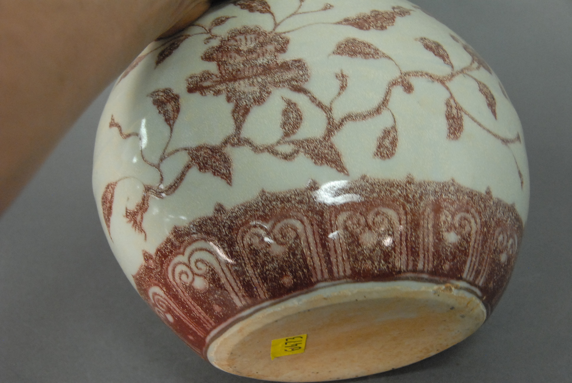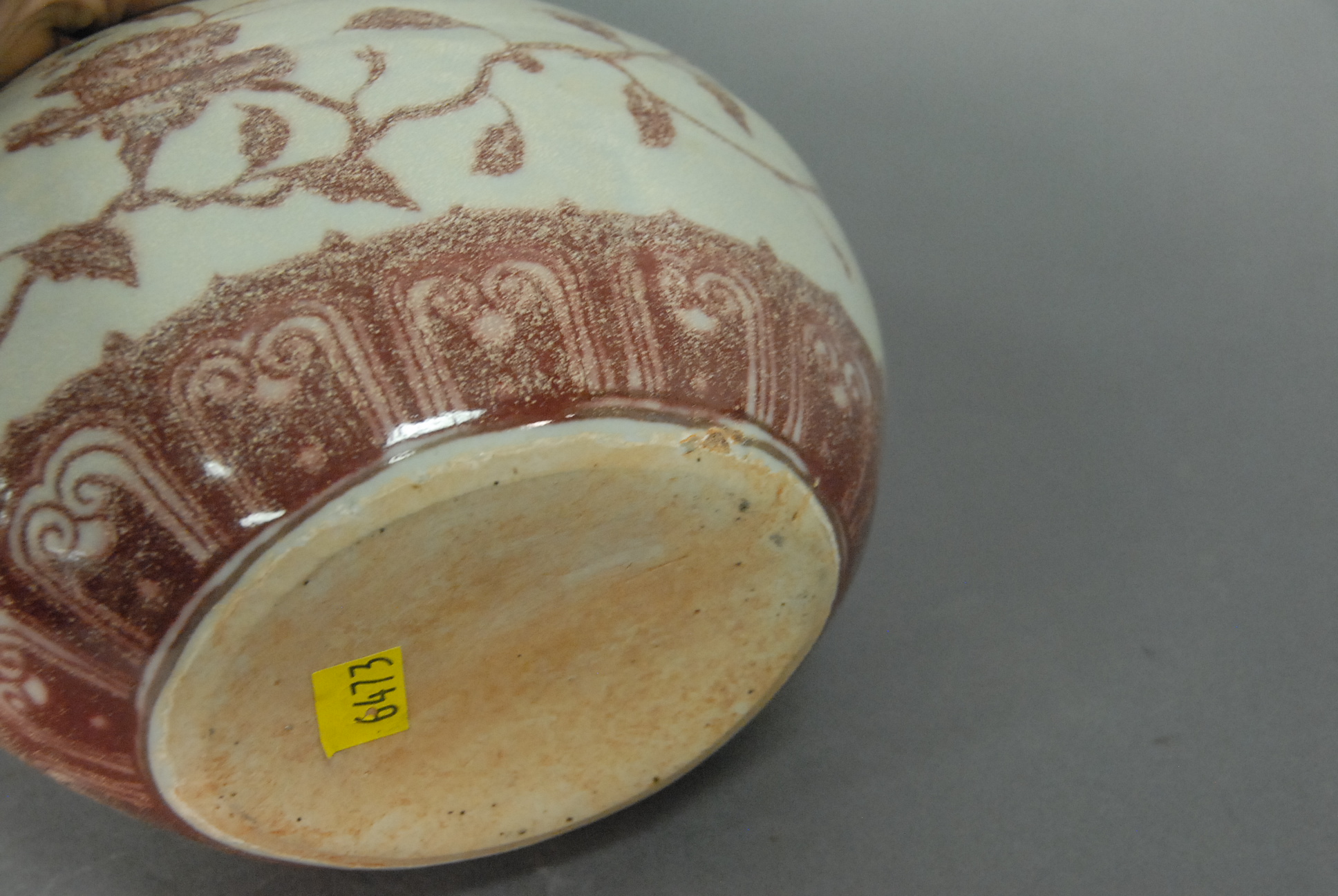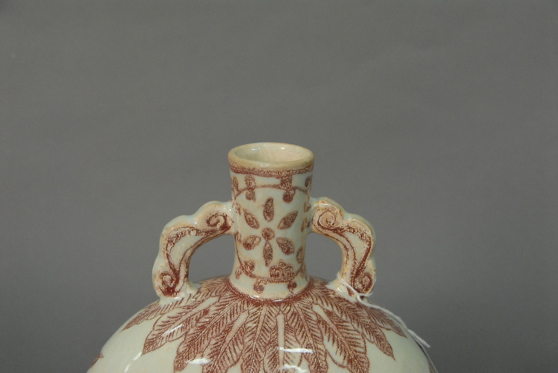 White and iron red glazed moon flask with molded handles, ht. 11 1/2in.