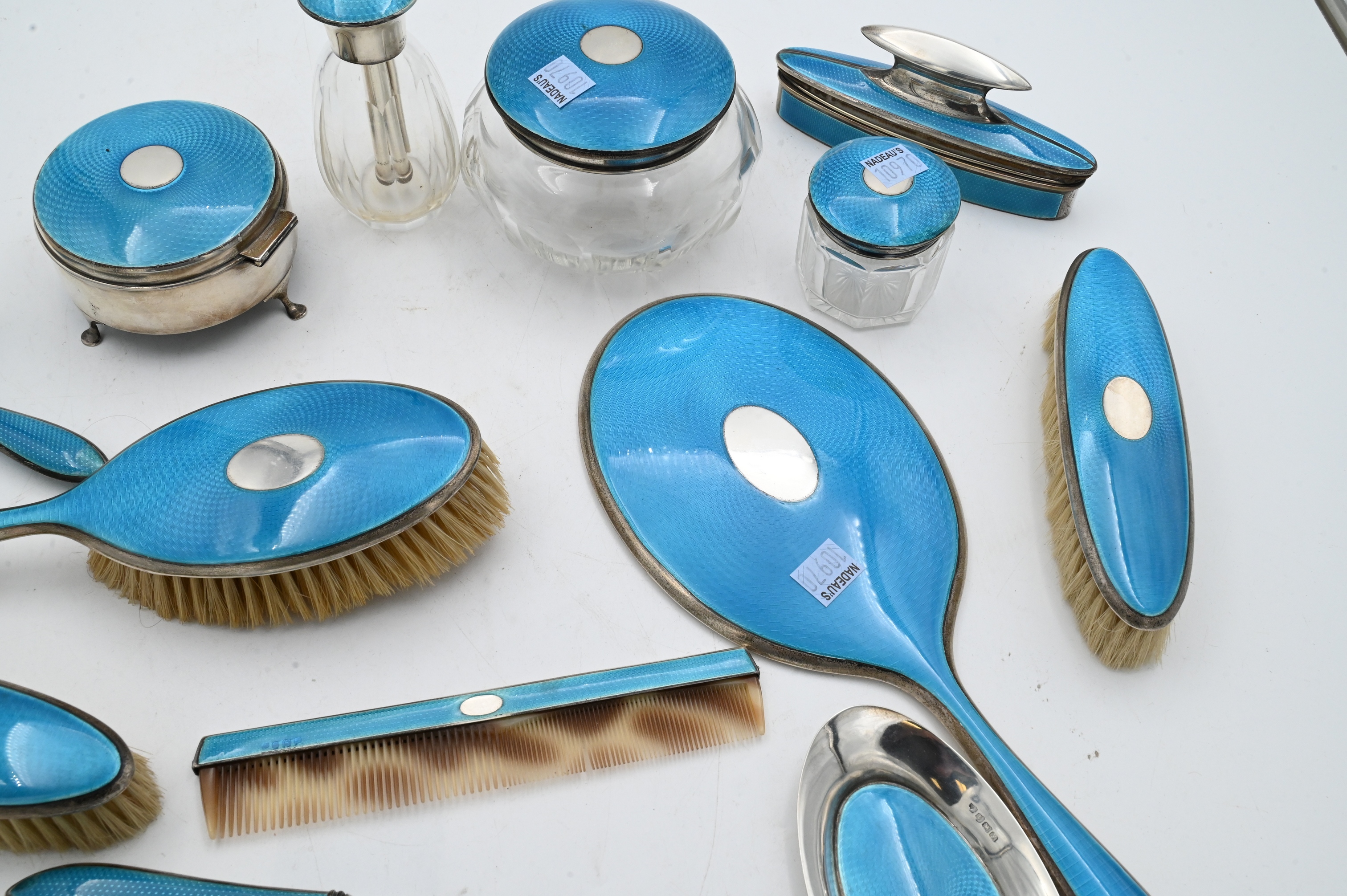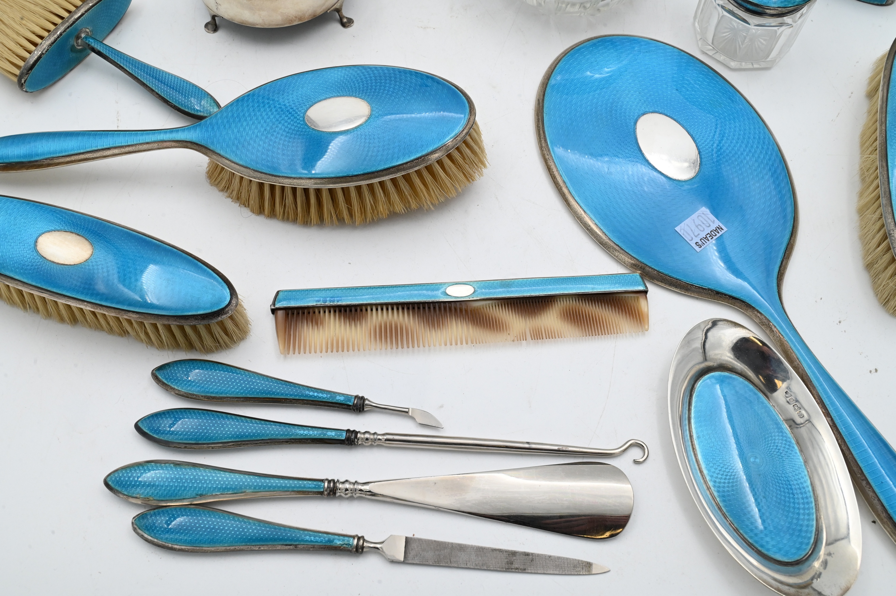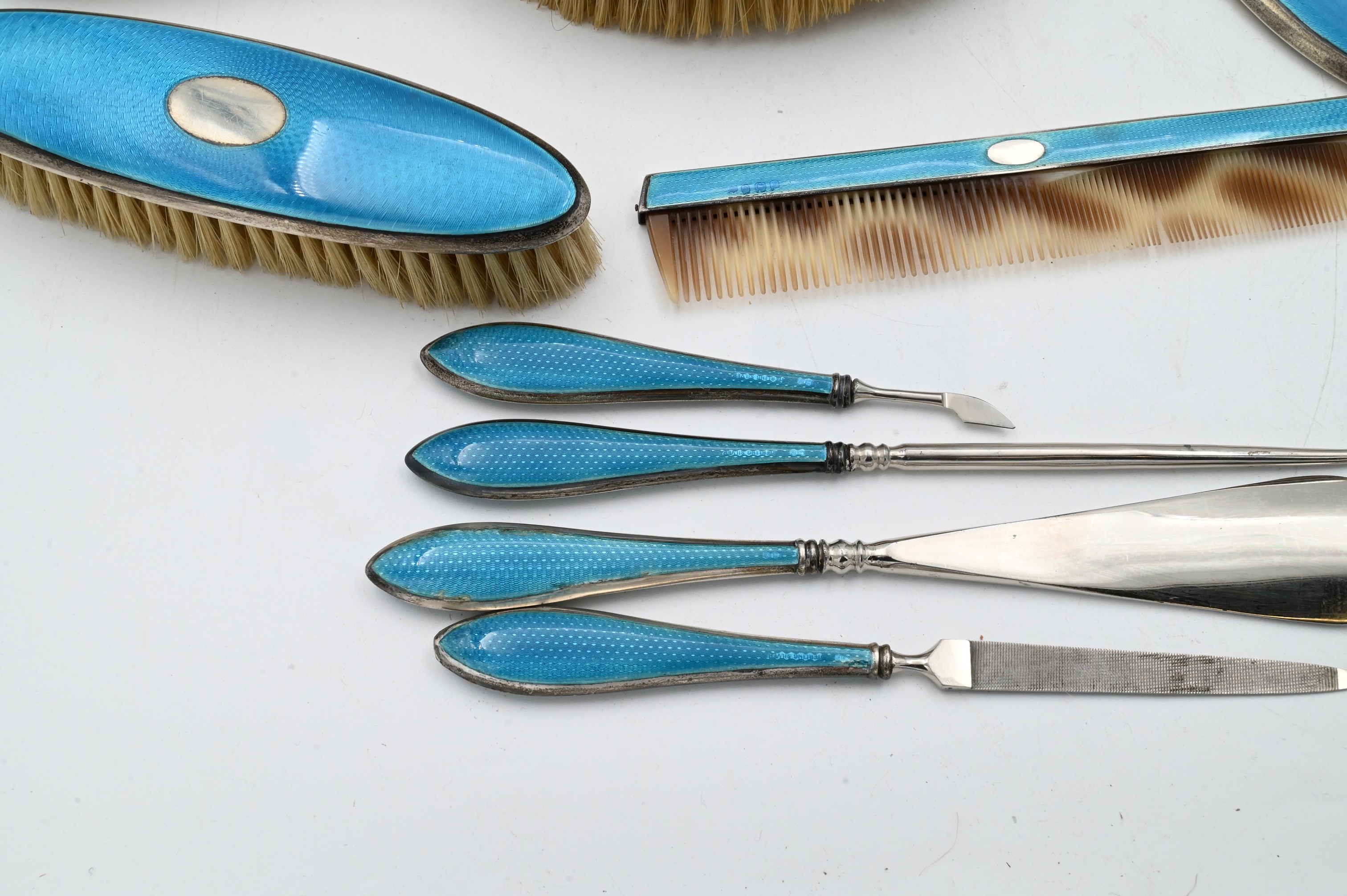 16 Piece Art Deco Sterling Silver Guilloche Turquoise Vanity Set to include