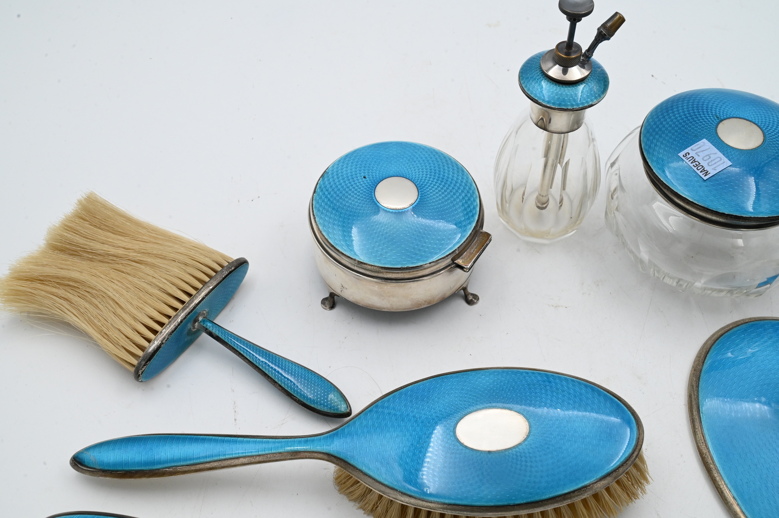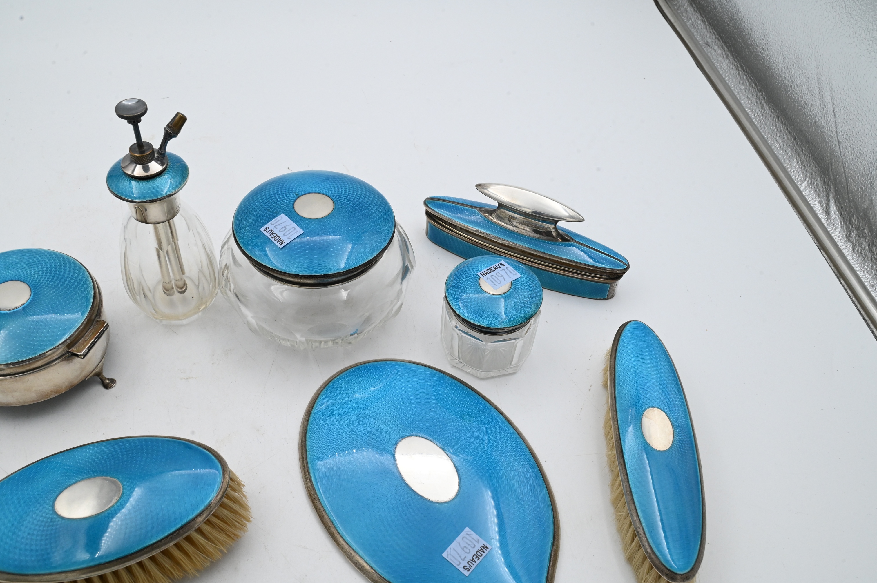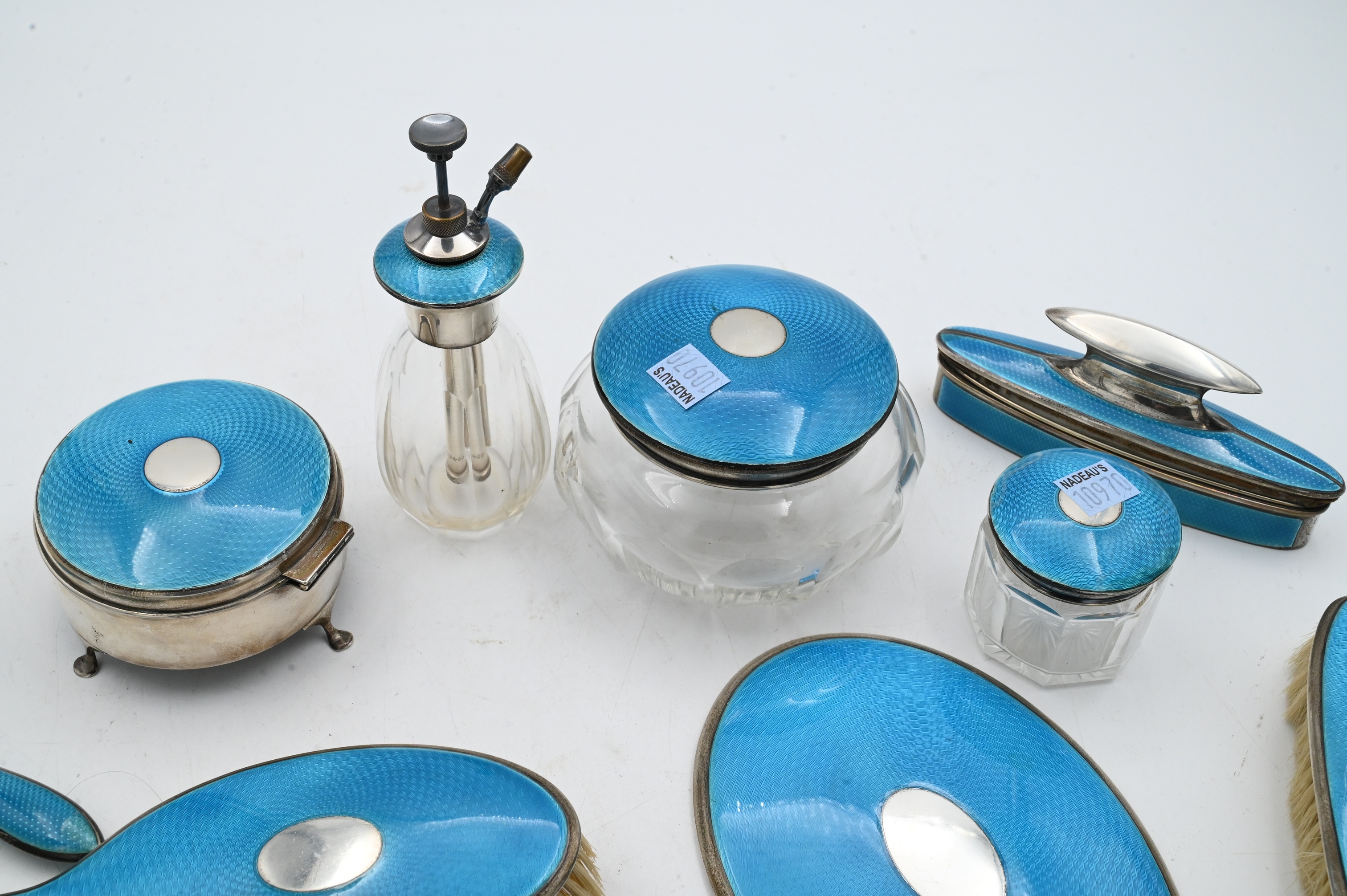 16 Piece Art Deco Sterling Silver Guilloche Turquoise Vanity Set to include