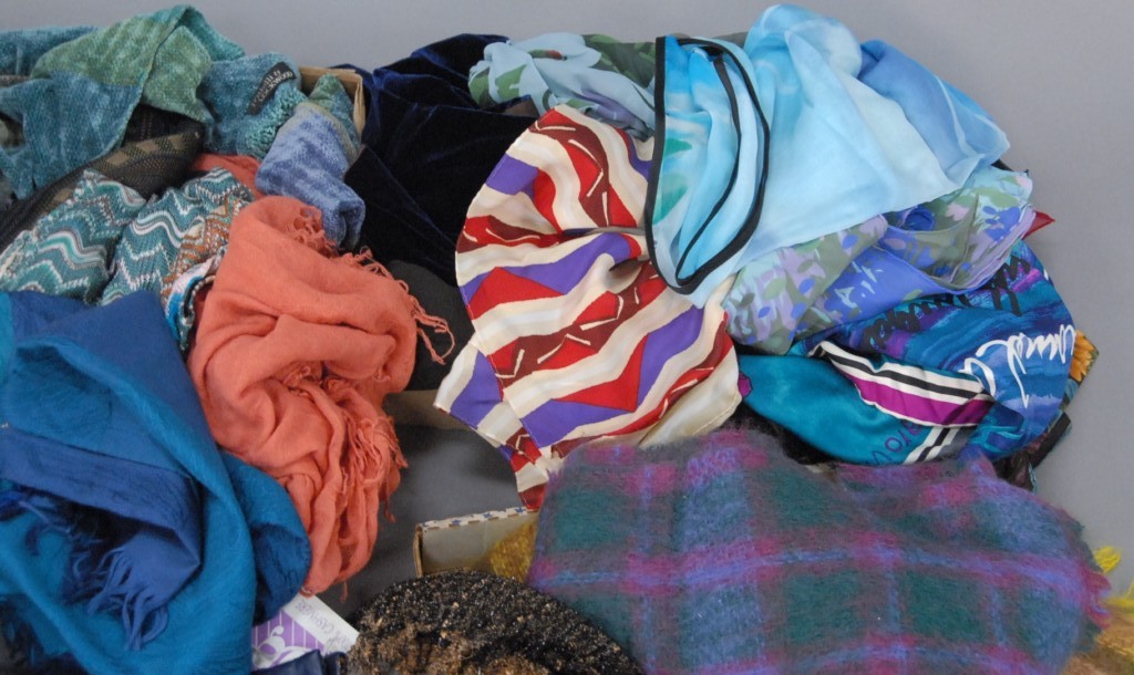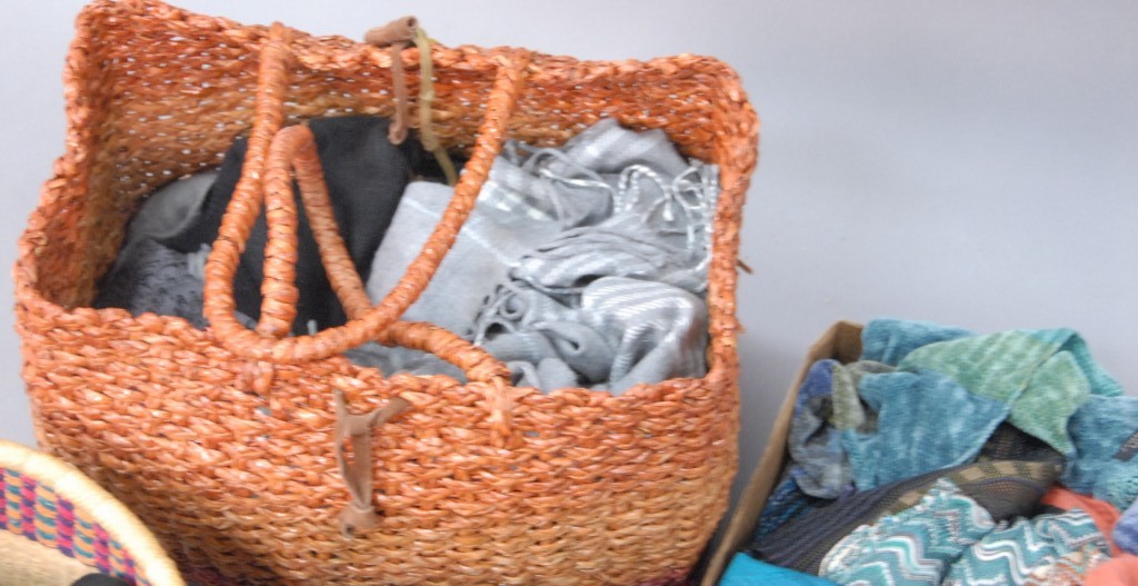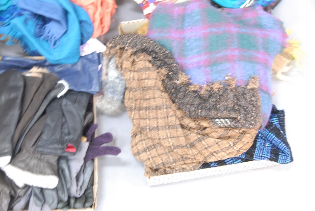 Lot 181: Approximately 40 scarves Ellen Tracy, Talbots, Ungaro, Buchman, Jameson Wool, two baskets, and a box of gloves and mittens along wi…