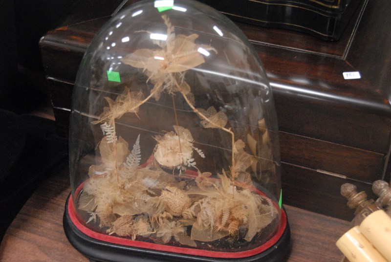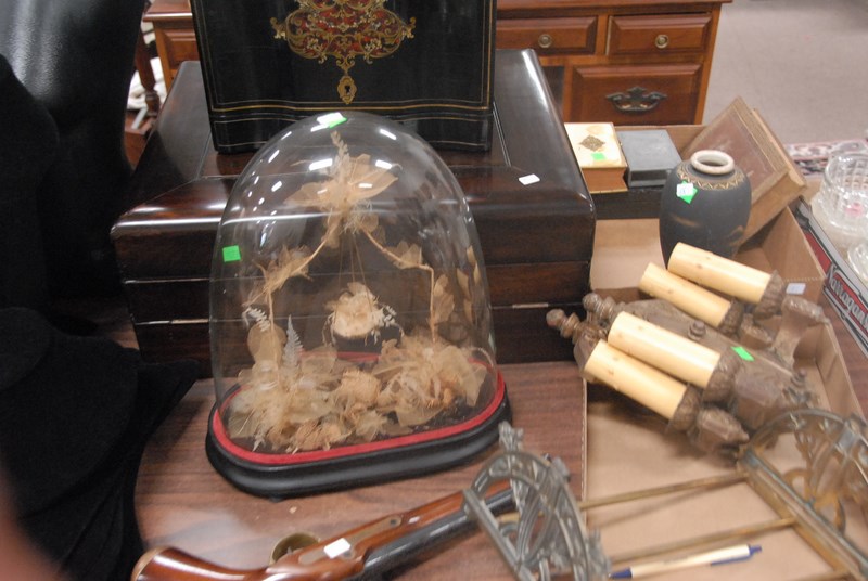 Cellarette case only along with pair of sconces, bookends, Japanese vase, several books, silver box, decorative leaf design under glass dome, and reproduction flint lock pistol.