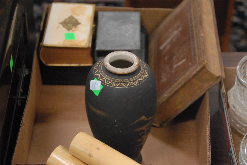 Lot 181: Cellarette case only along with pair of sconces, bookends, Japanese vase, several books, silver box, decorative leaf design under…