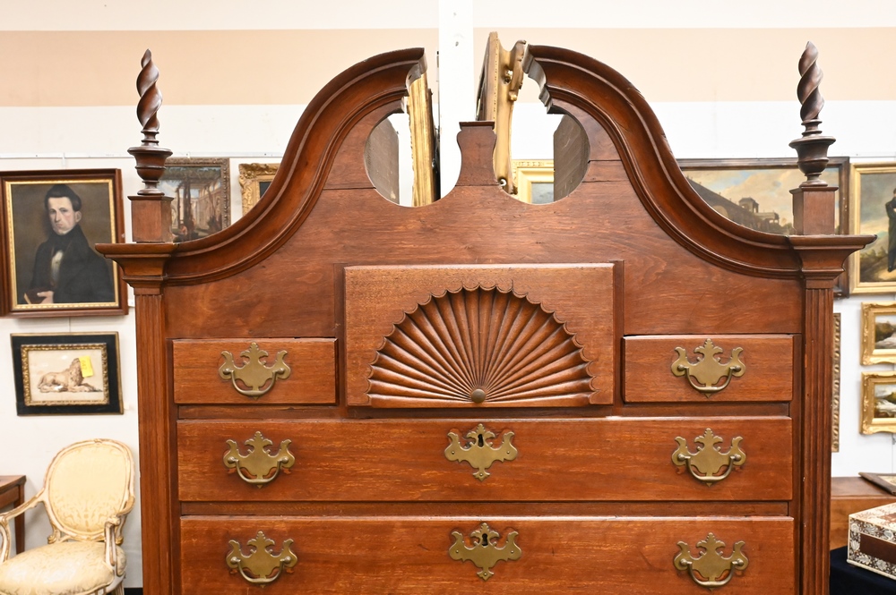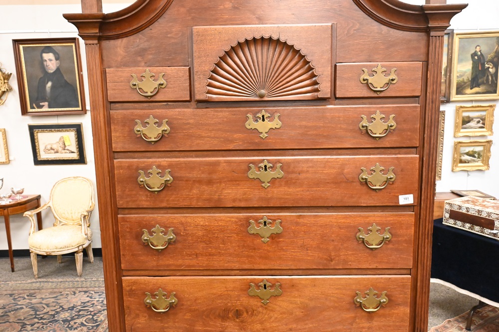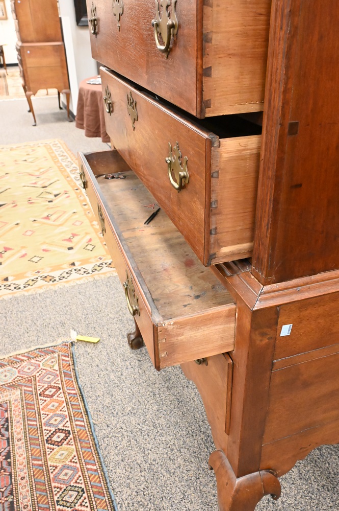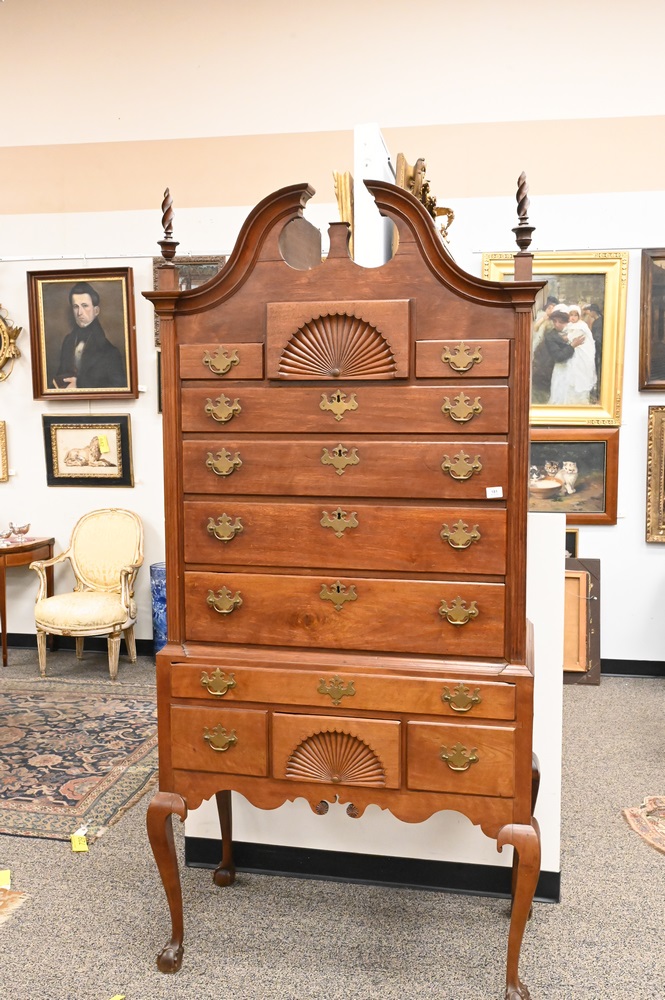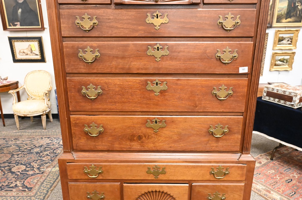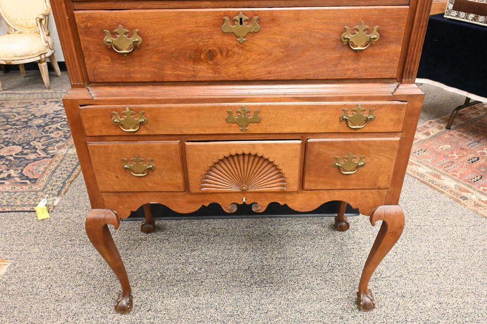 Lot 181: Chippendale Walnut Highboy, in two parts, upper section with bonnet top over three short drawers, over four drawers, having fan carved center drawer, all flanked by fluted pilasters on lower section with one drawer over three drawers, fan carved center drawer, over scalloped skin with carved pinwheels set on cabriole legs, ending in ball and claw feet, height 84 inches, width 37 1/2 inches. Provenance: Estate of Florence Yannios, Cheshire, CT.