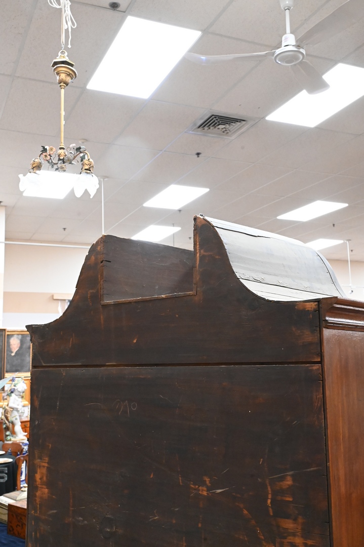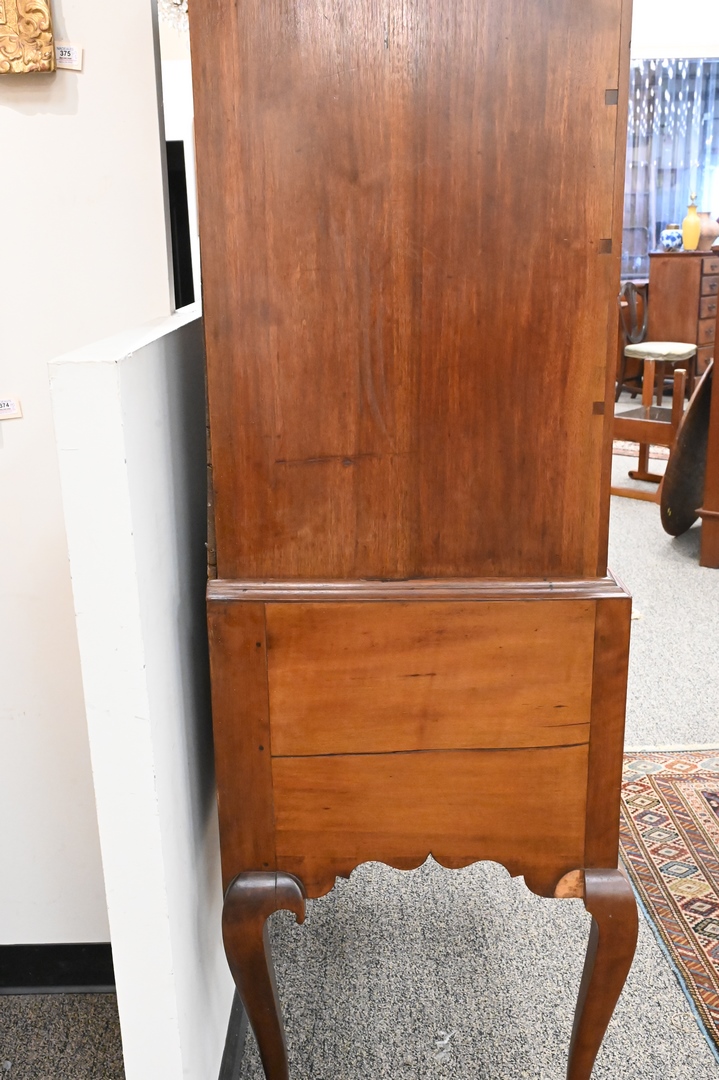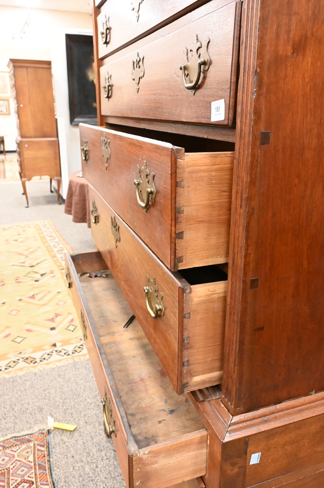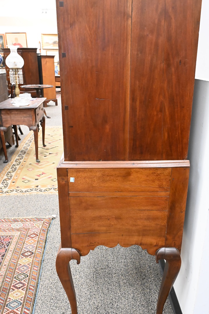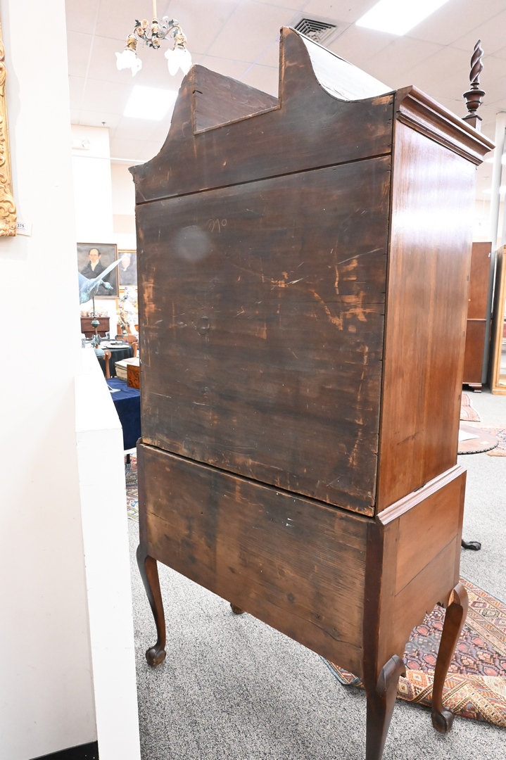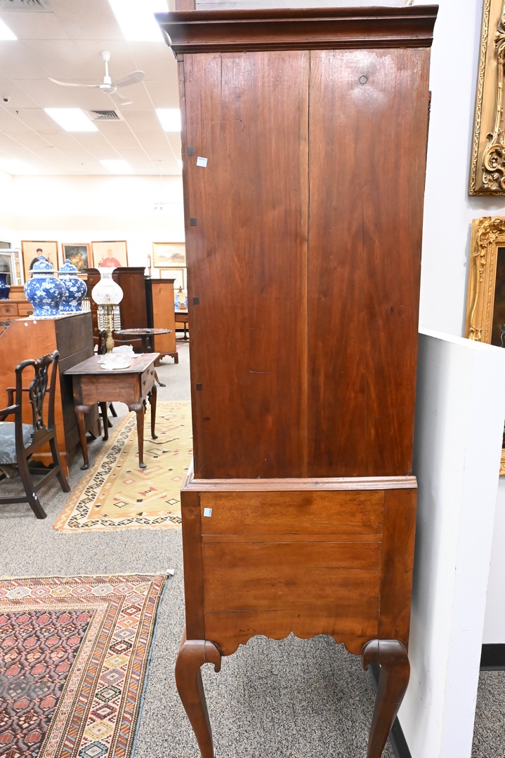 Lot 181: Chippendale Walnut Highboy, in two parts, upper section with bonnet top over three short drawers, over four drawers, having fan carved center drawer, all flanked by fluted pilasters on lower section with one drawer over three drawers, fan carved center drawer, over scalloped skin with carved pinwheels set on cabriole legs, ending in ball and claw feet, height 84 inches, width 37 1/2 inches. Provenance: Estate of Florence Yannios, Cheshire, CT.