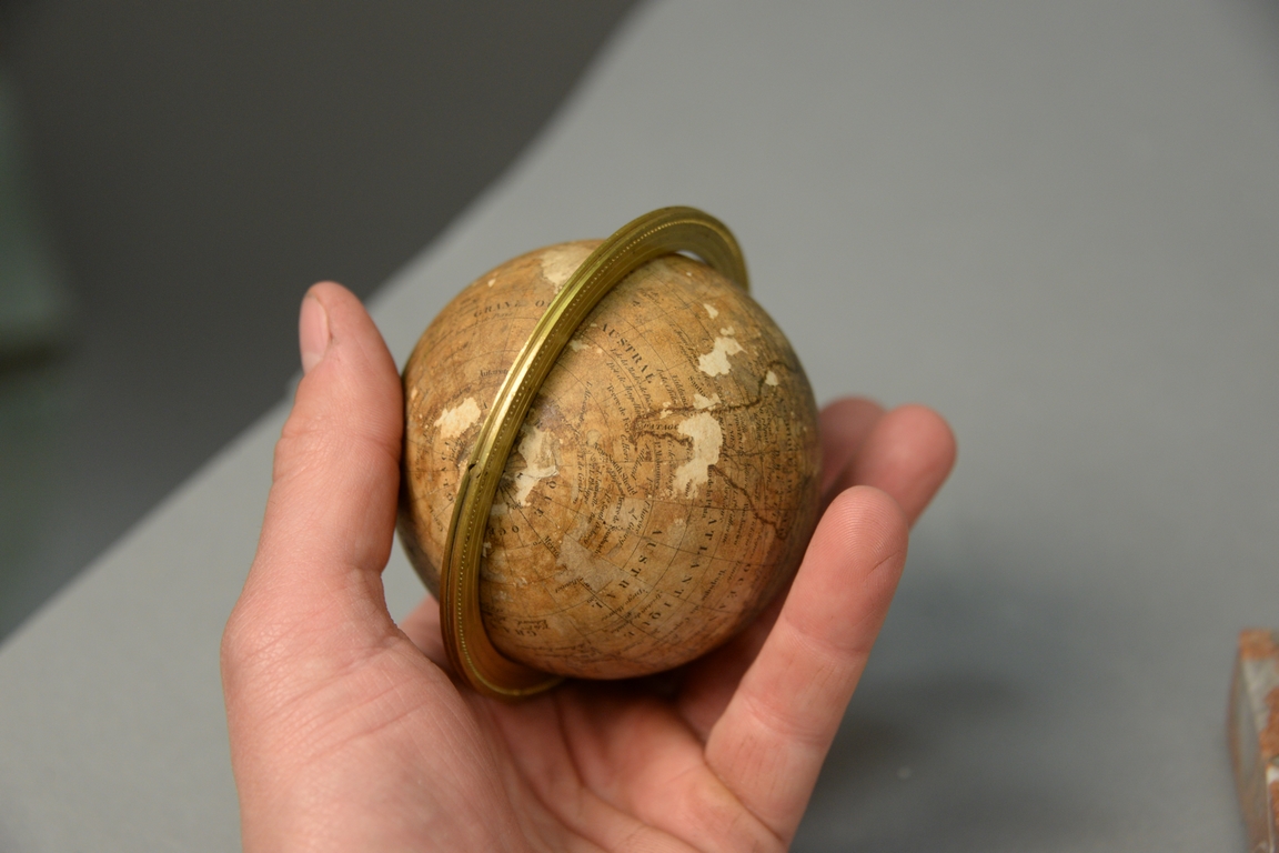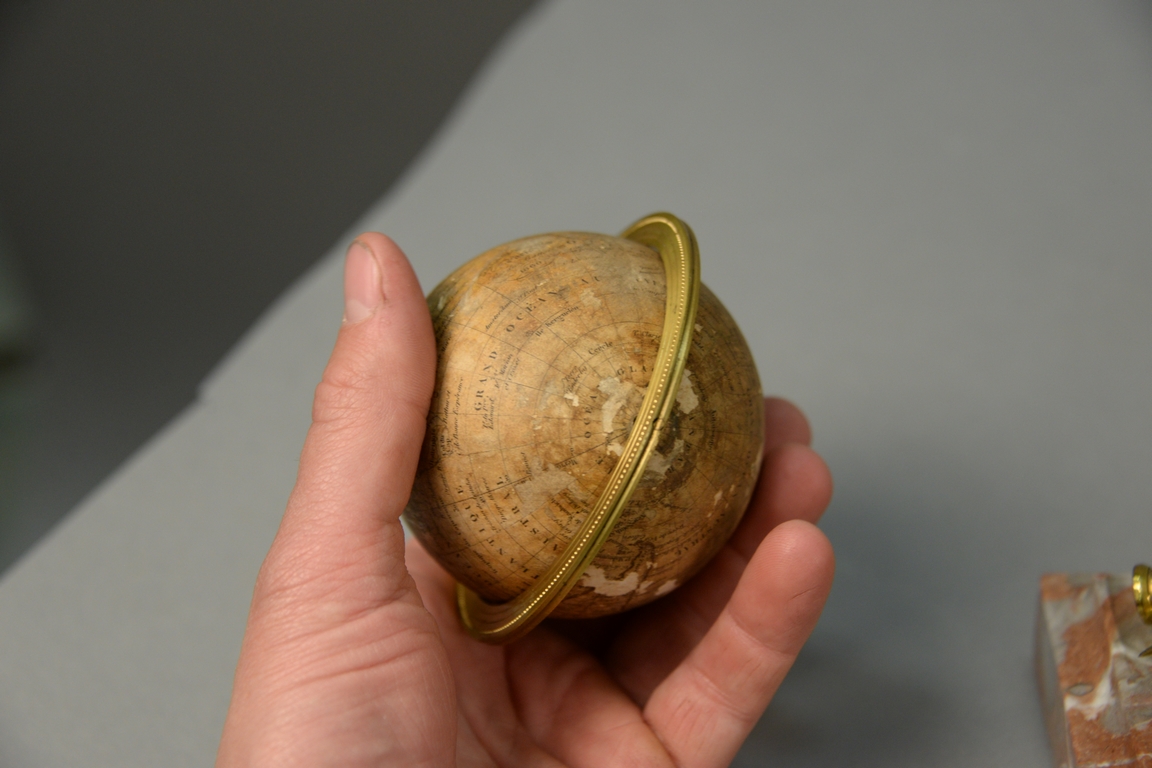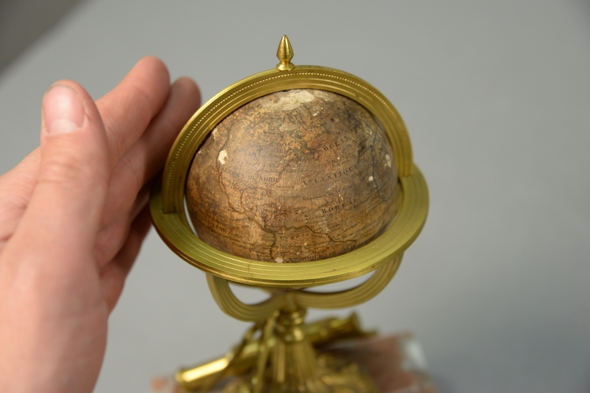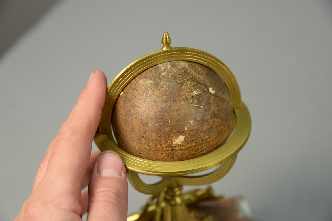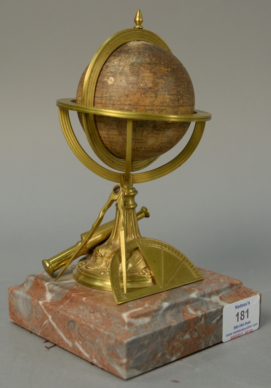 Lot 181: Delamarche 19th century, French Terrestrial or Terrestre small globe dated 1860 on bronze protractor, map, and telescope over roug…