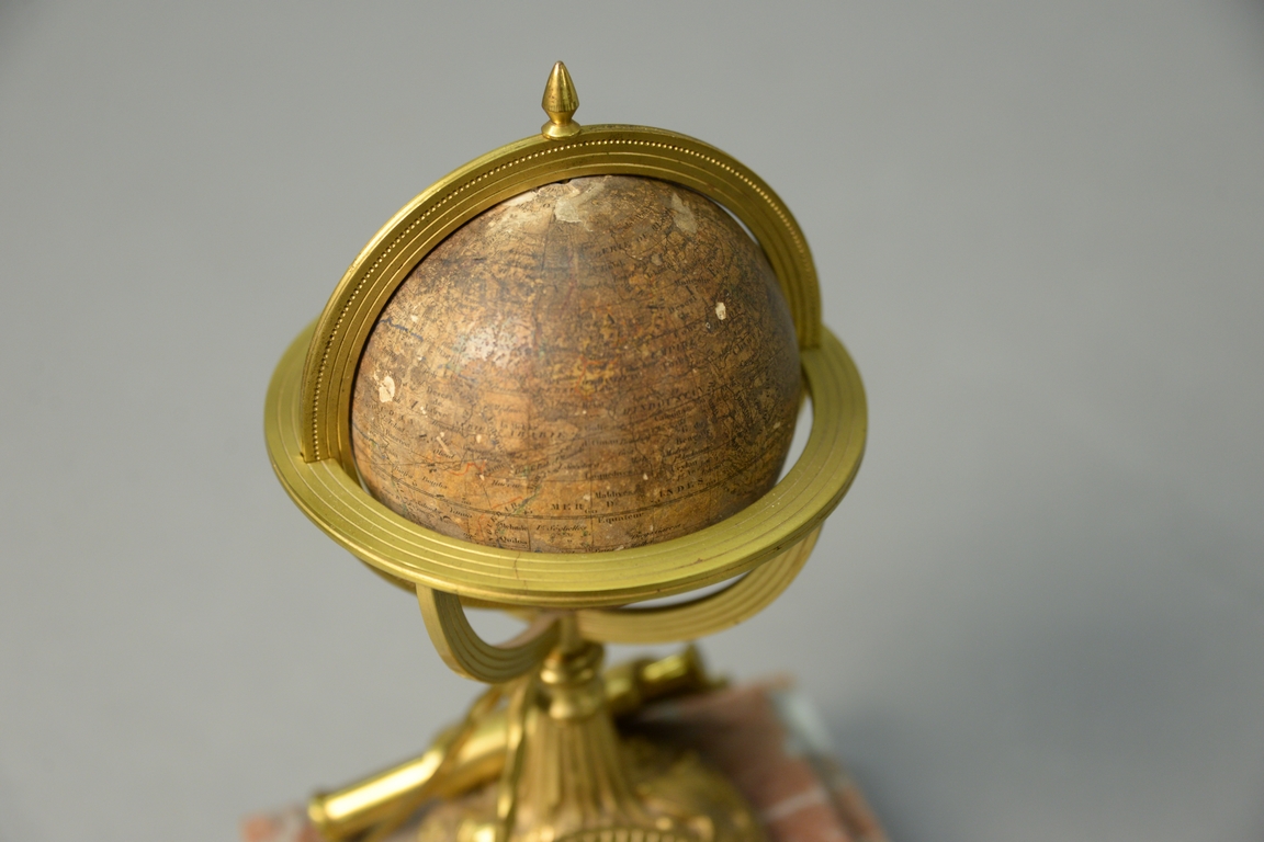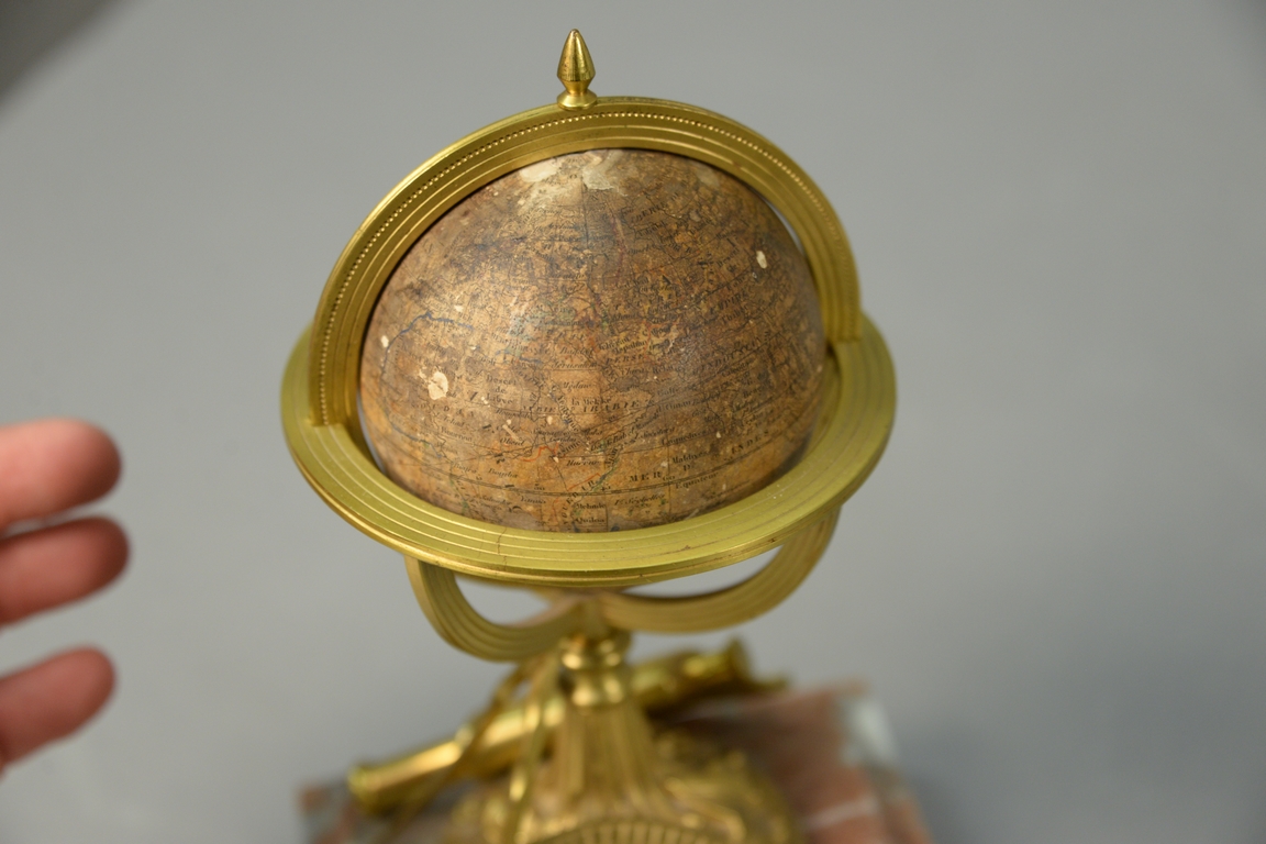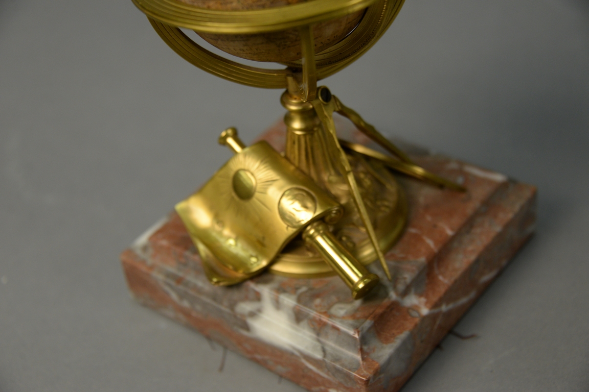 Delamarche 19th century, French Terrestrial or Terrestre small globe dated 1860 on bronze protractor, map, and telescope over rouge marble base, marked Delamarche, Paris Rue Du Battoir. globe dia. 3in., total ht. 8 1/2in.